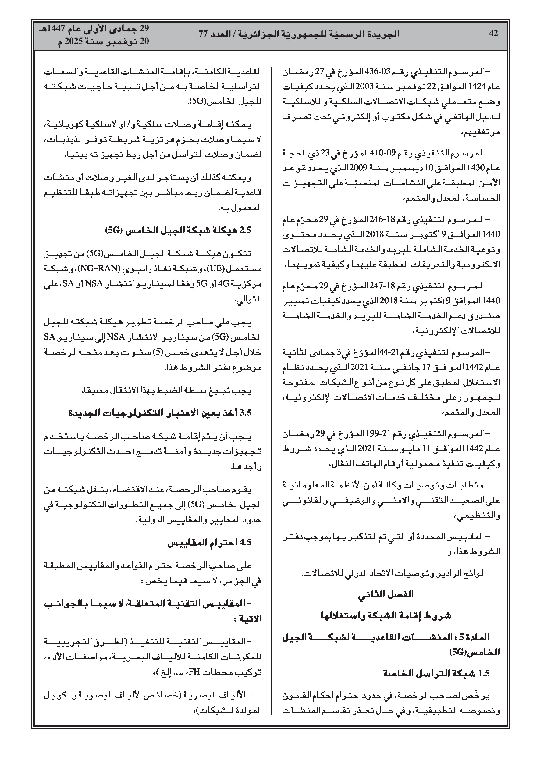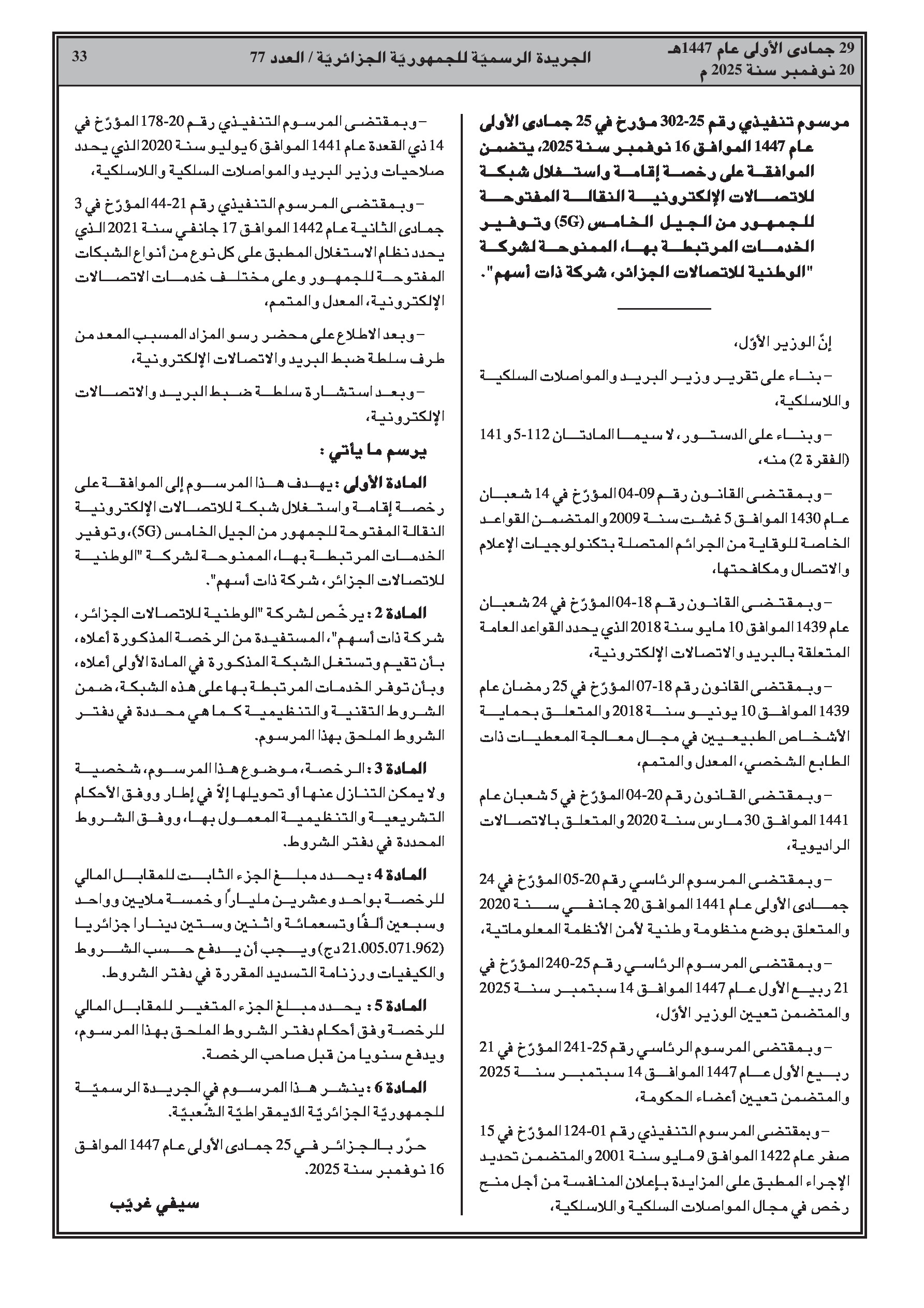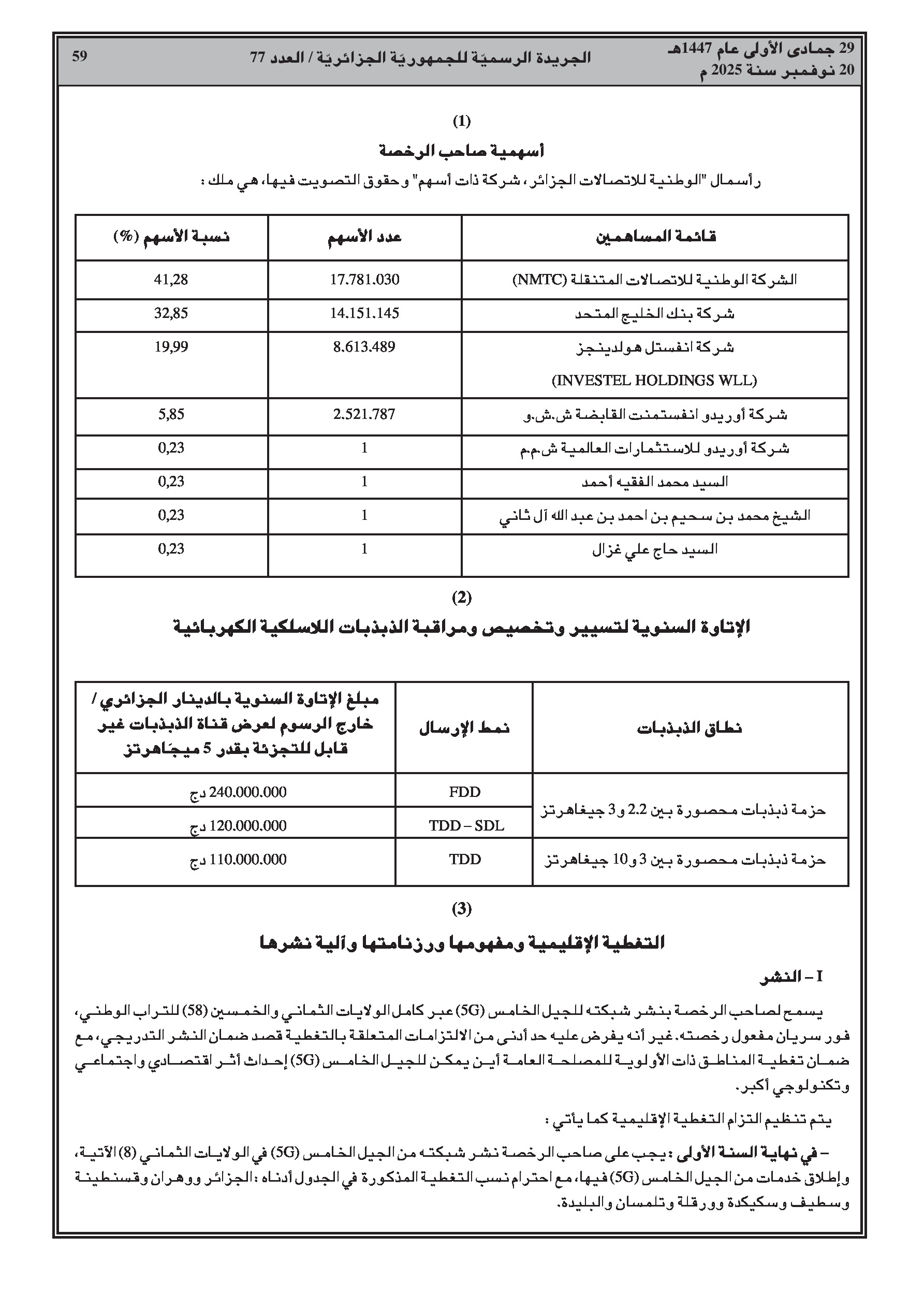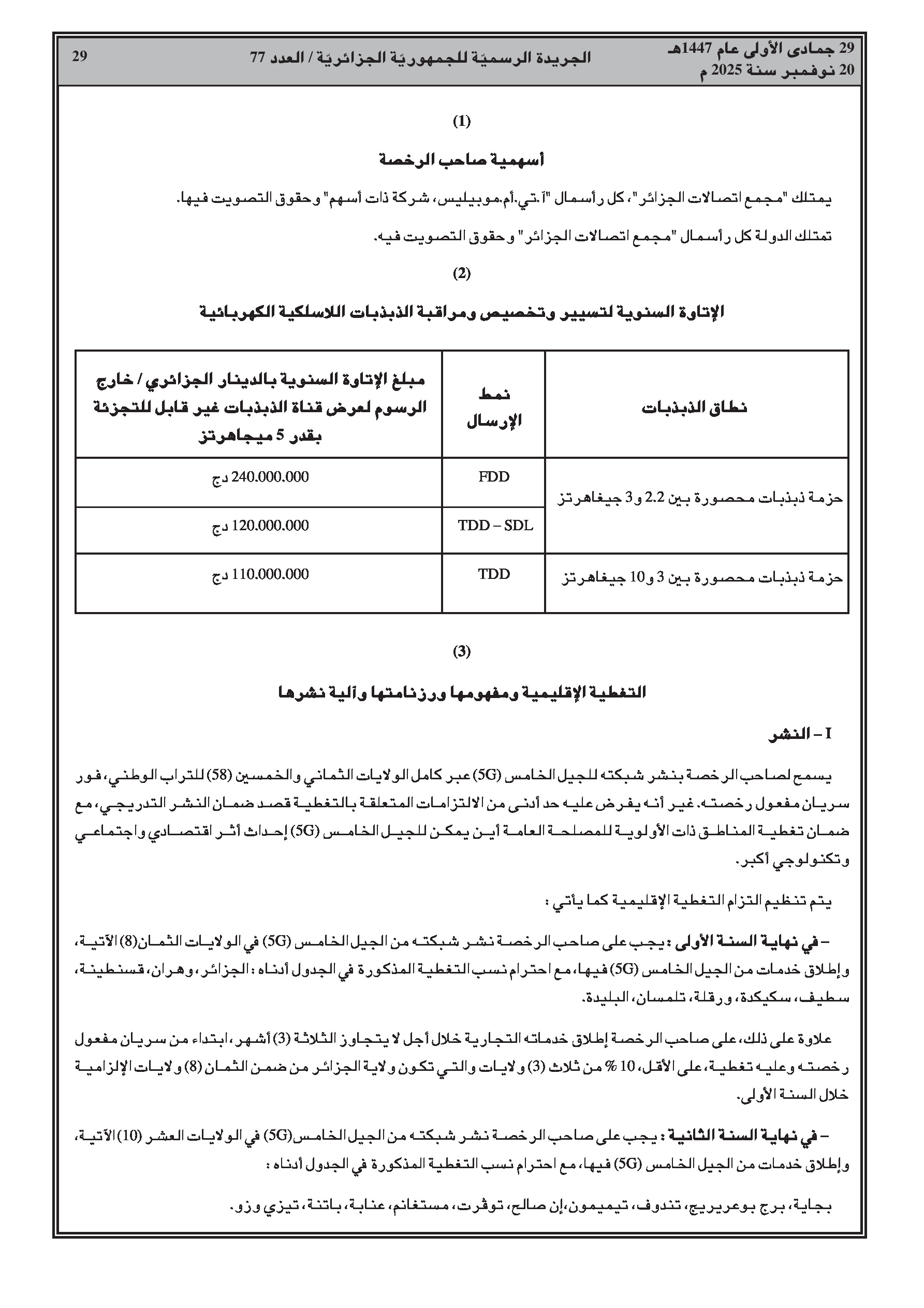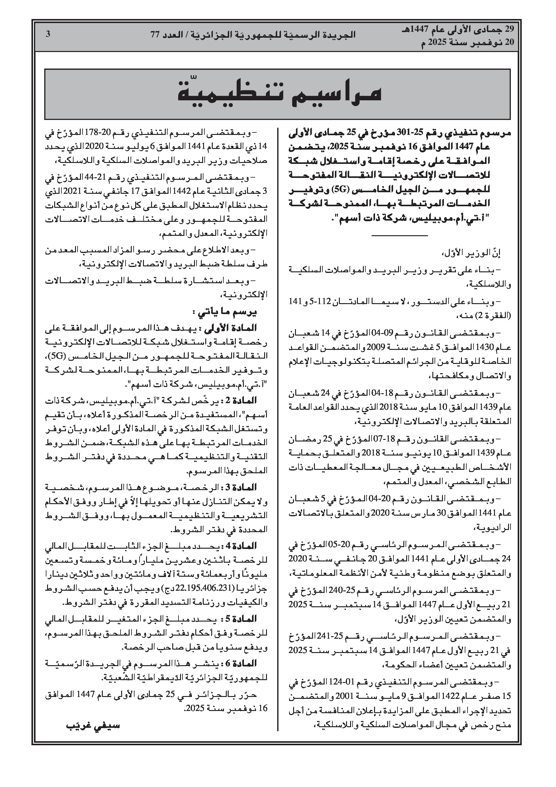 مراسيم تنفيذية توافق على منح تراخيص الجيل الخامس لشركات ATM Mobilis، Wataniya Télécom Algérie (Ooredoo)، و Optimum Télécom Algérie (Djezzy)، محددةً الشروط التقنية، المالية، ونطاق التغطية.