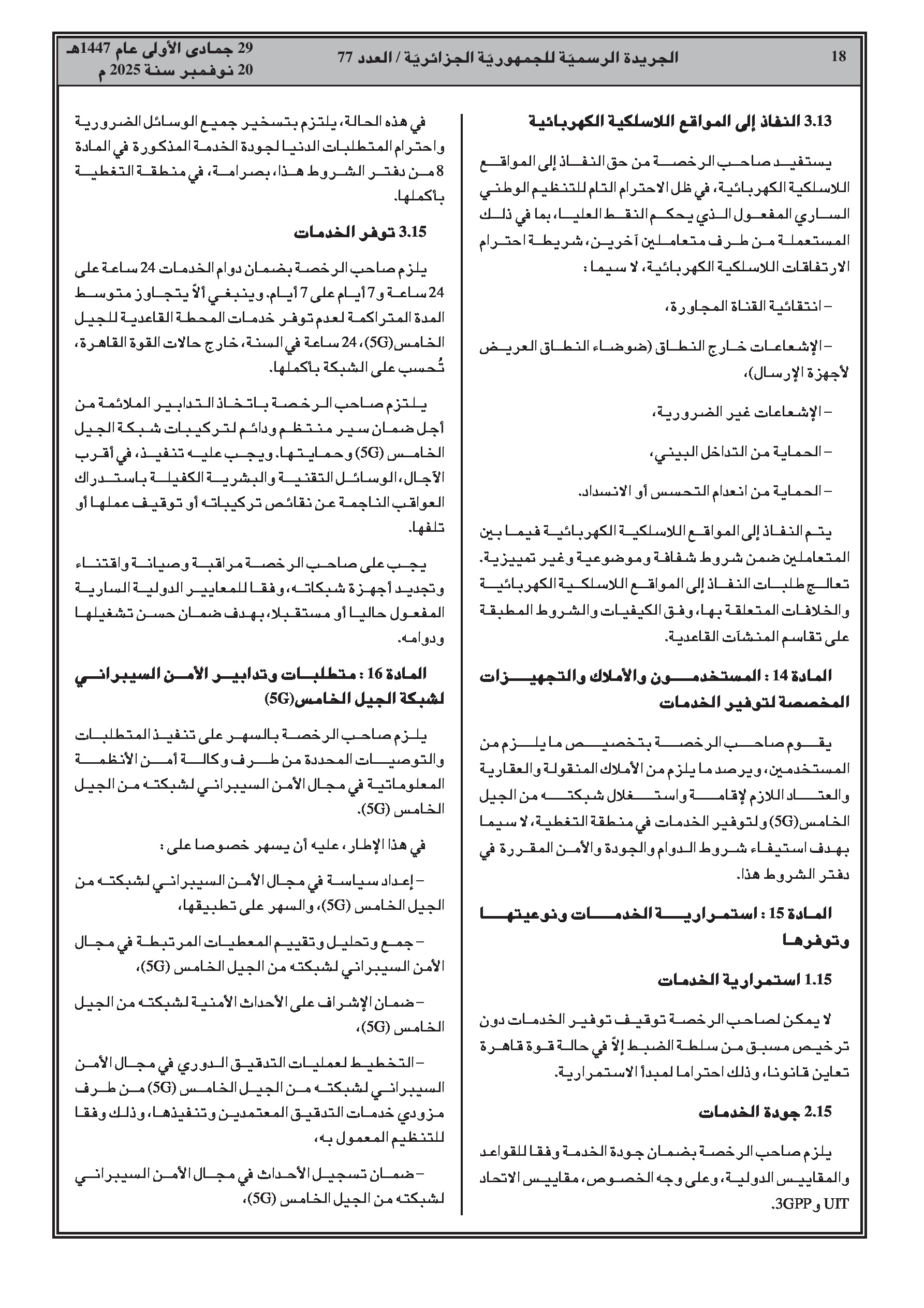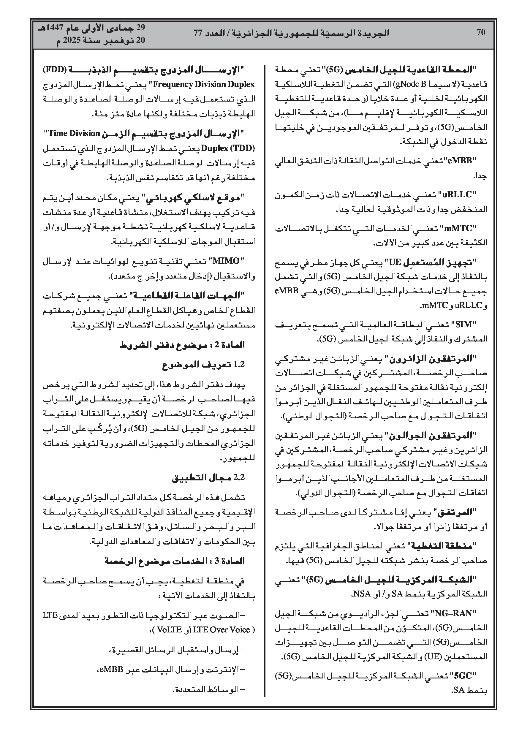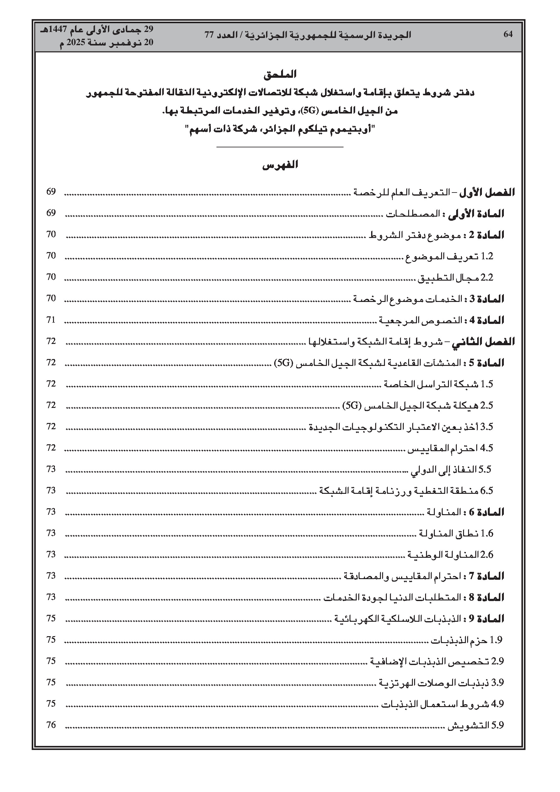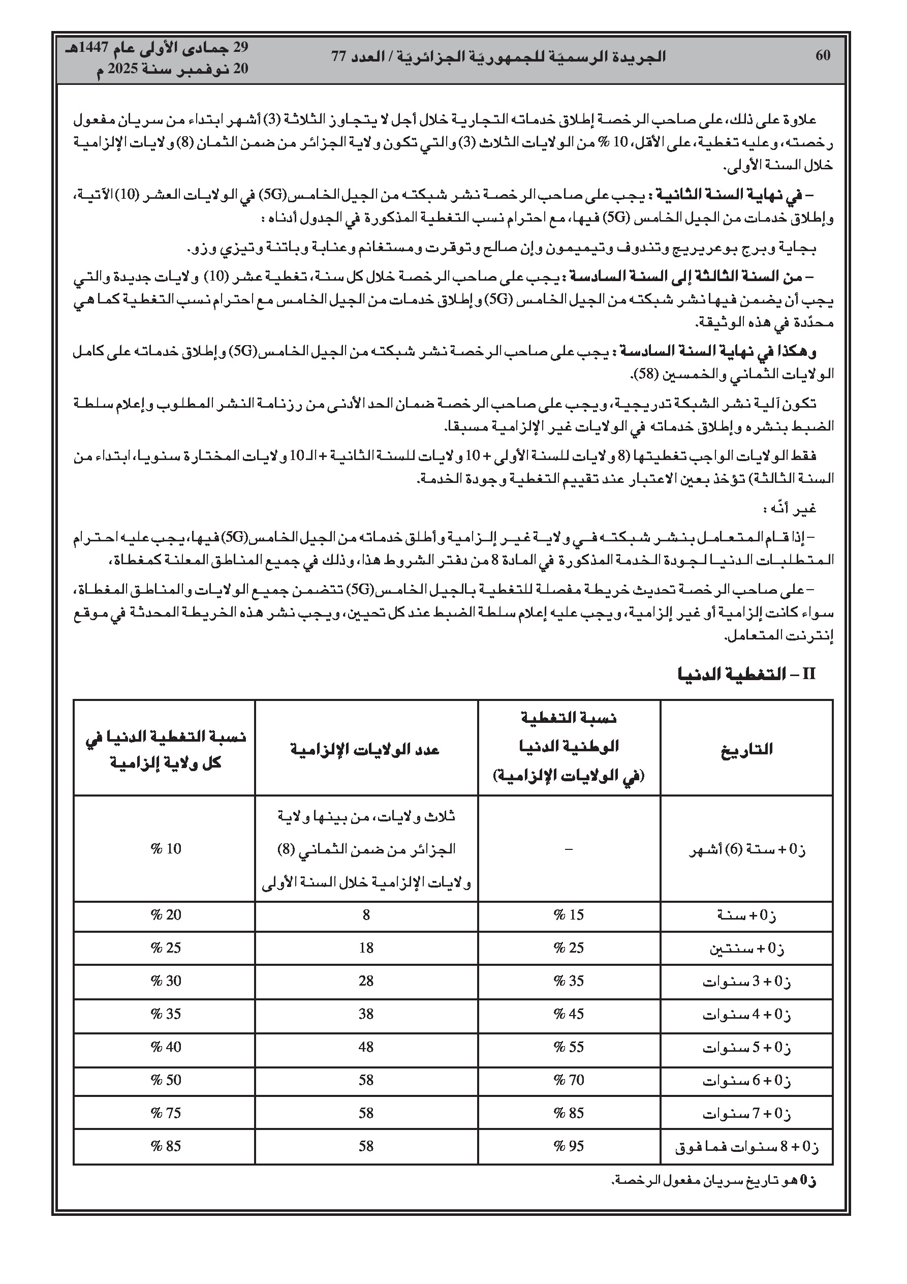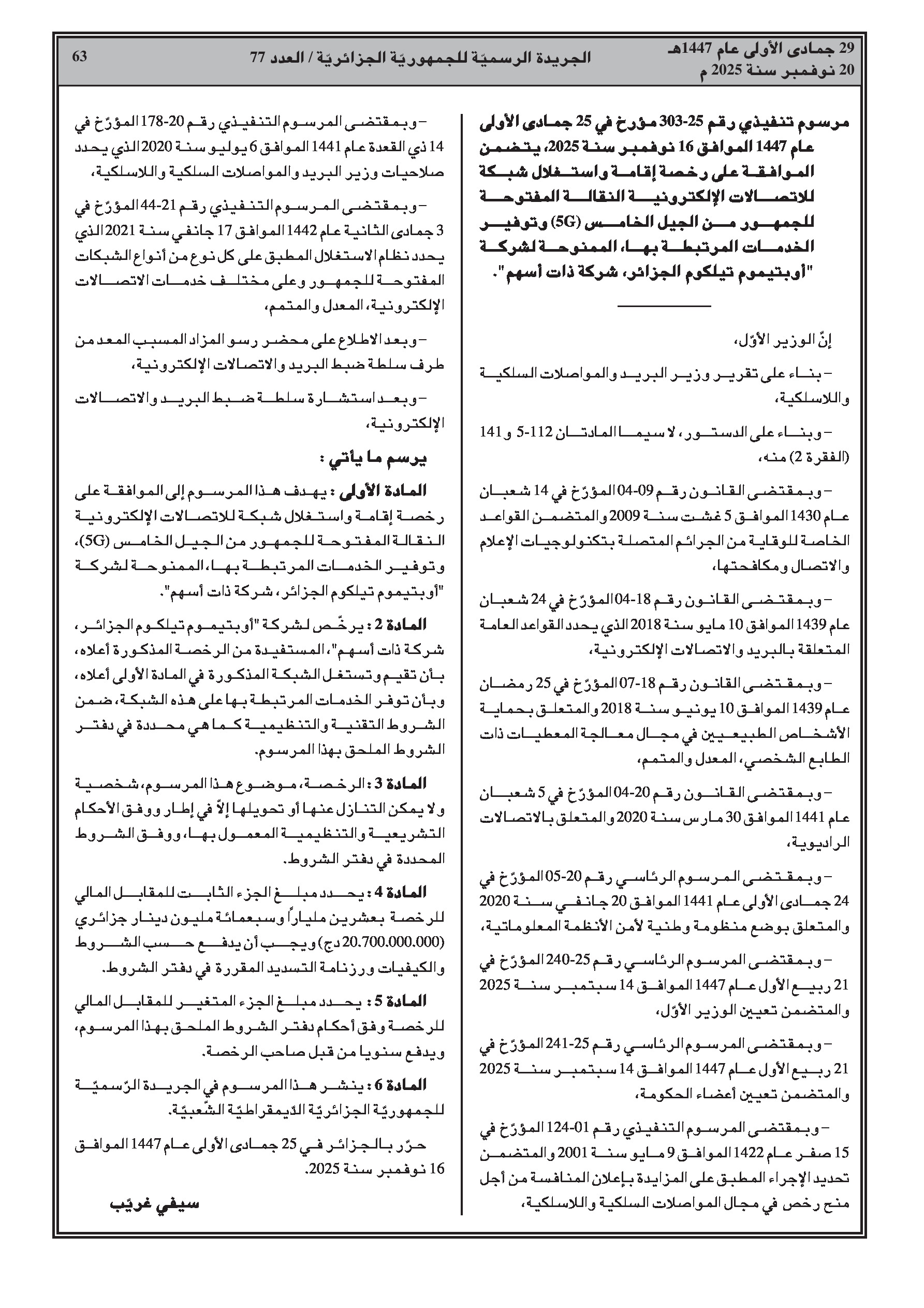 مراسيم تنفيذية توافق على منح تراخيص الجيل الخامس لشركات ATM Mobilis، Wataniya Télécom Algérie (Ooredoo)، و Optimum Télécom Algérie (Djezzy)، محددةً الشروط التقنية، المالية، ونطاق التغطية.