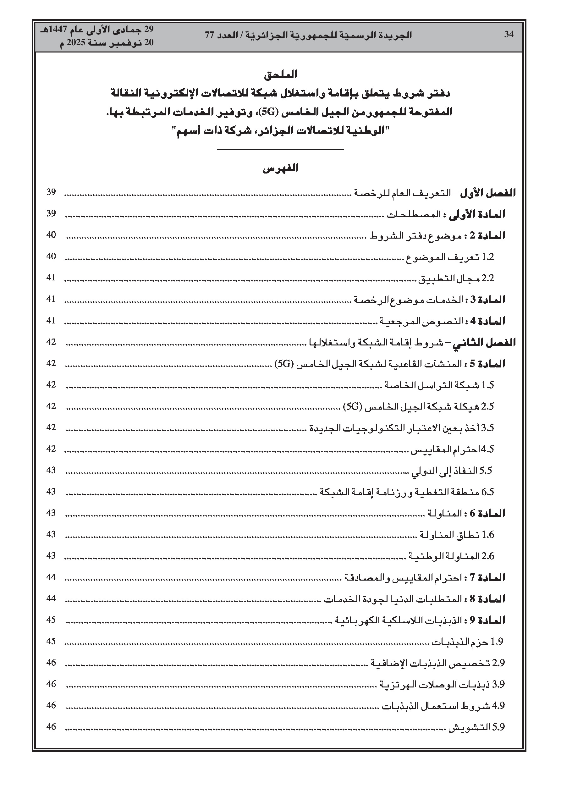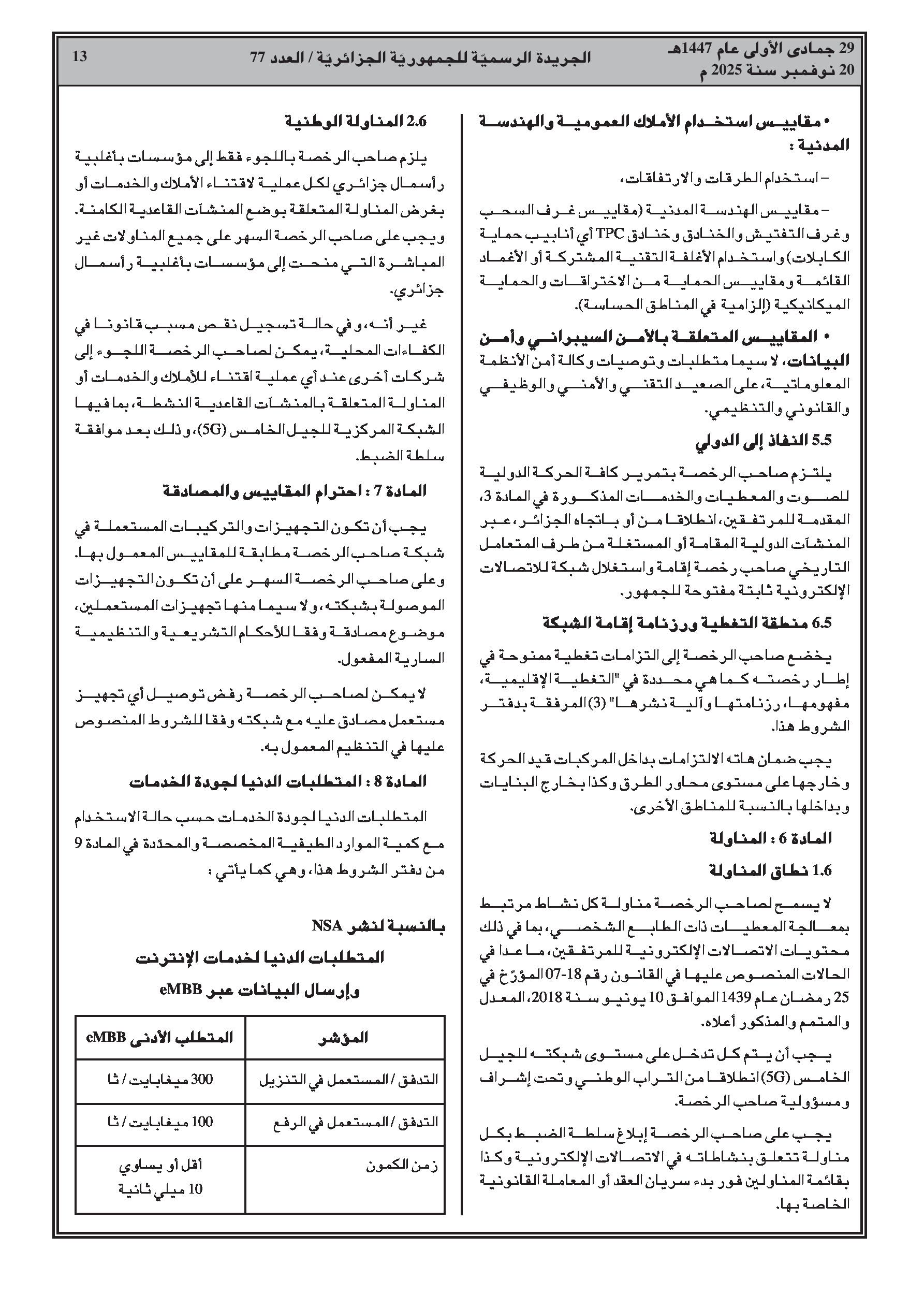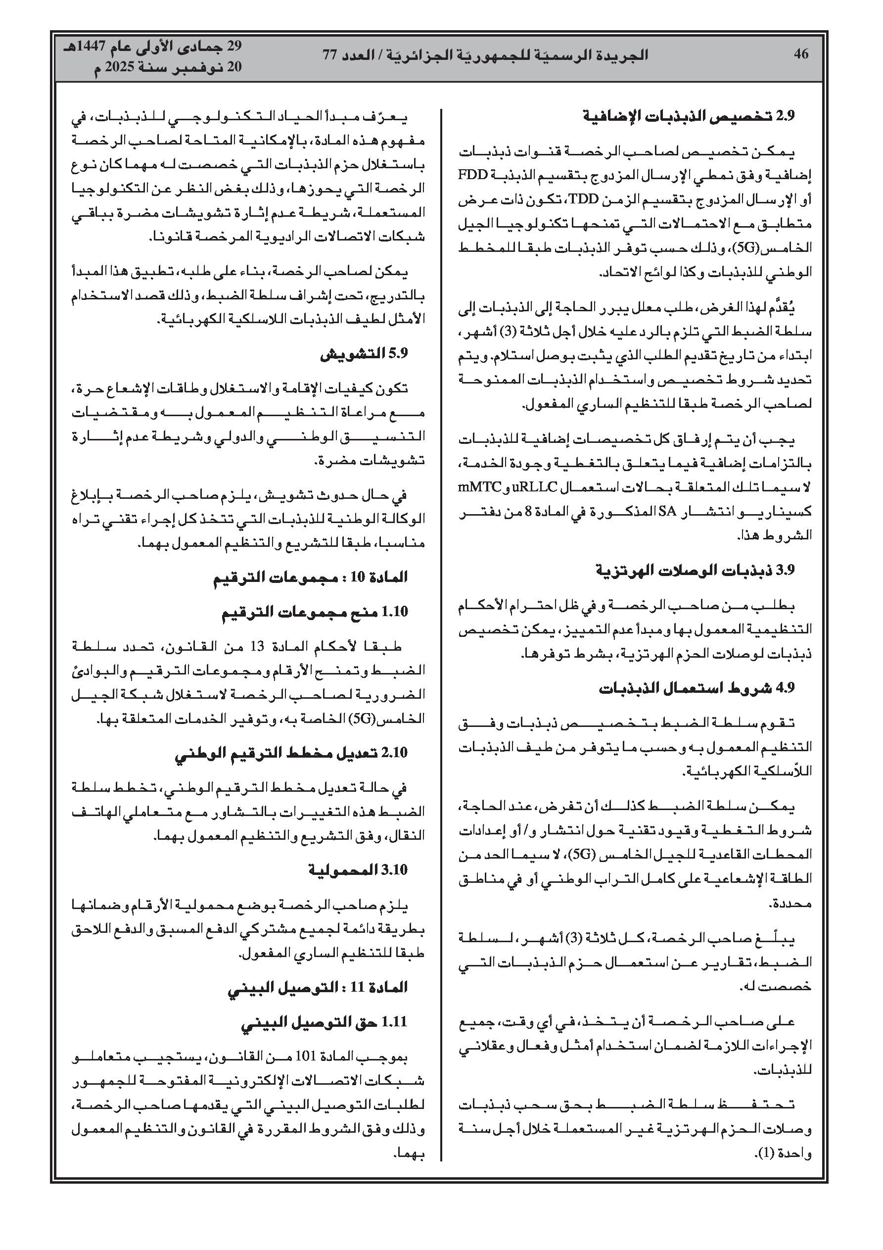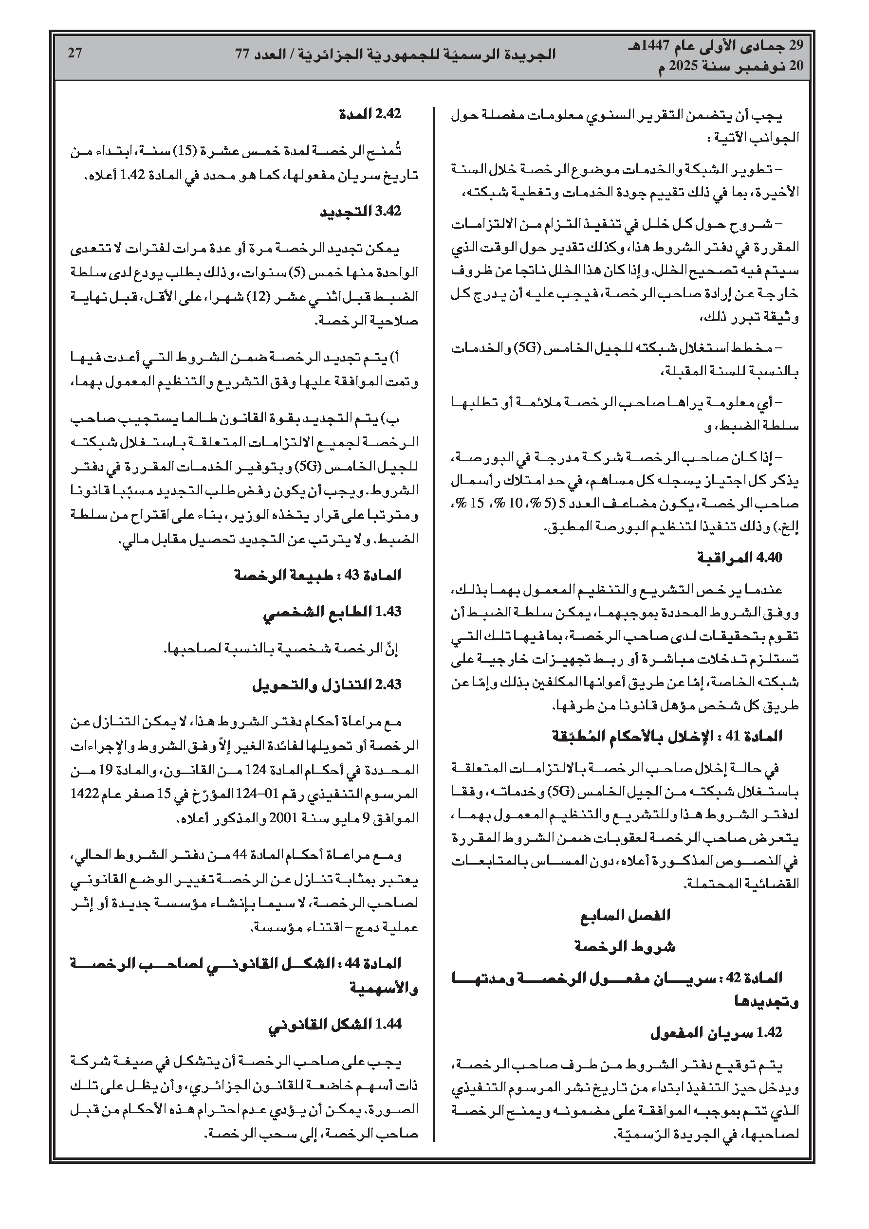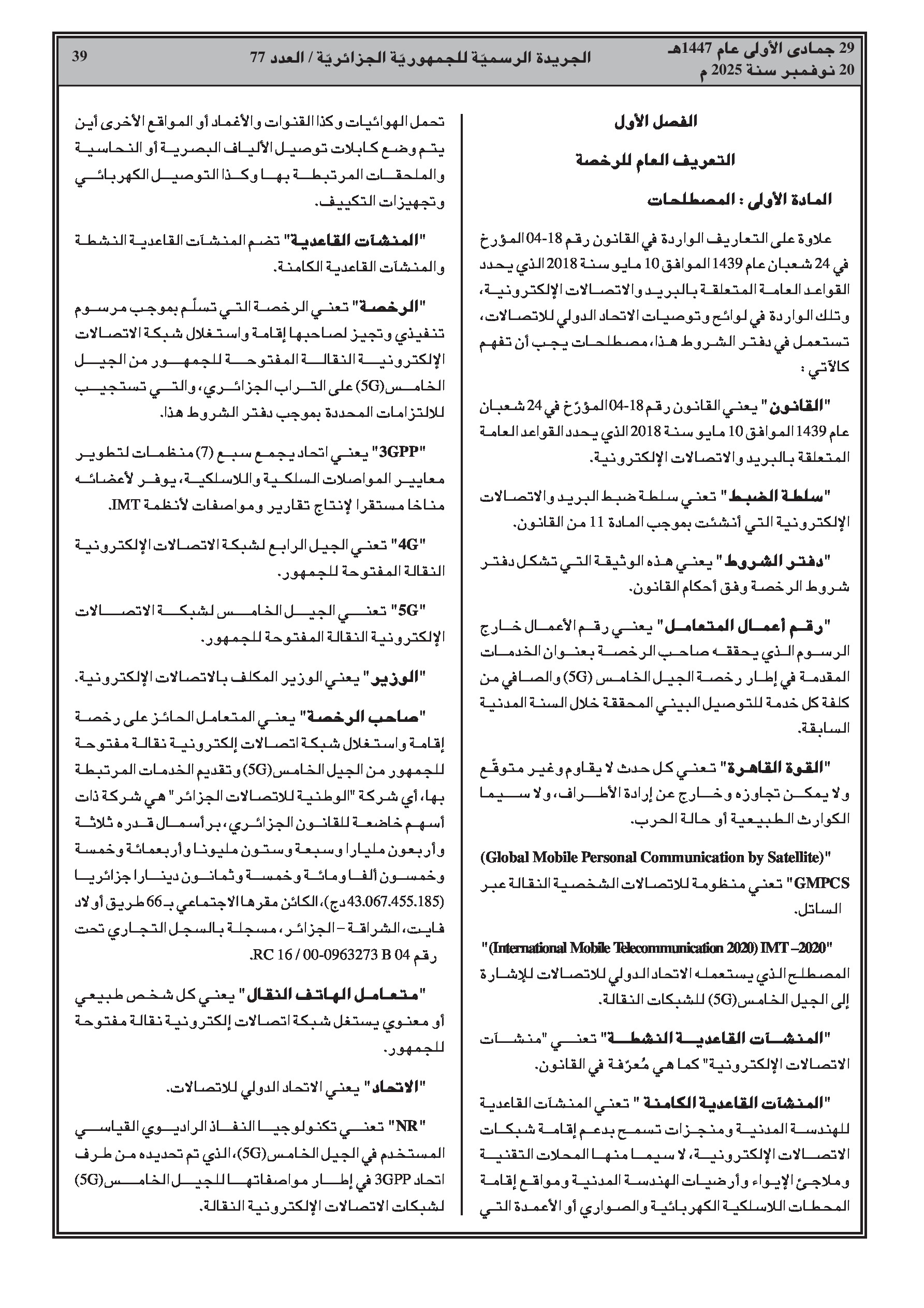مراسيم تنفيذية توافق على منح تراخيص الجيل الخامس لشركات ATM Mobilis، Wataniya Télécom Algérie (Ooredoo)، و Optimum Télécom Algérie (Djezzy)، محددةً الشروط التقنية، المالية، ونطاق التغطية.