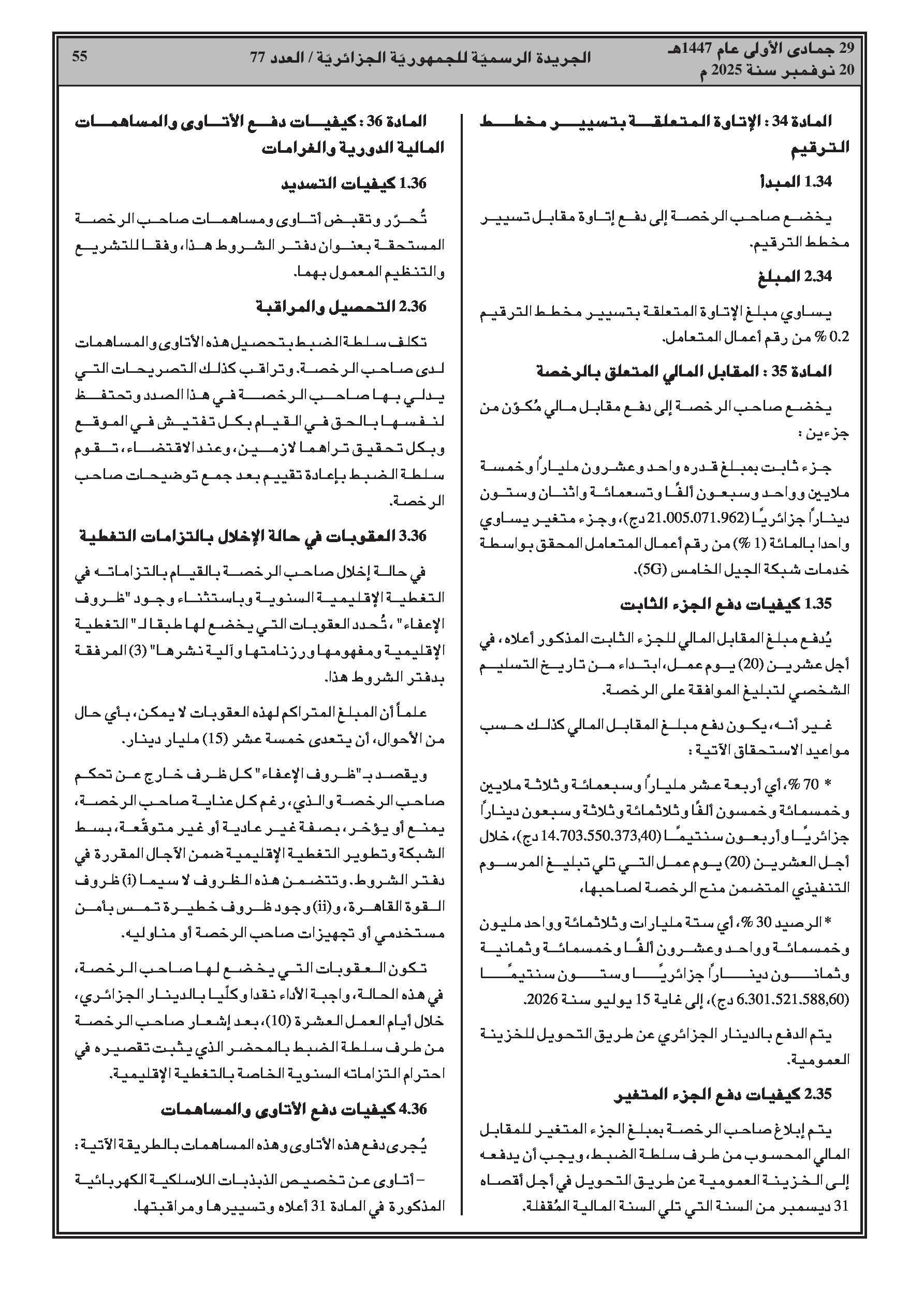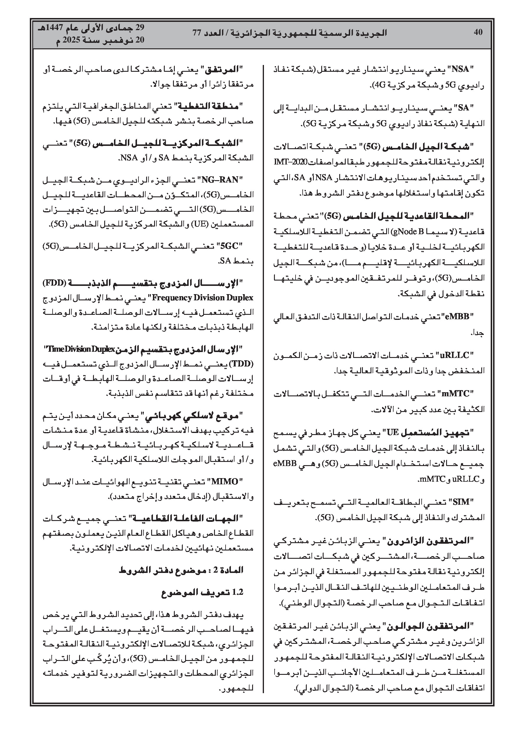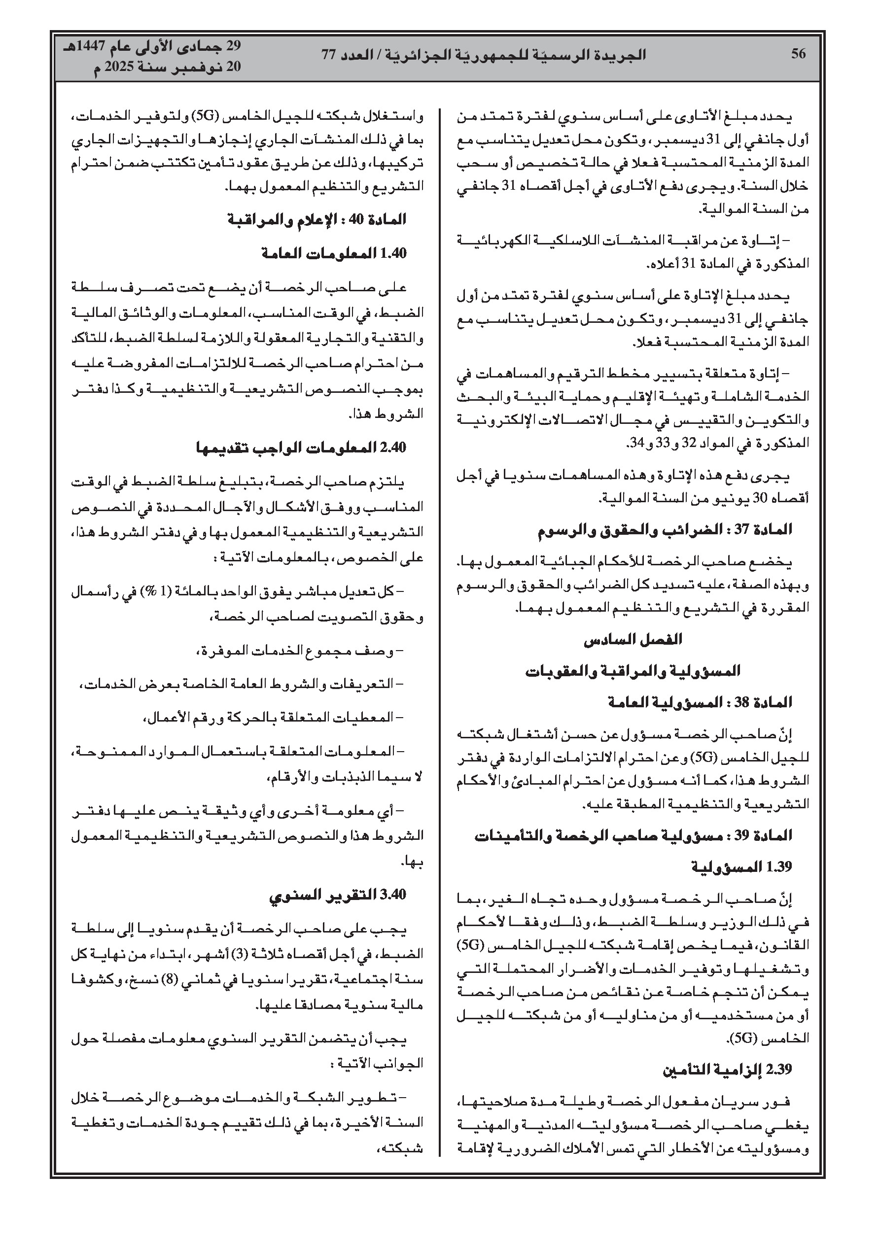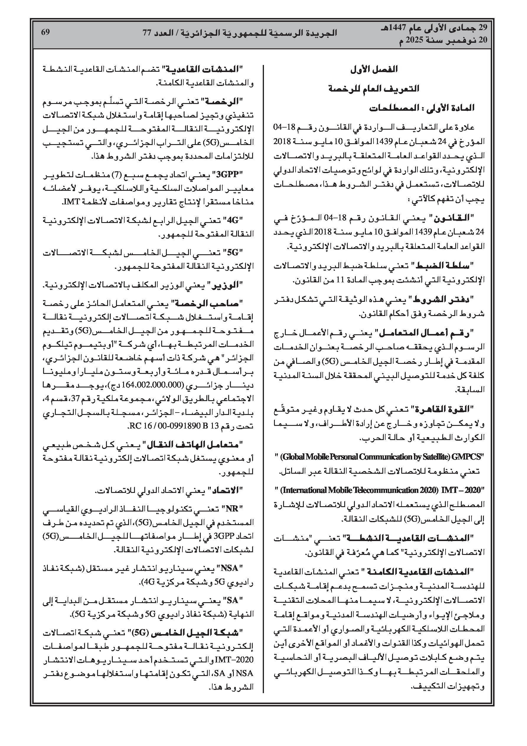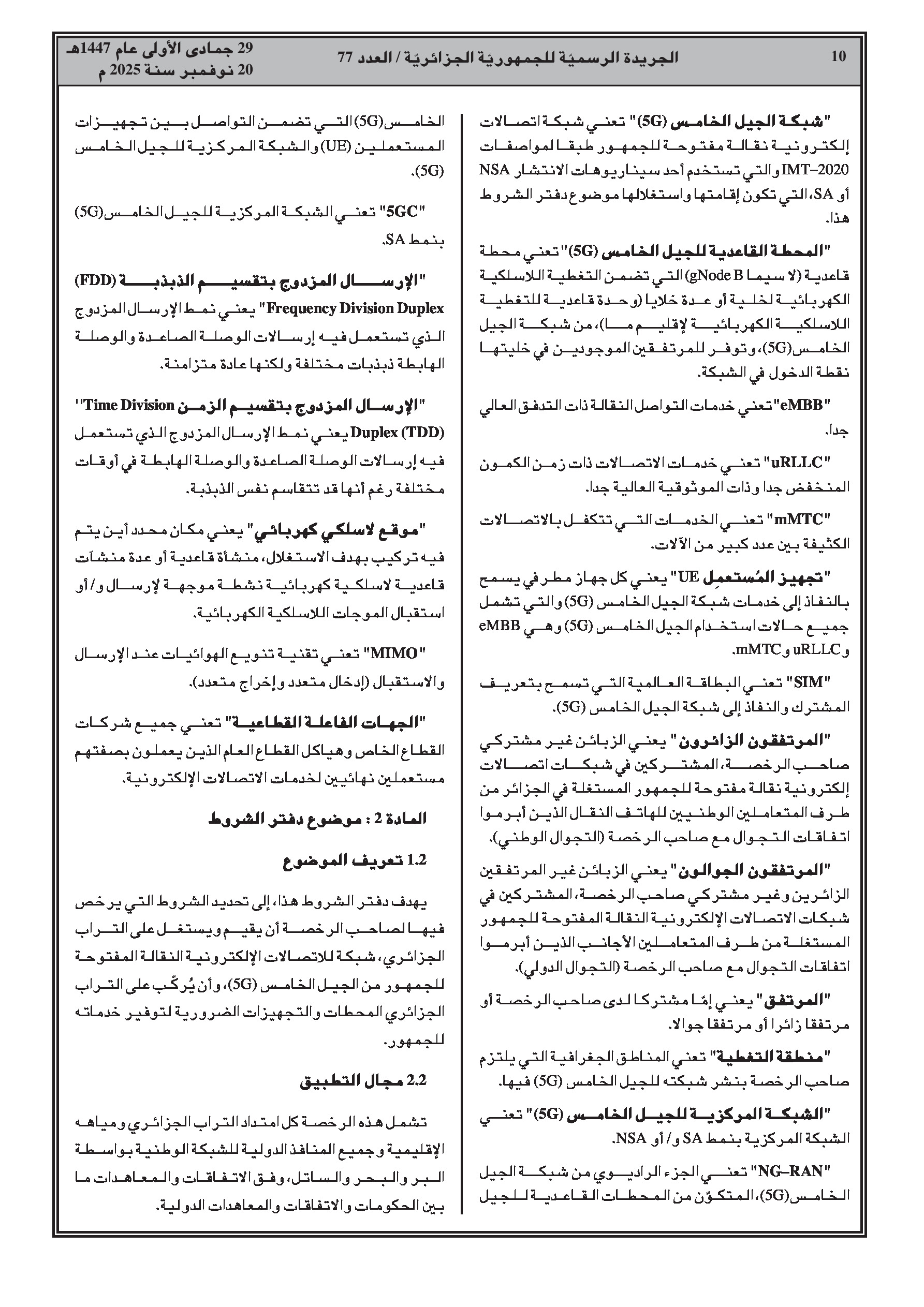 مراسيم تنفيذية توافق على منح تراخيص الجيل الخامس لشركات ATM Mobilis، Wataniya Télécom Algérie (Ooredoo)، و Optimum Télécom Algérie (Djezzy)، محددةً الشروط التقنية، المالية، ونطاق التغطية.