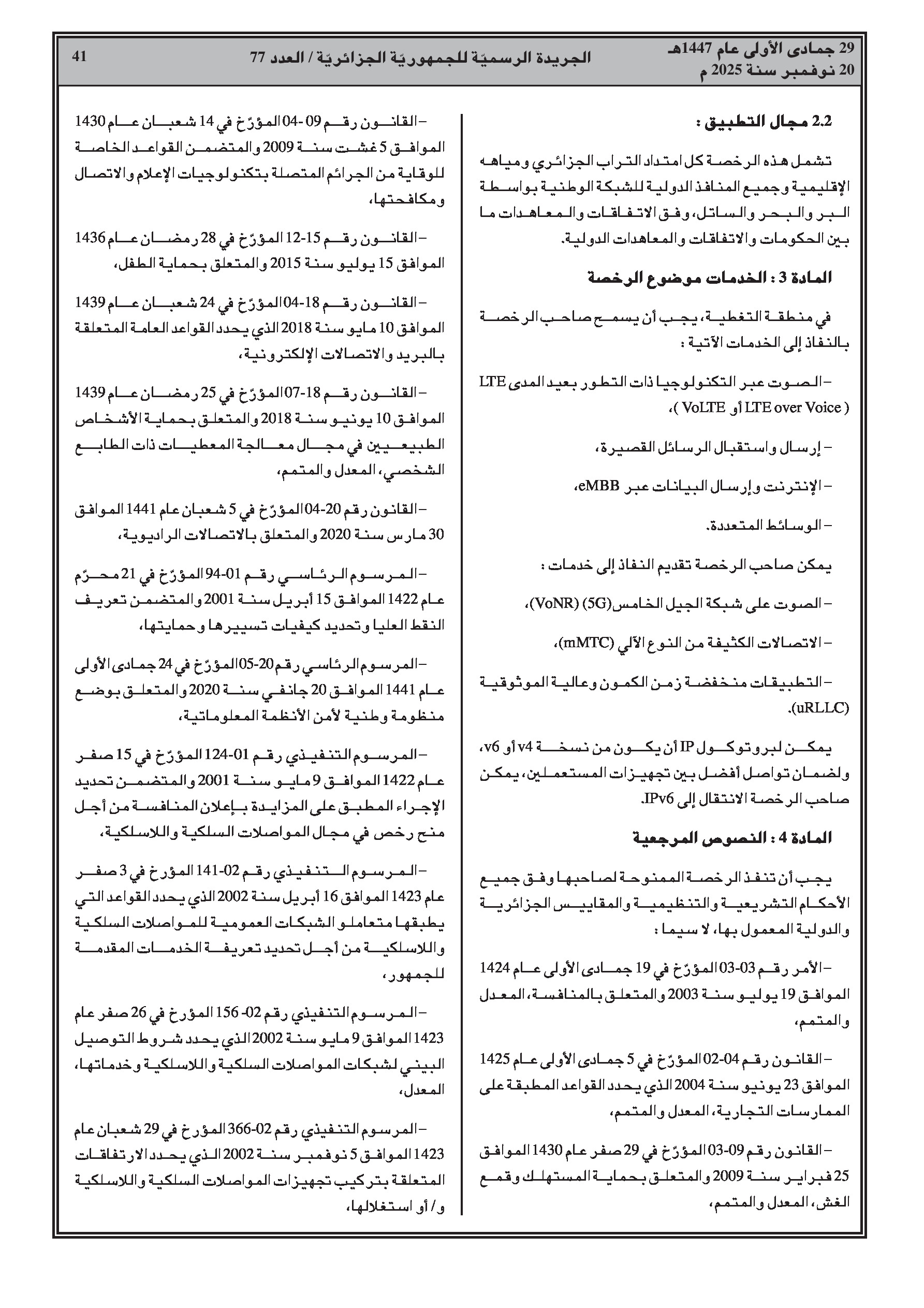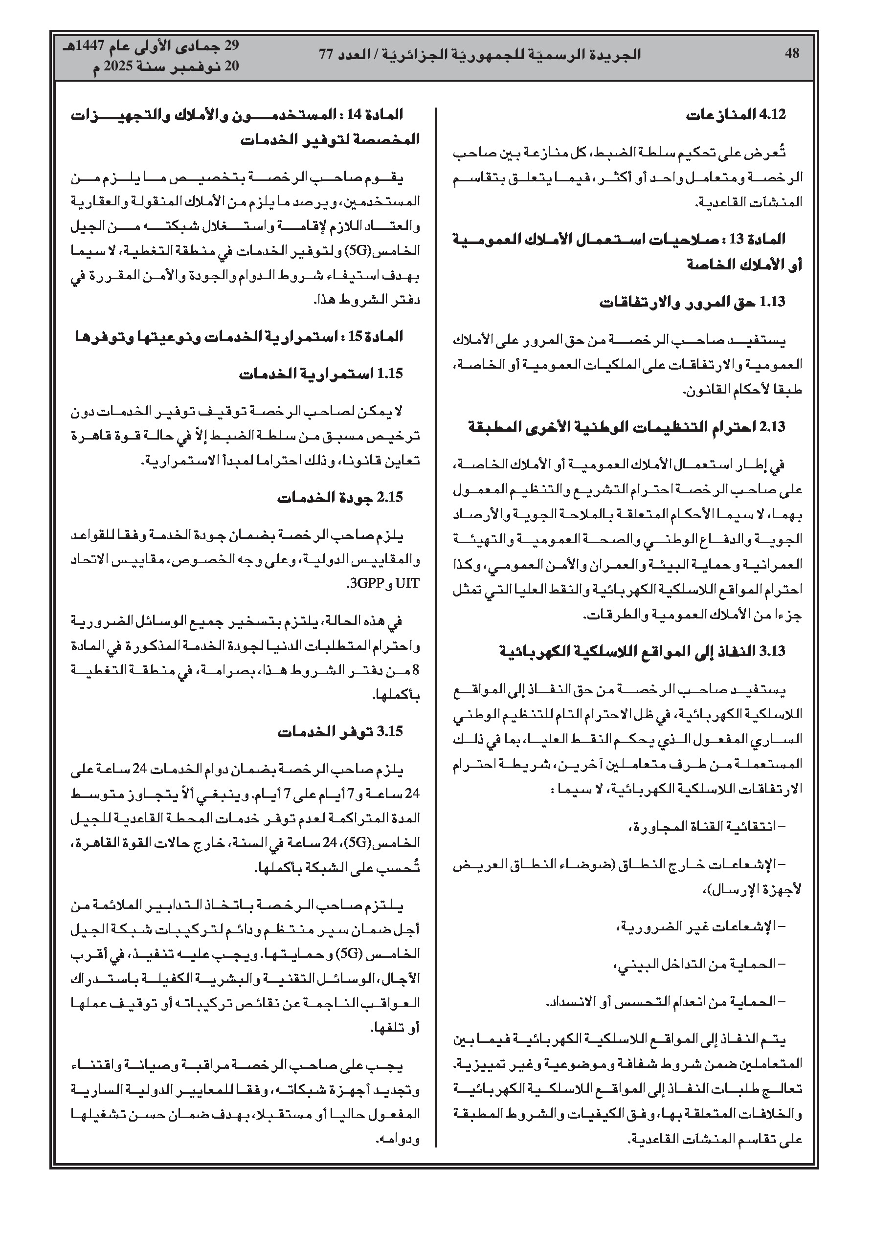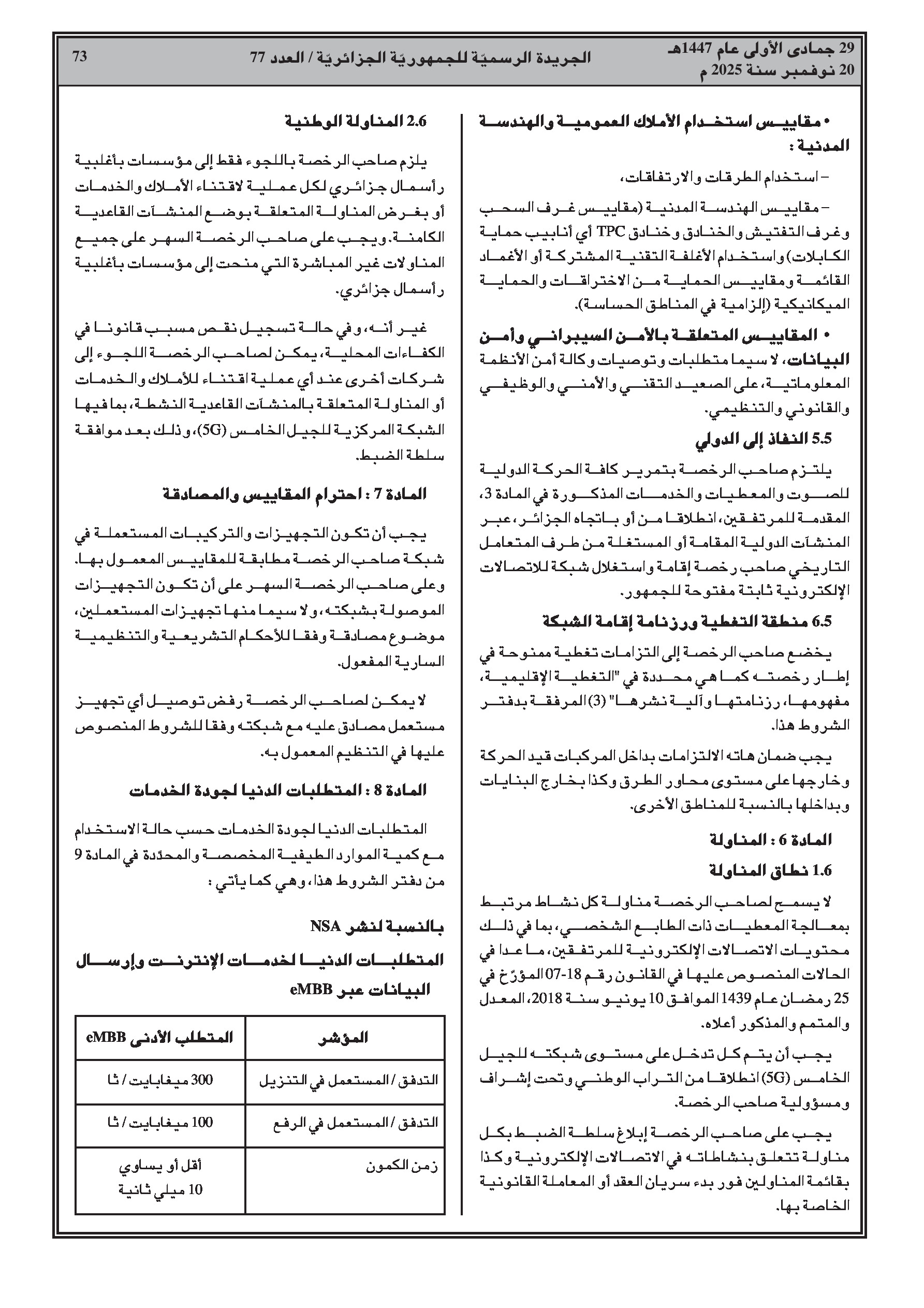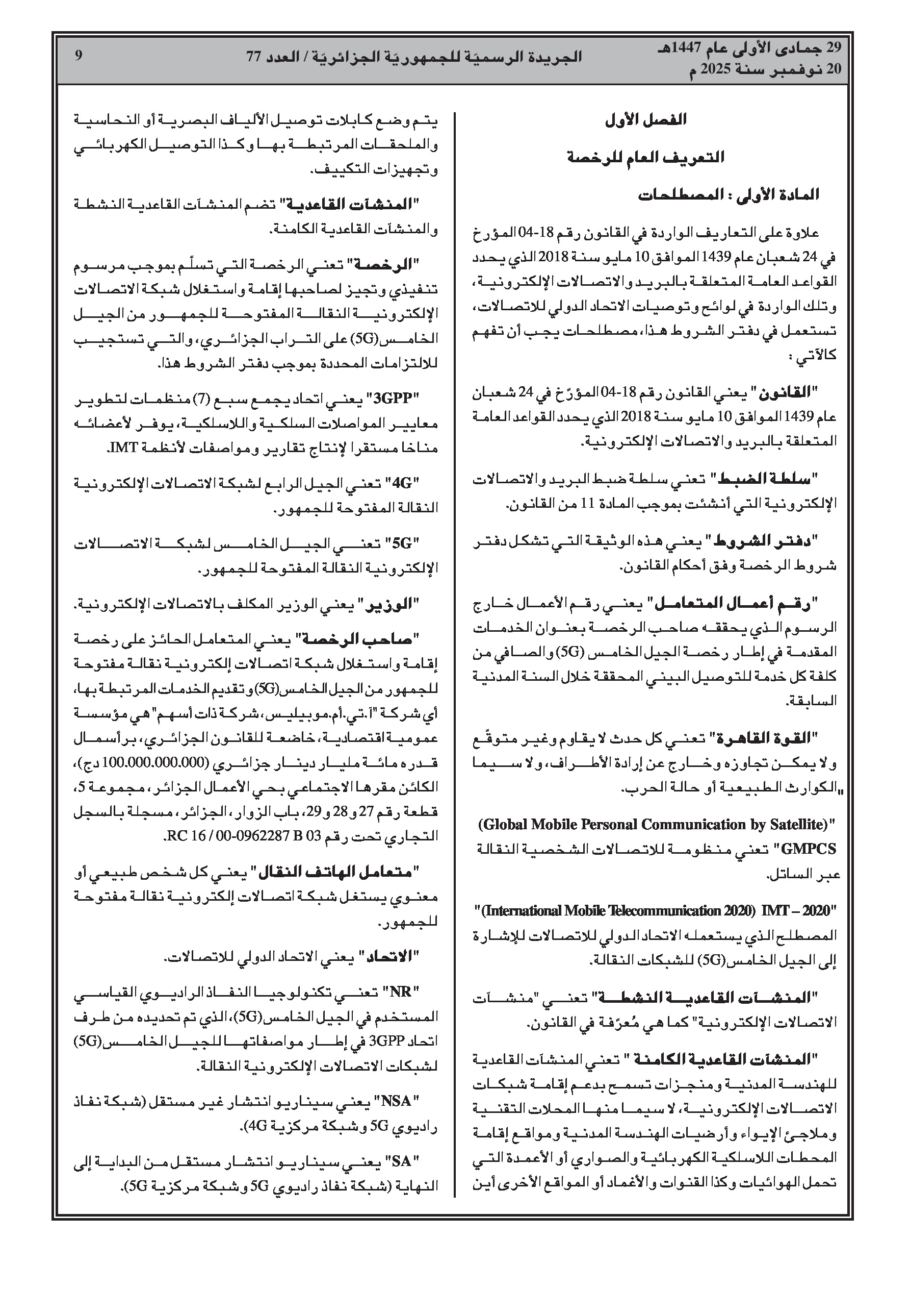مراسيم تنفيذية توافق على منح تراخيص الجيل الخامس لشركات ATM Mobilis، Wataniya Télécom Algérie (Ooredoo)، و Optimum Télécom Algérie (Djezzy)، محددةً الشروط التقنية، المالية، ونطاق التغطية.