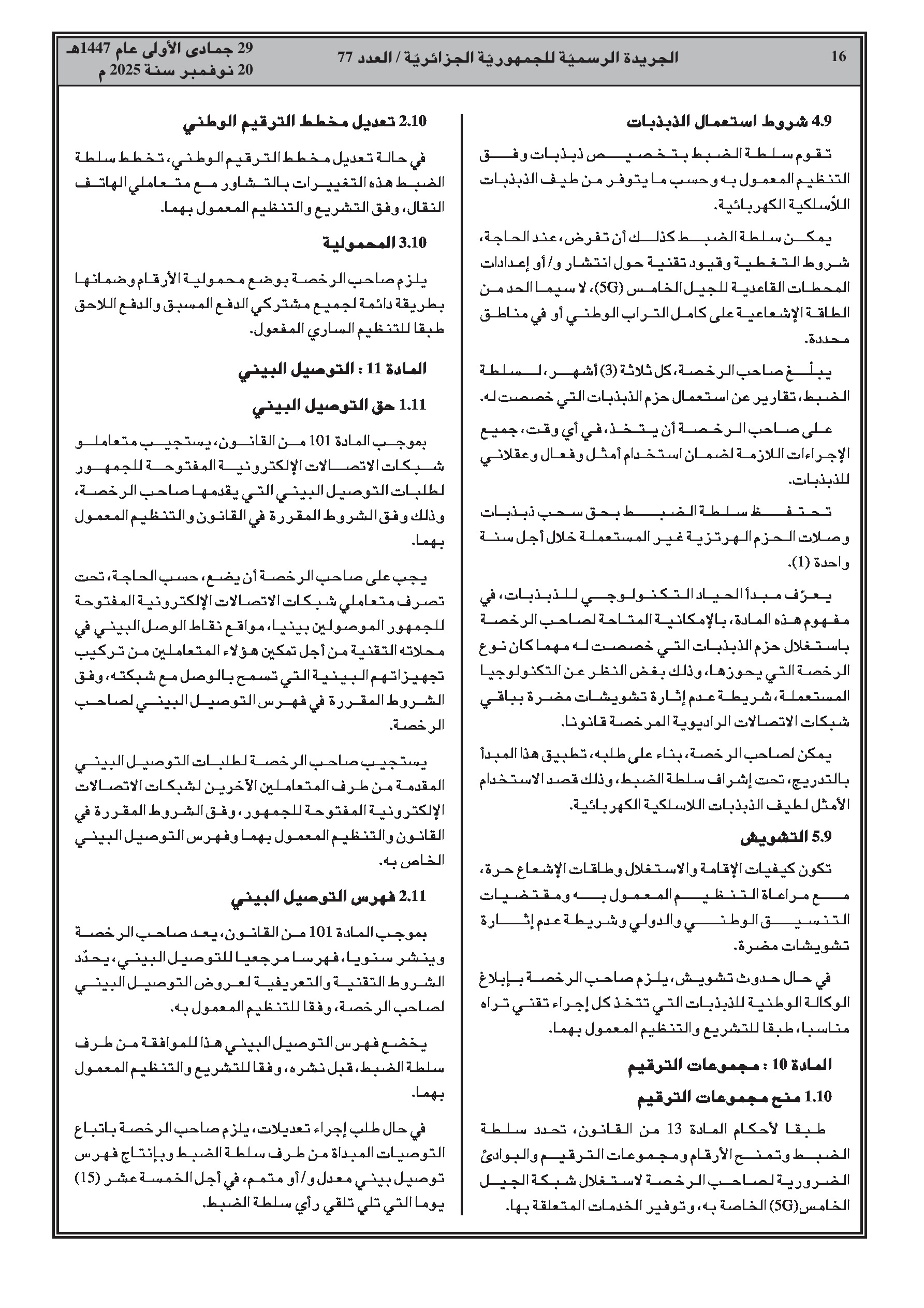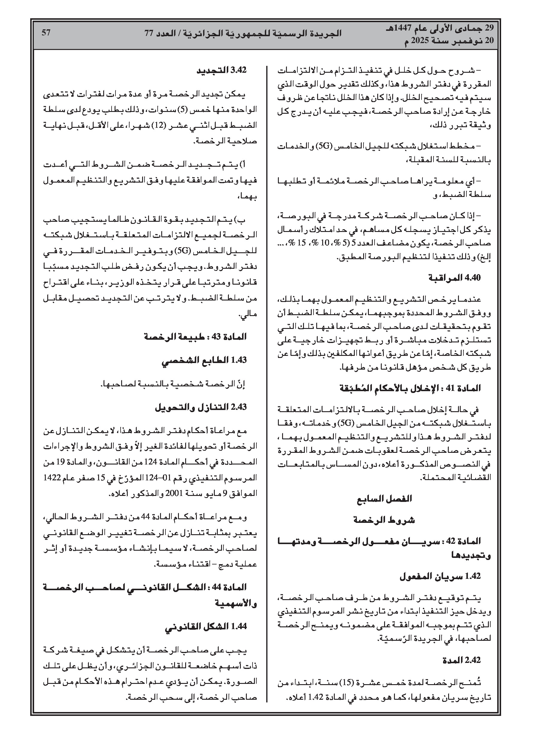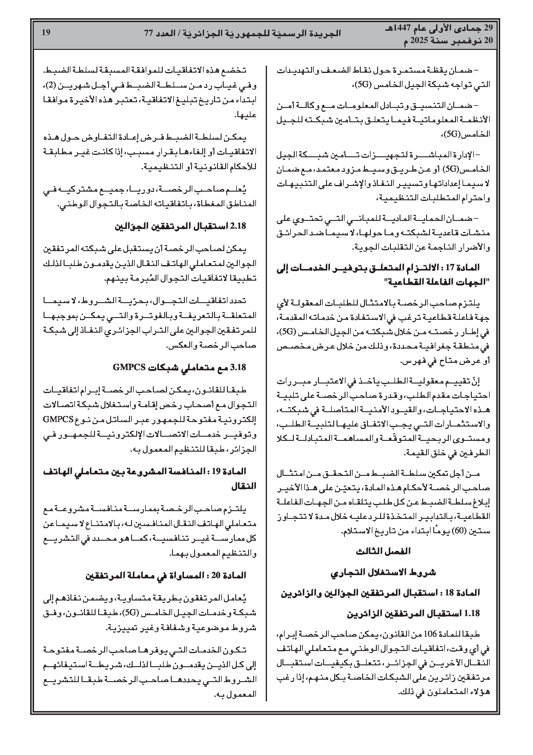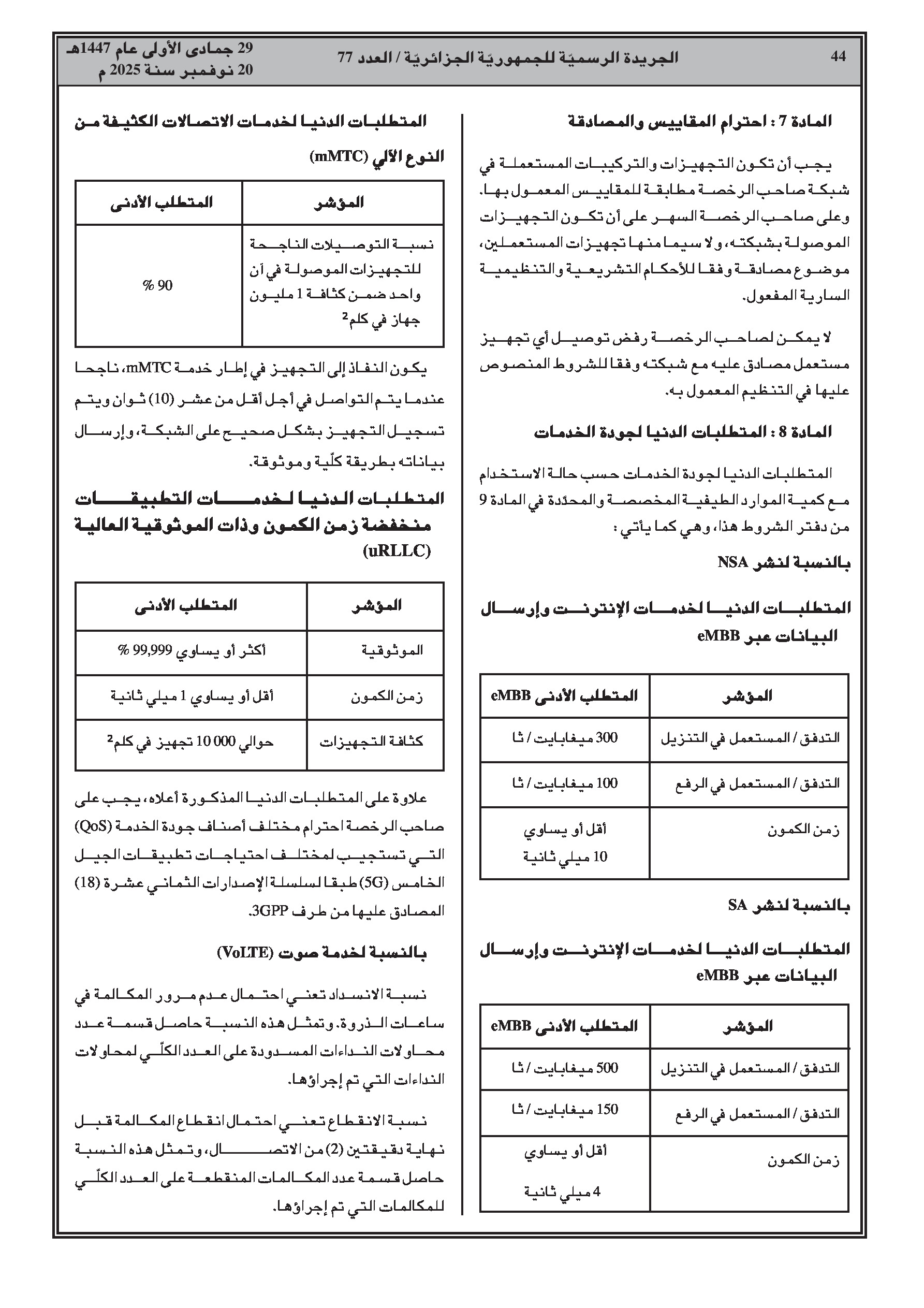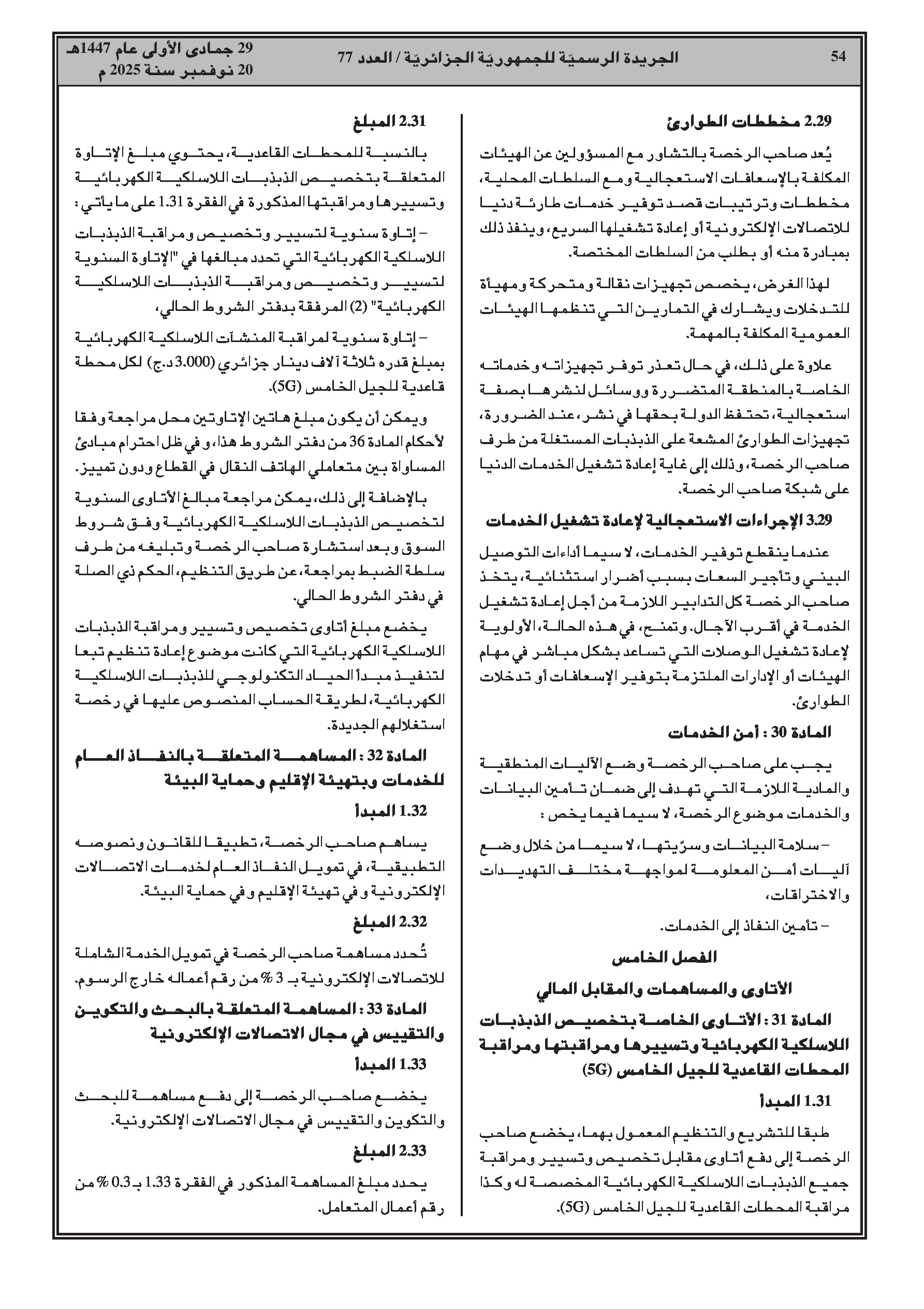 مراسيم تنفيذية توافق على منح تراخيص الجيل الخامس لشركات ATM Mobilis، Wataniya Télécom Algérie (Ooredoo)، و Optimum Télécom Algérie (Djezzy)، محددةً الشروط التقنية، المالية، ونطاق التغطية.