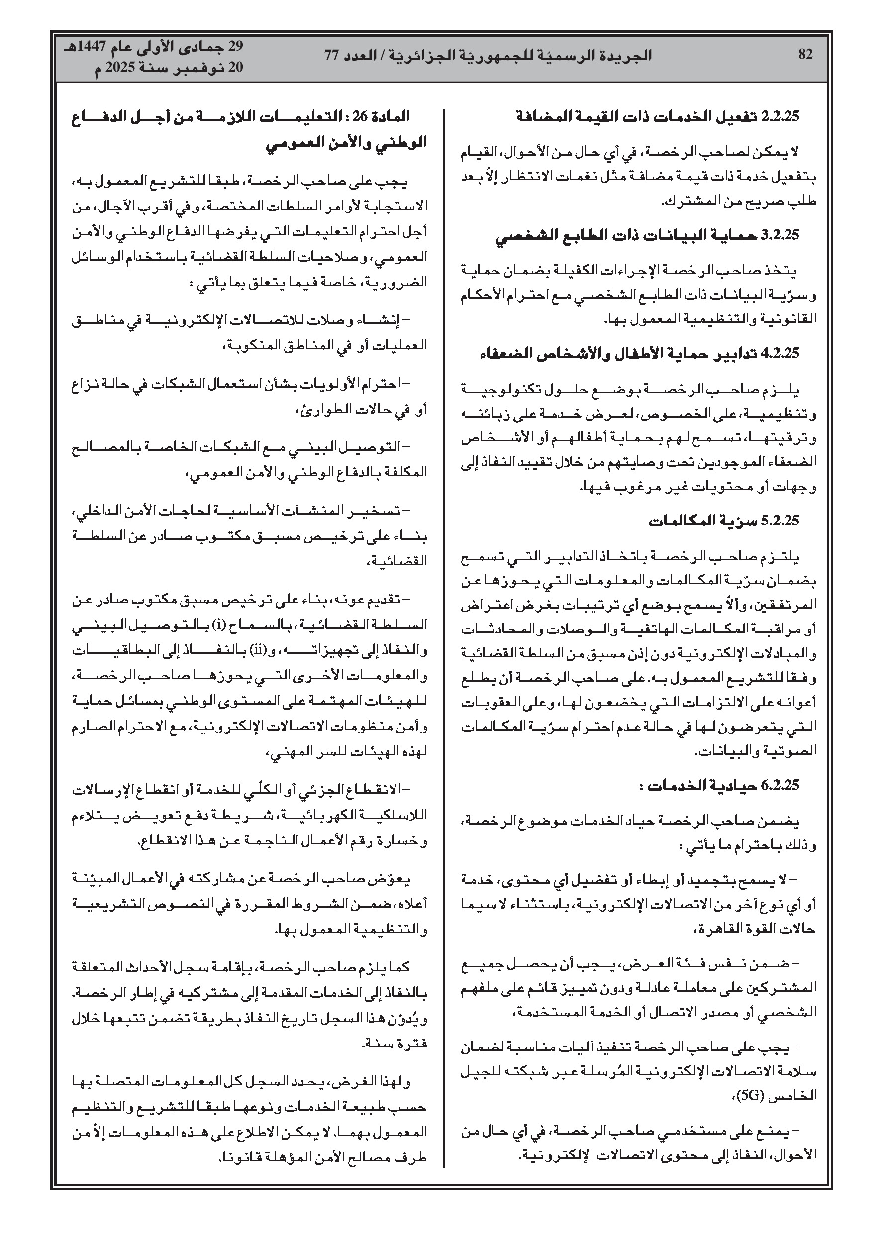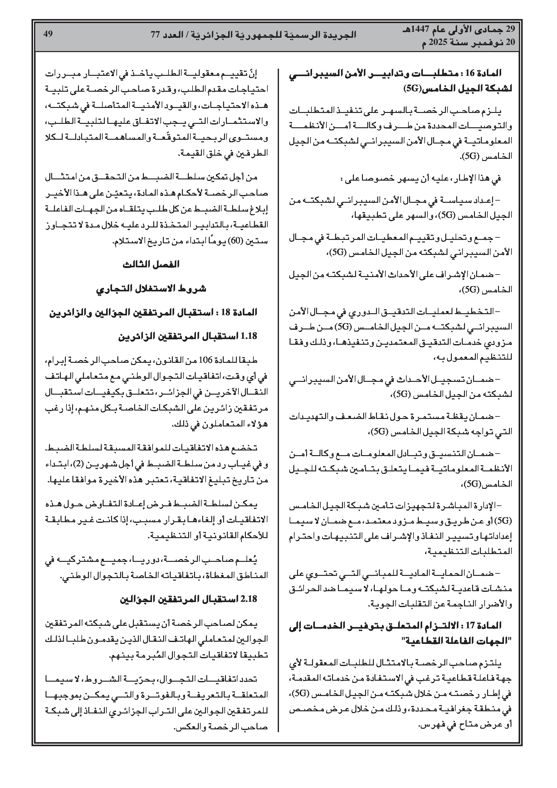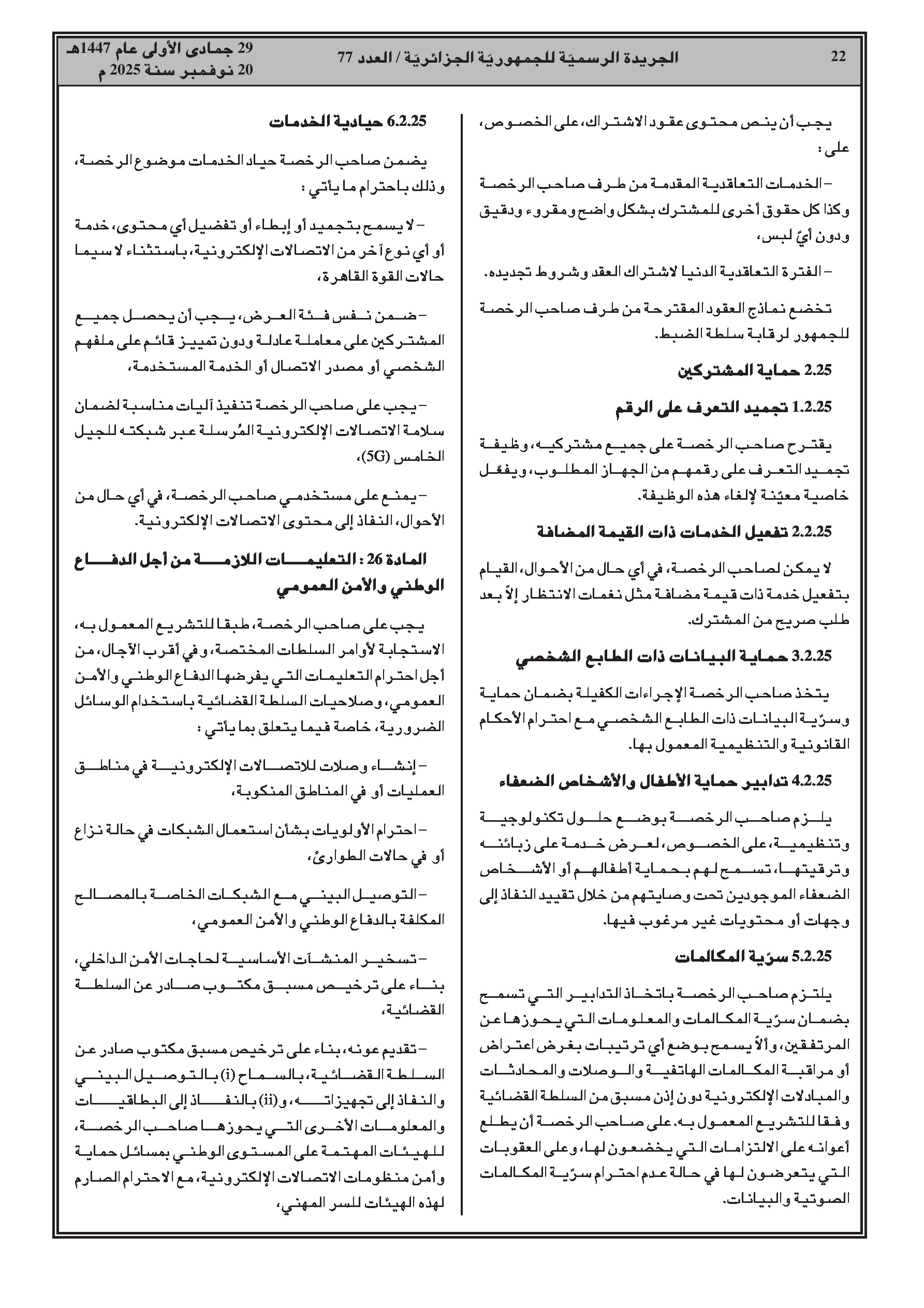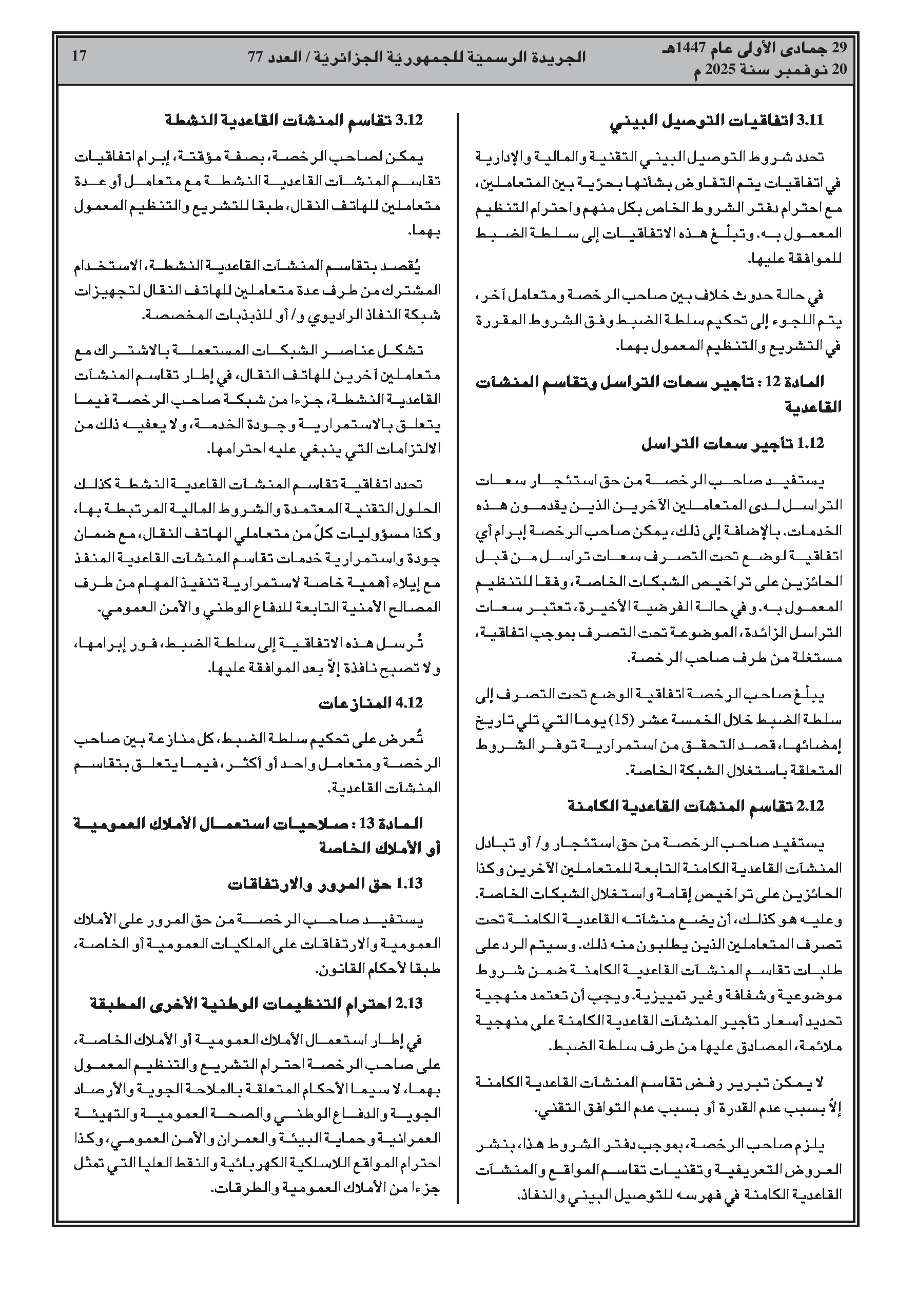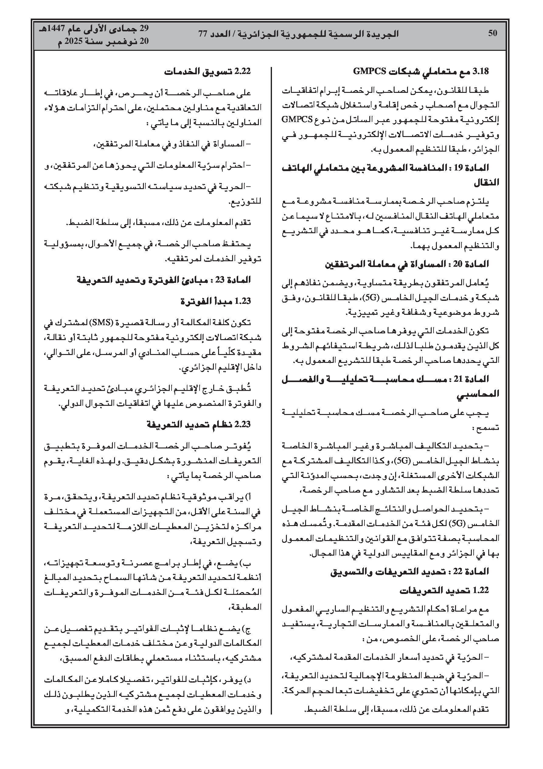 مراسيم تنفيذية توافق على منح تراخيص الجيل الخامس لشركات ATM Mobilis، Wataniya Télécom Algérie (Ooredoo)، و Optimum Télécom Algérie (Djezzy)، محددةً الشروط التقنية، المالية، ونطاق التغطية.