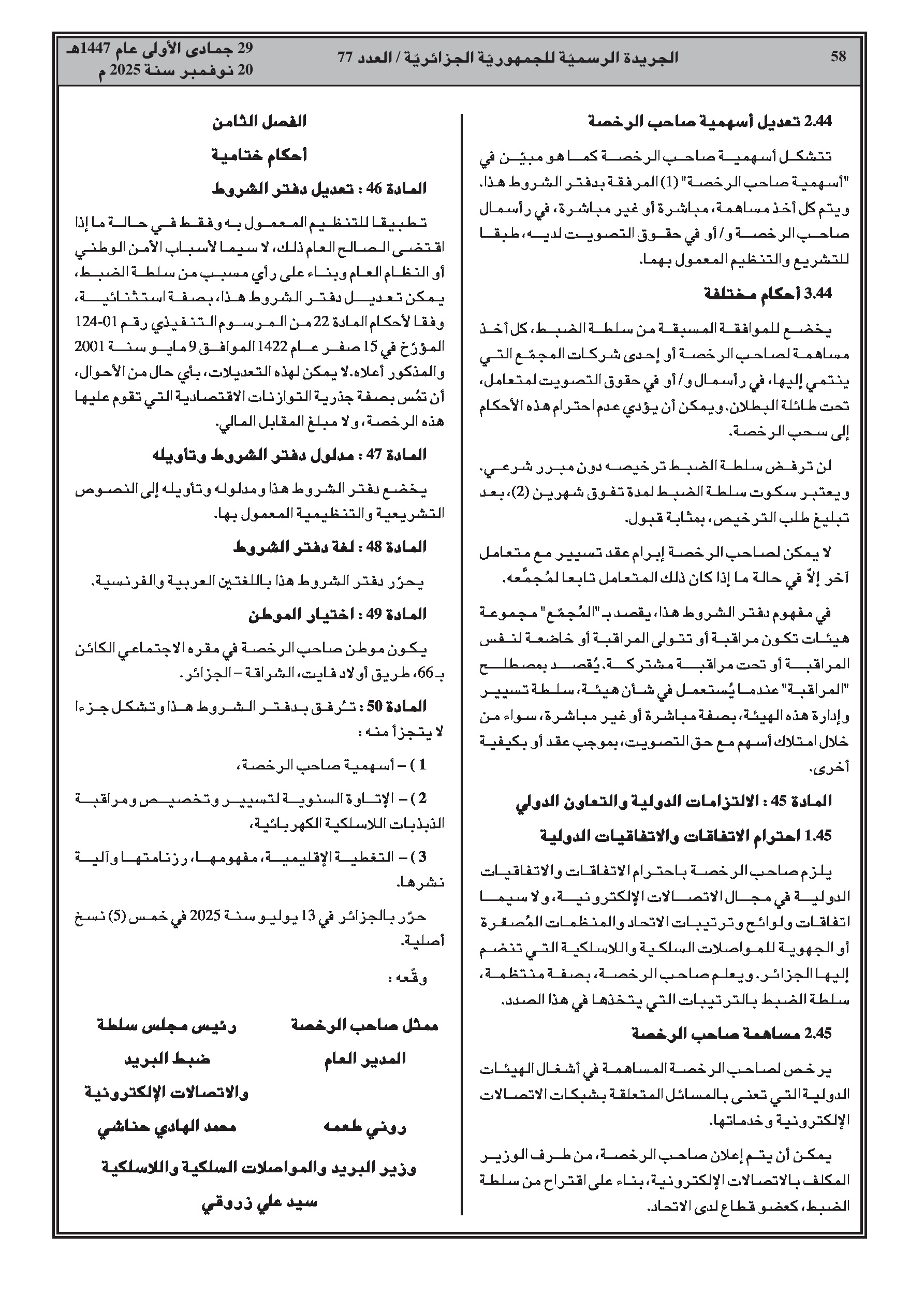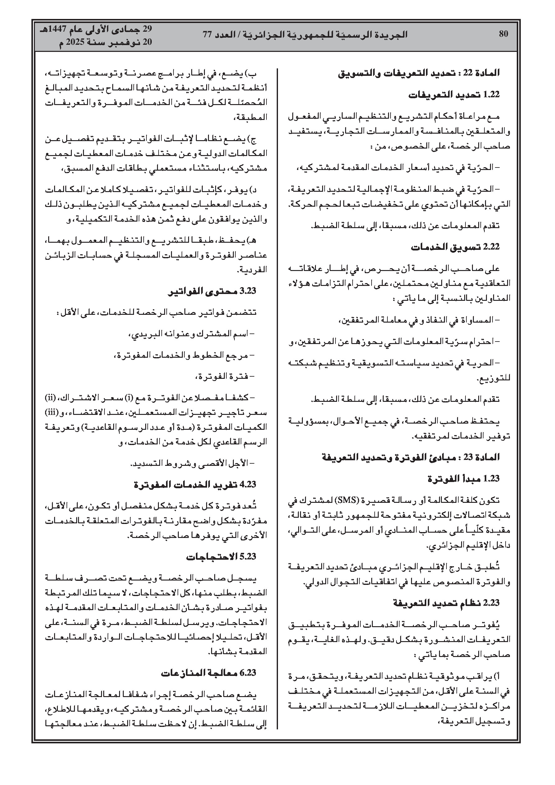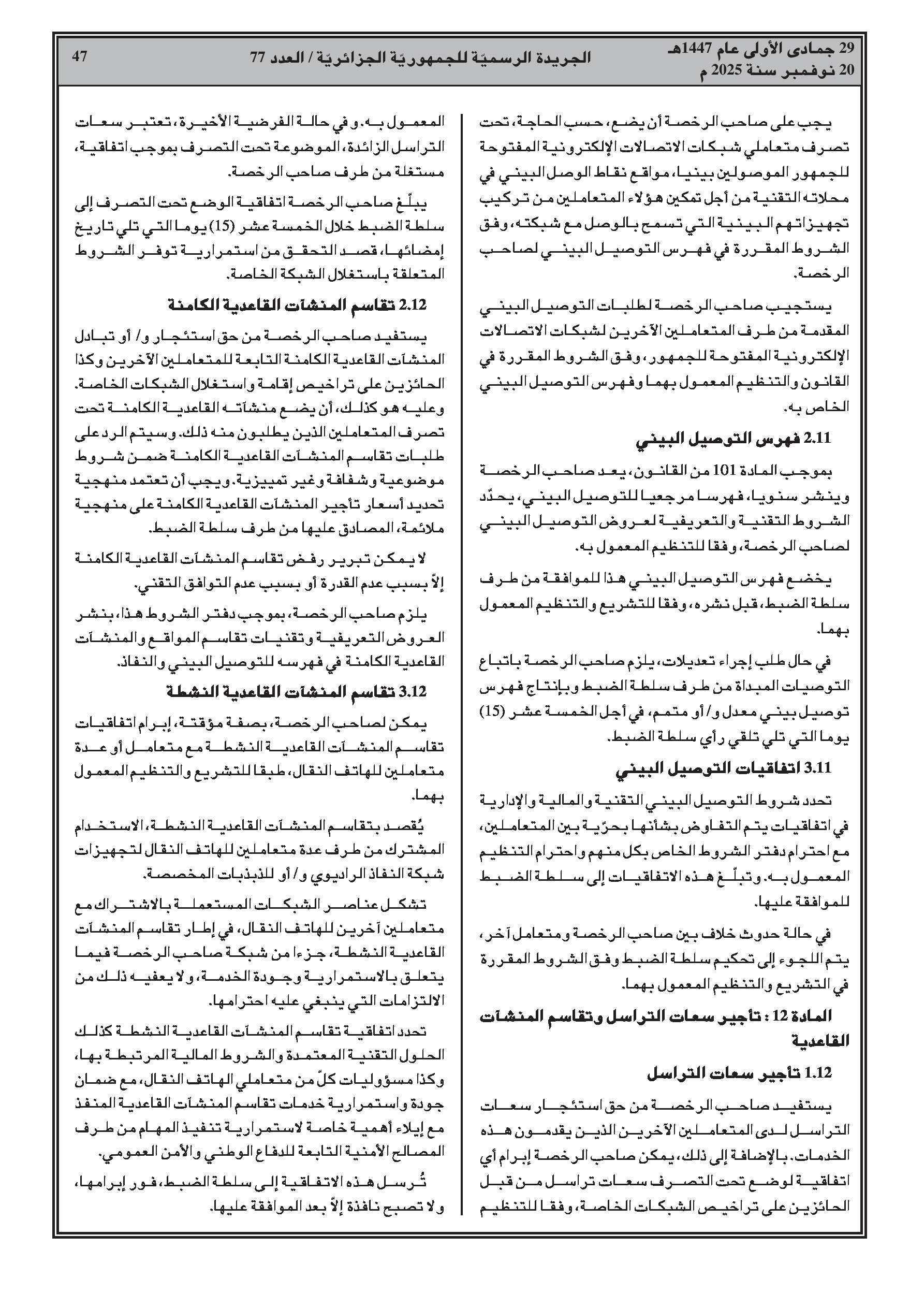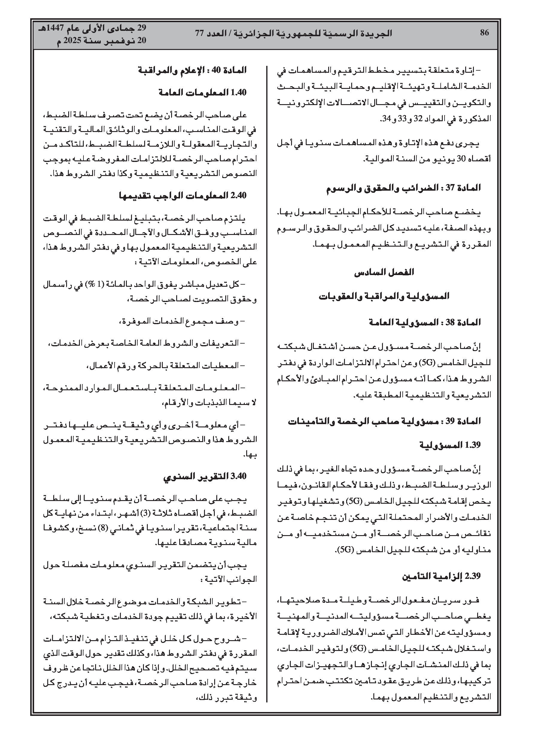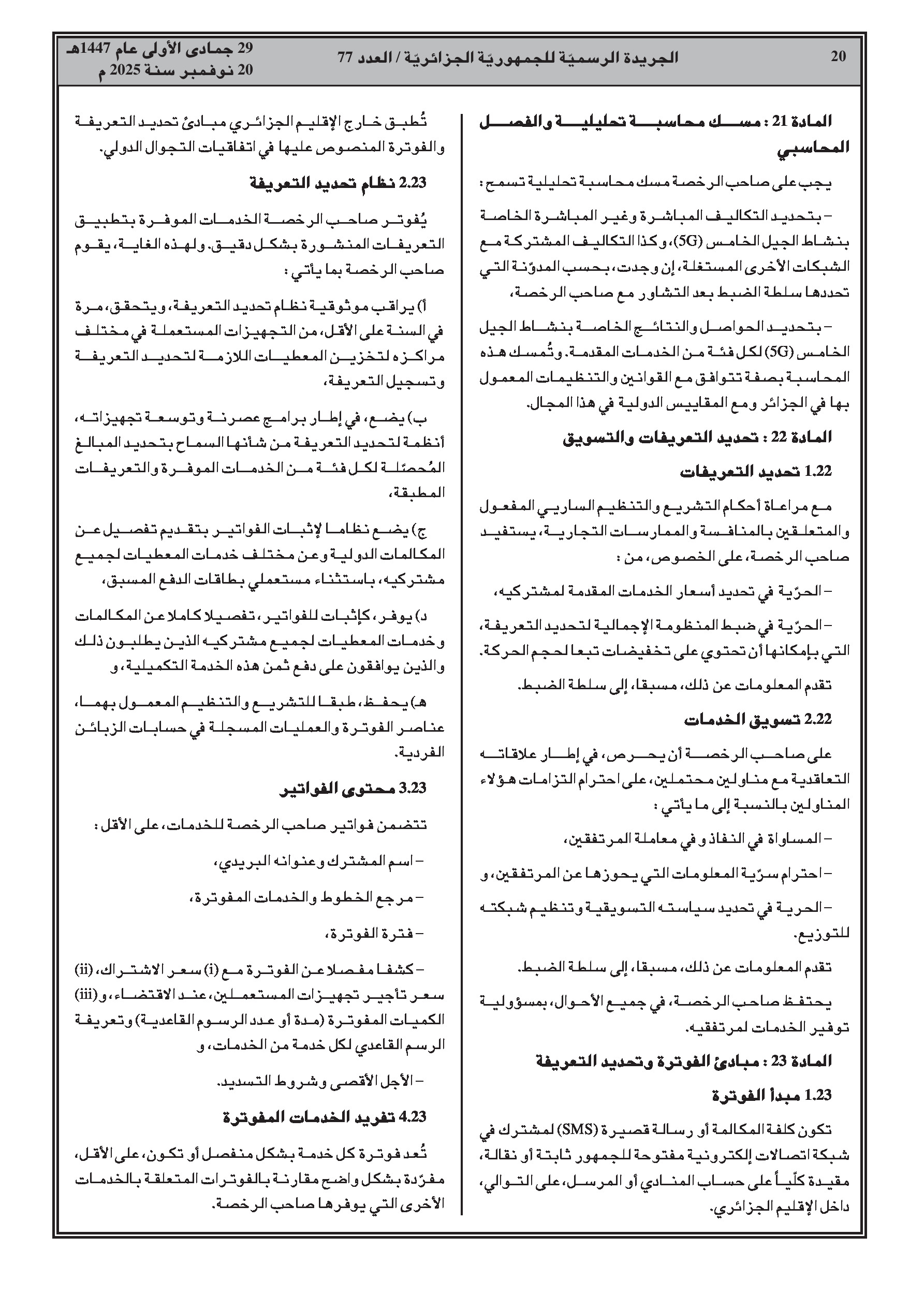 مراسيم تنفيذية توافق على منح تراخيص الجيل الخامس لشركات ATM Mobilis، Wataniya Télécom Algérie (Ooredoo)، و Optimum Télécom Algérie (Djezzy)، محددةً الشروط التقنية، المالية، ونطاق التغطية.
