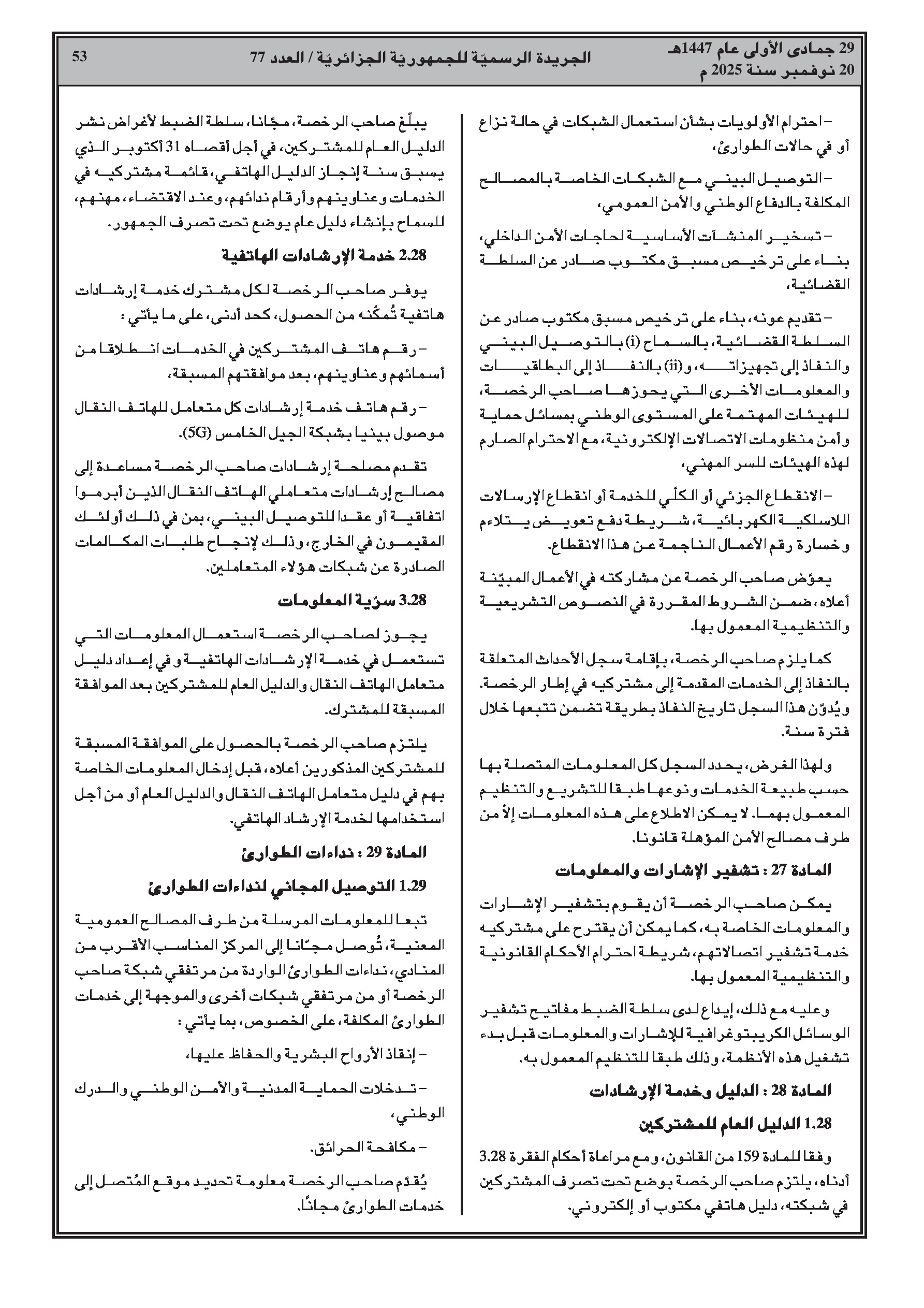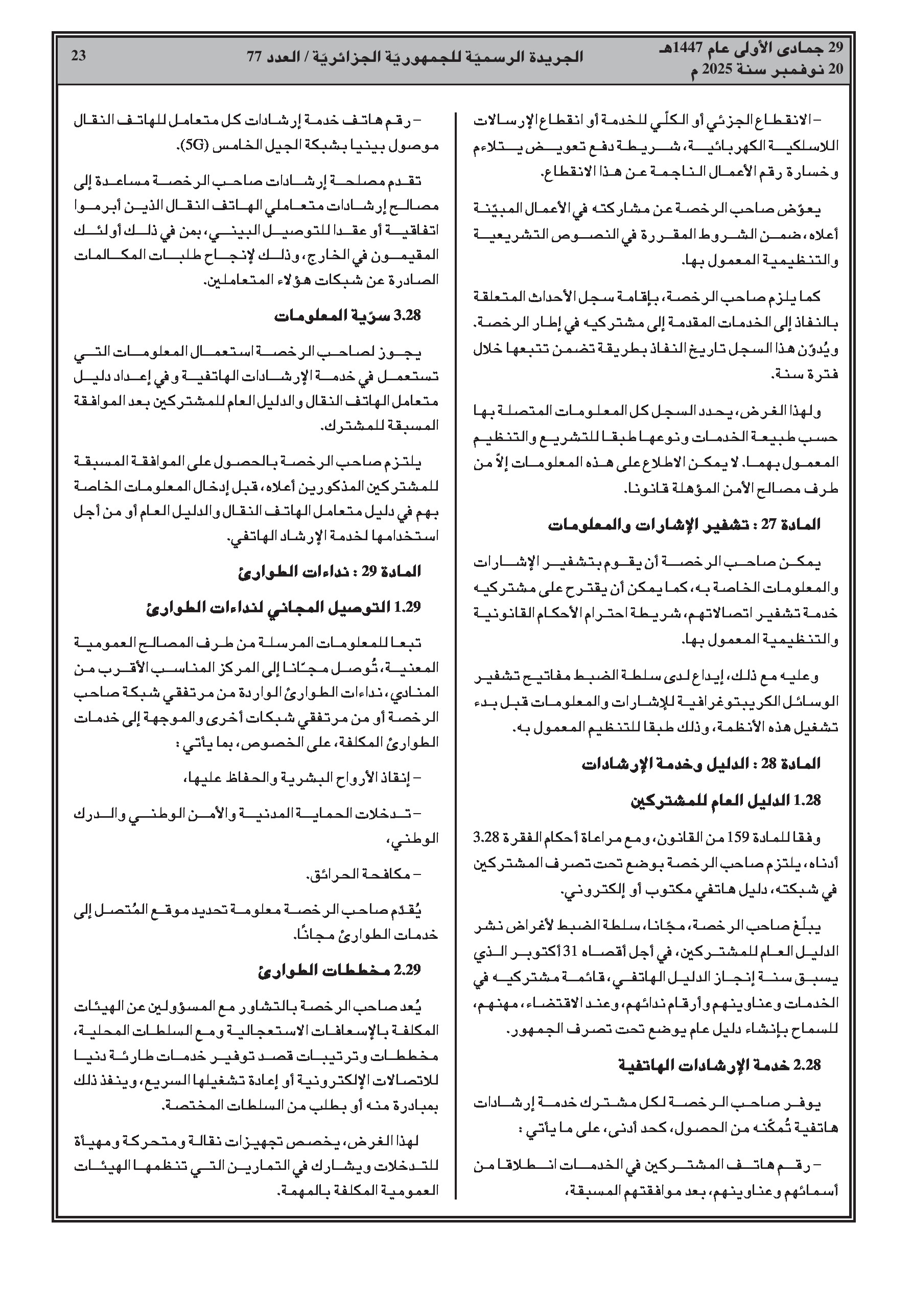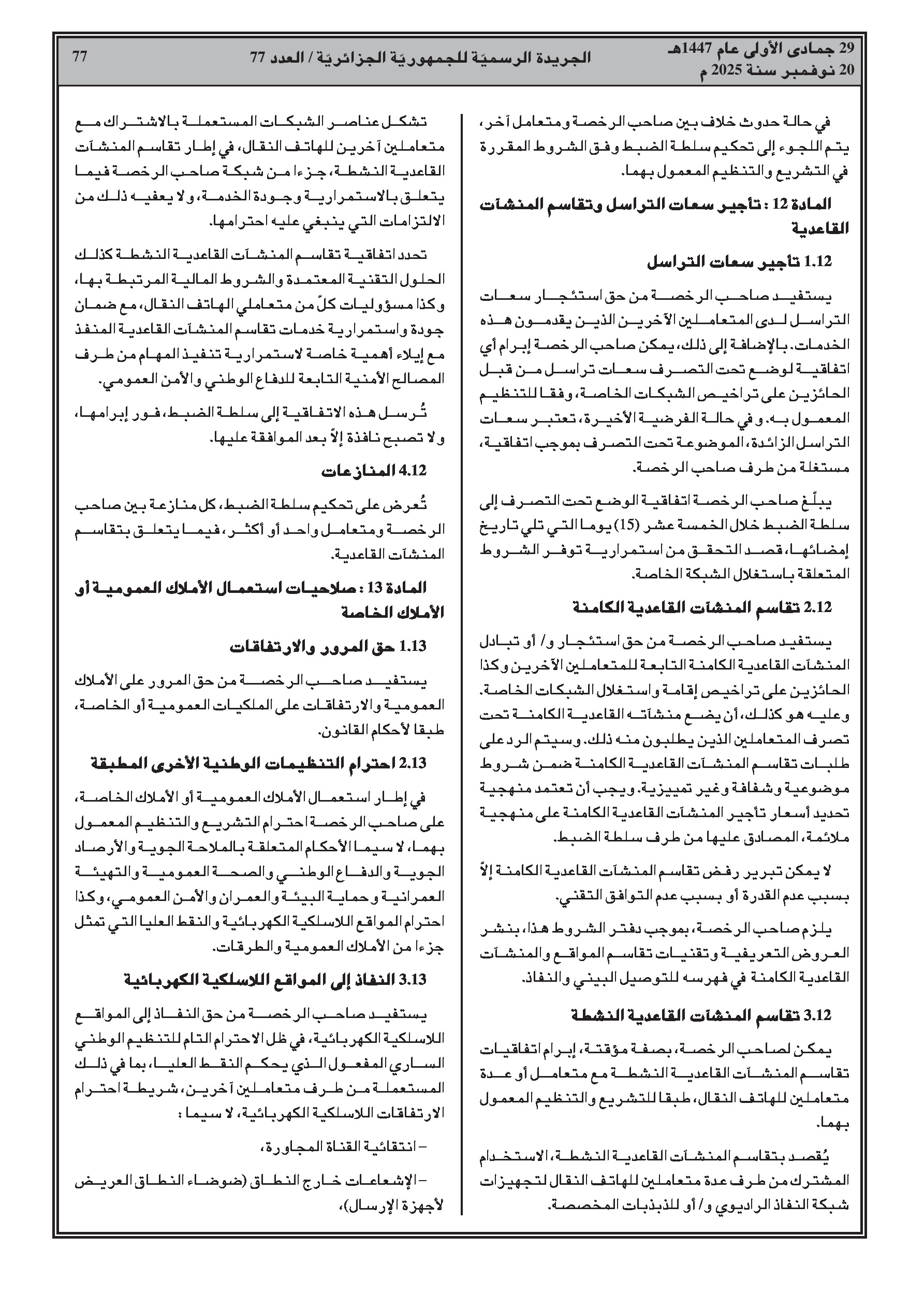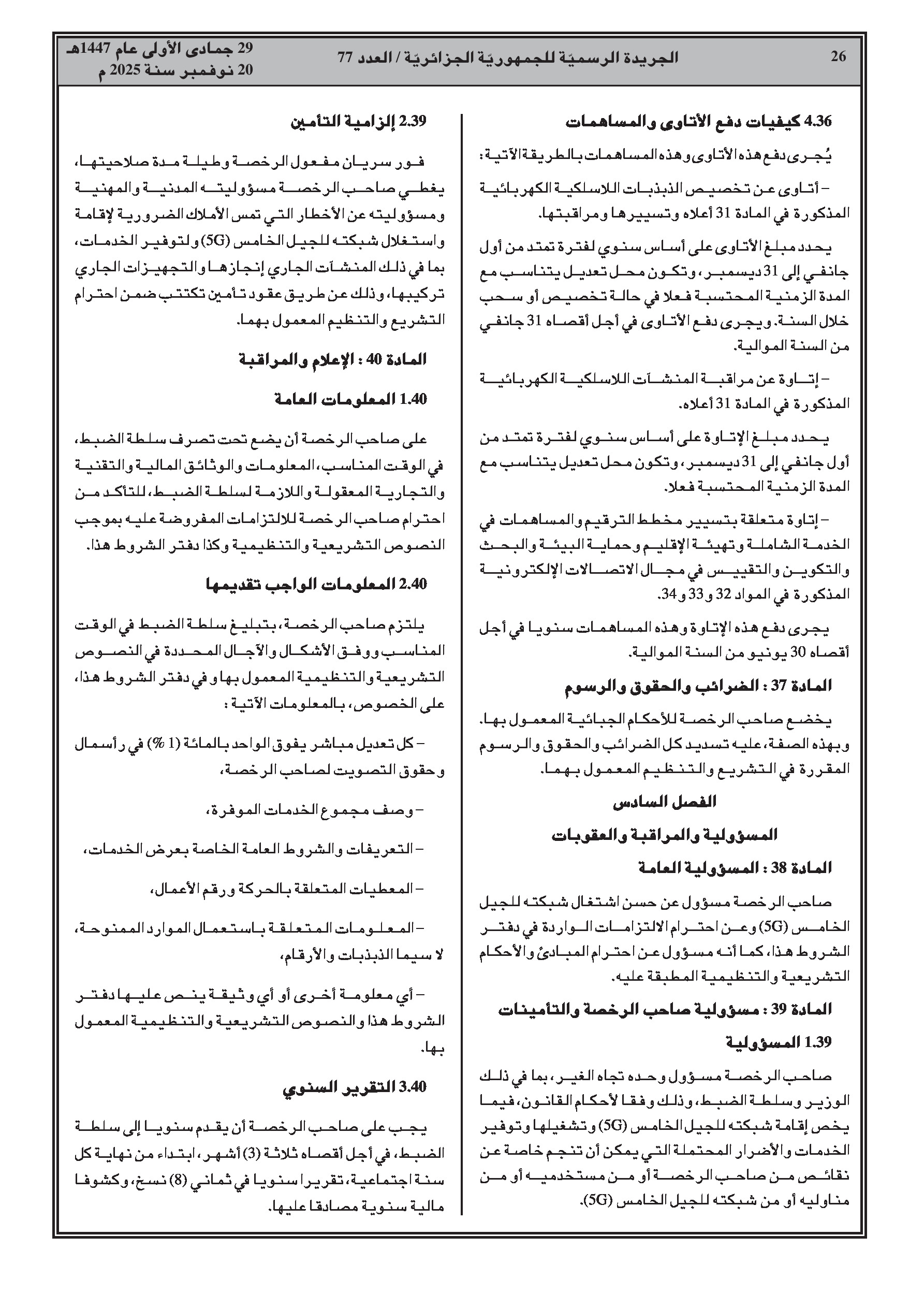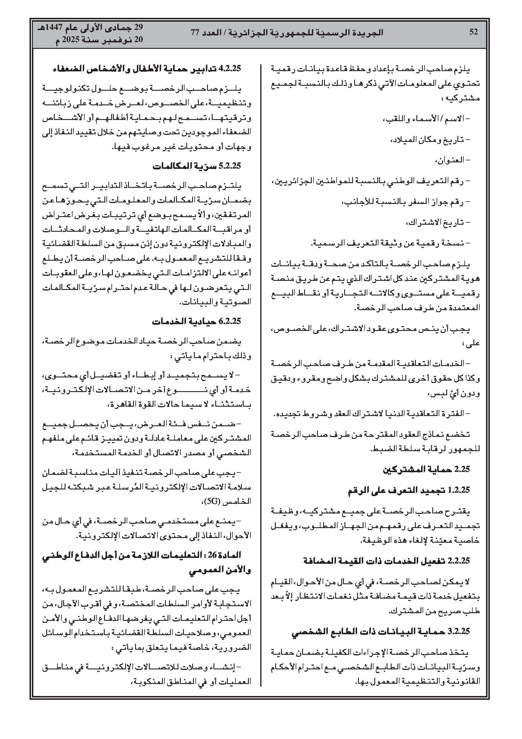 مراسيم تنفيذية توافق على منح تراخيص الجيل الخامس لشركات ATM Mobilis، Wataniya Télécom Algérie (Ooredoo)، و Optimum Télécom Algérie (Djezzy)، محددةً الشروط التقنية، المالية، ونطاق التغطية.