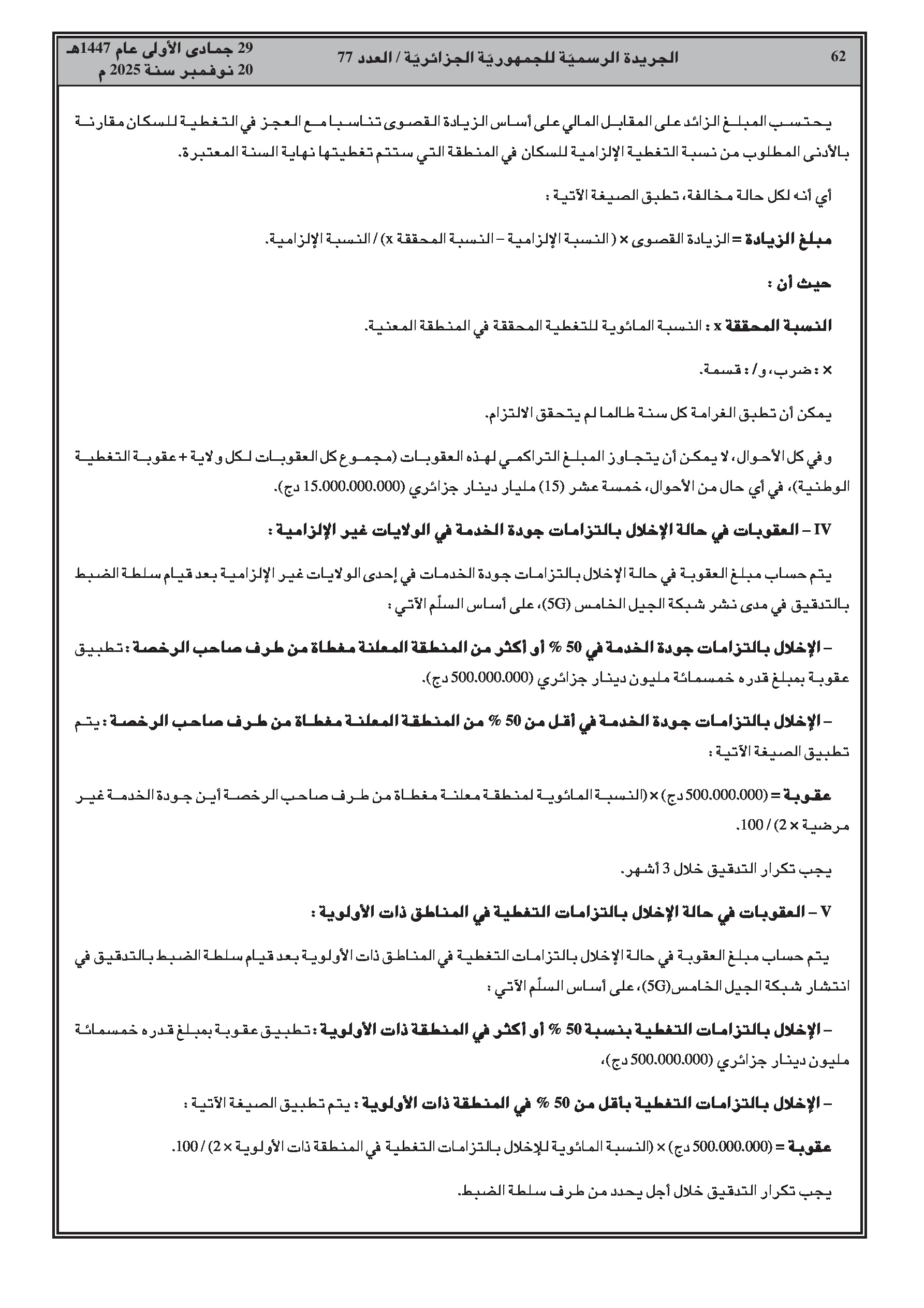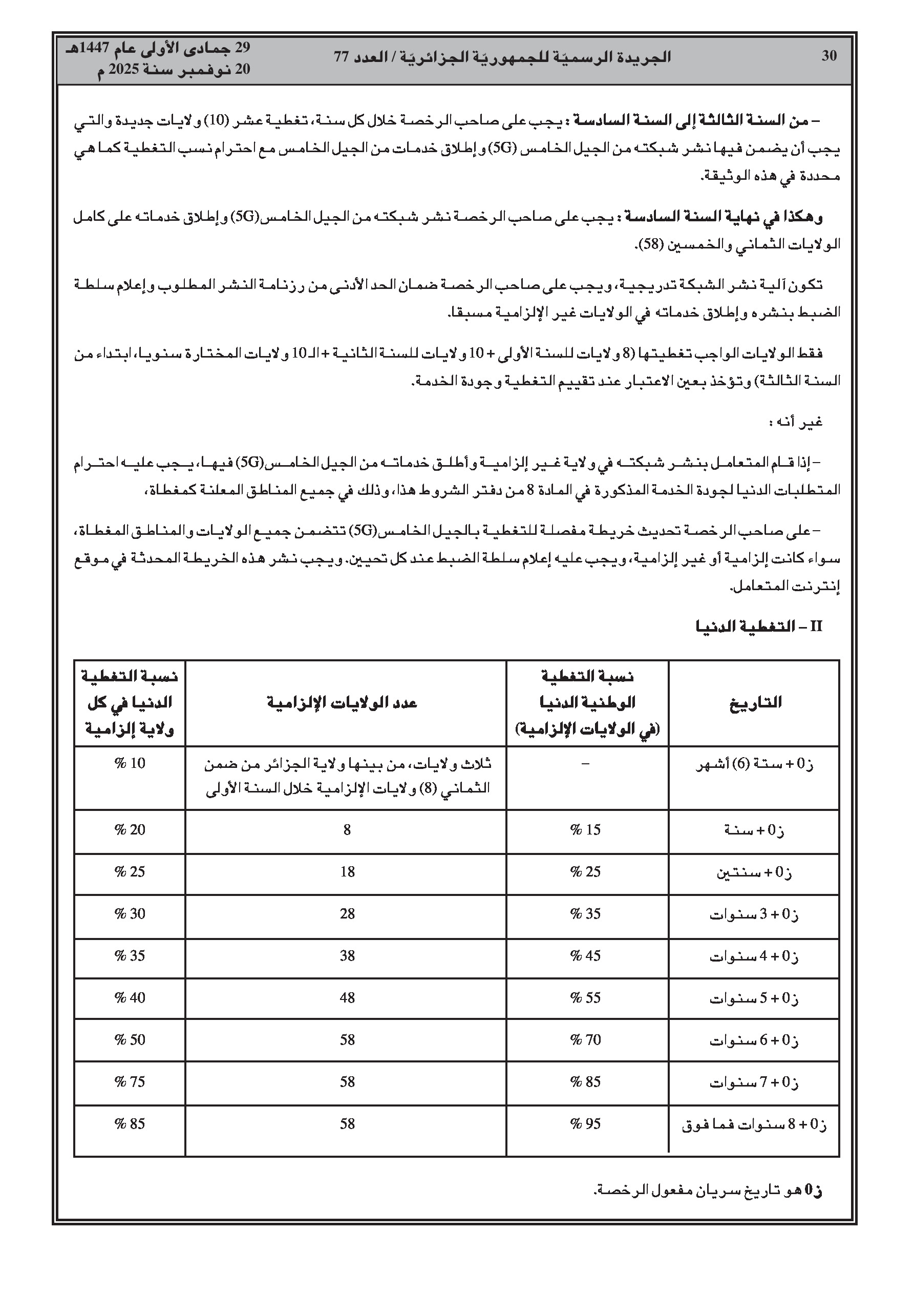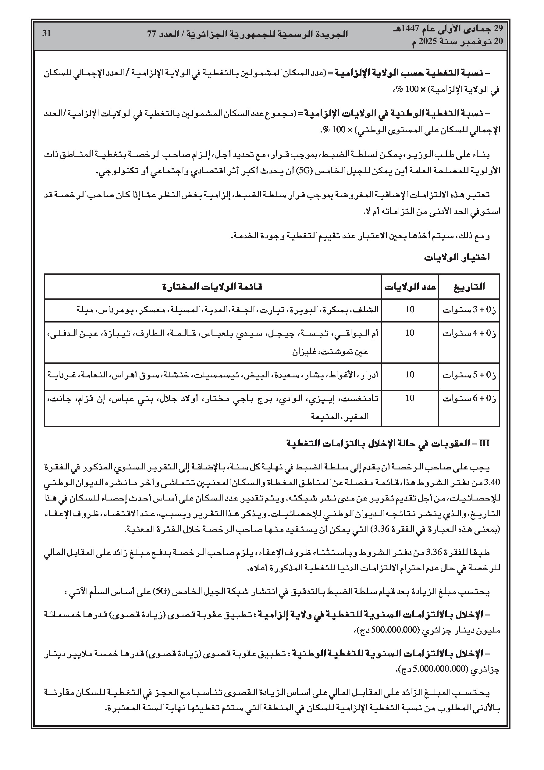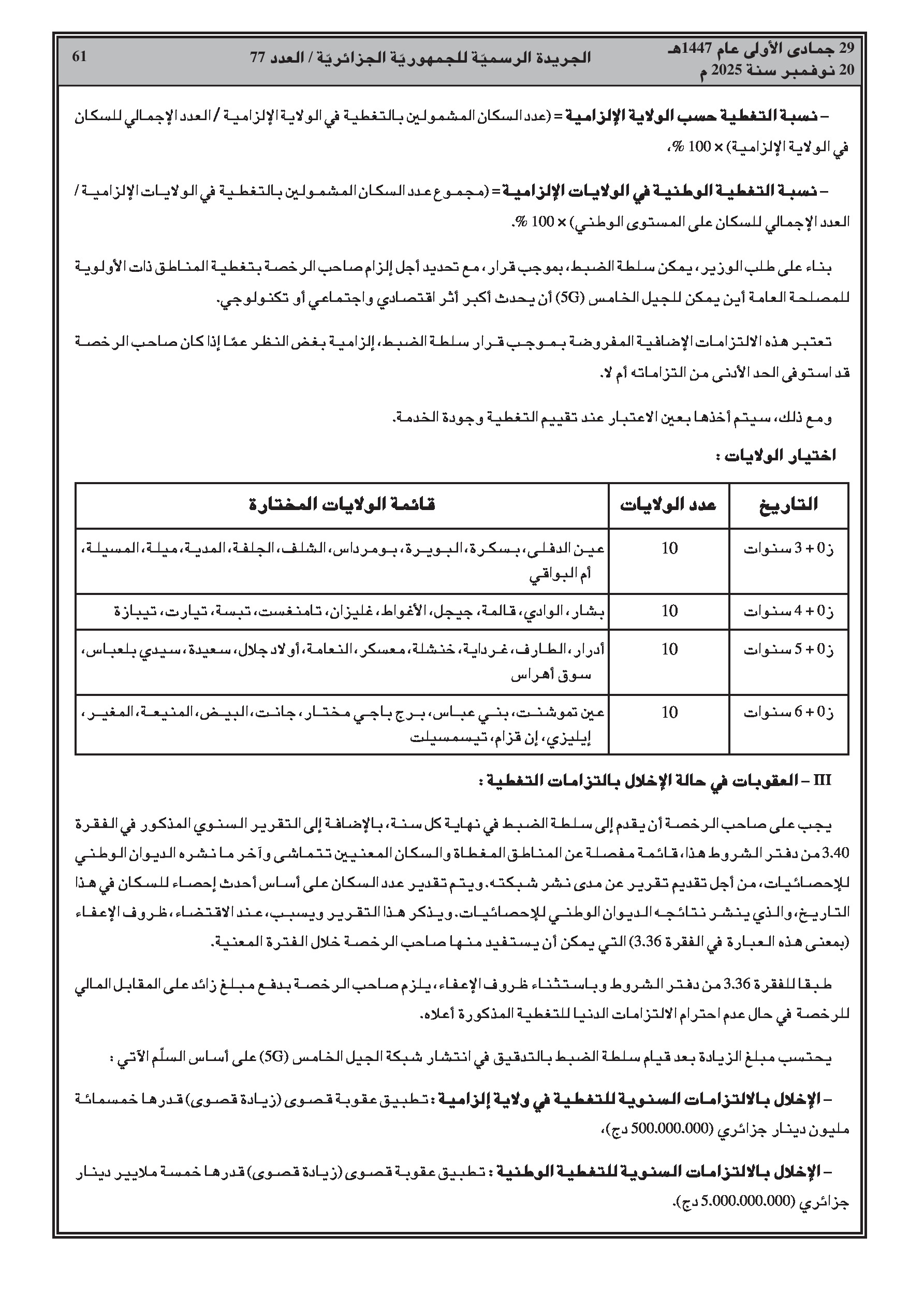 - تحدد دفاتر الشروط المرفقة الالتزامات التقنية، جودة الخدمة، وجدول التغطية التدريجي عبر الولايات على مدى عدة سنوات.