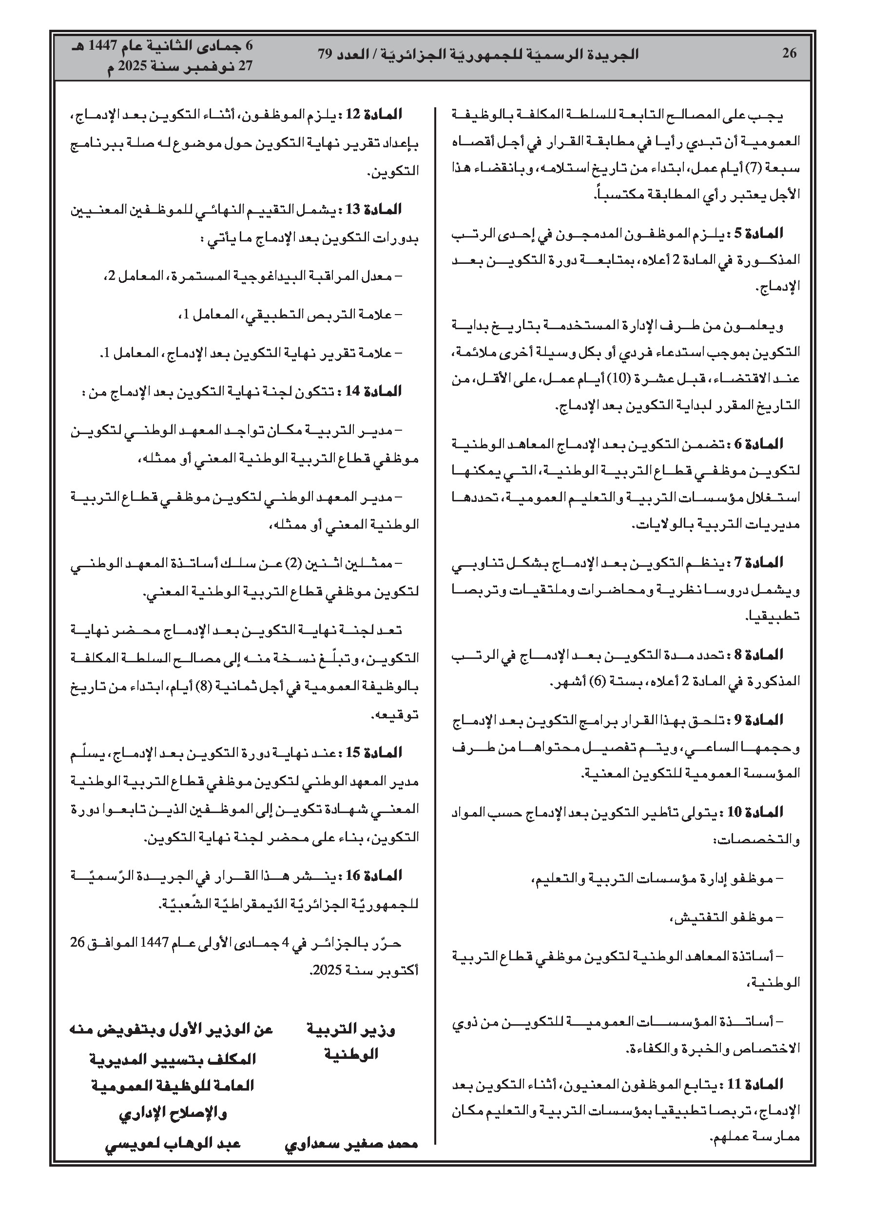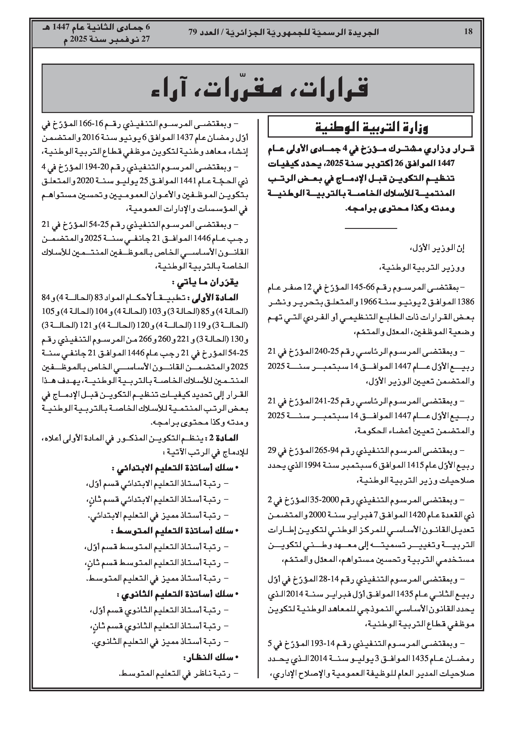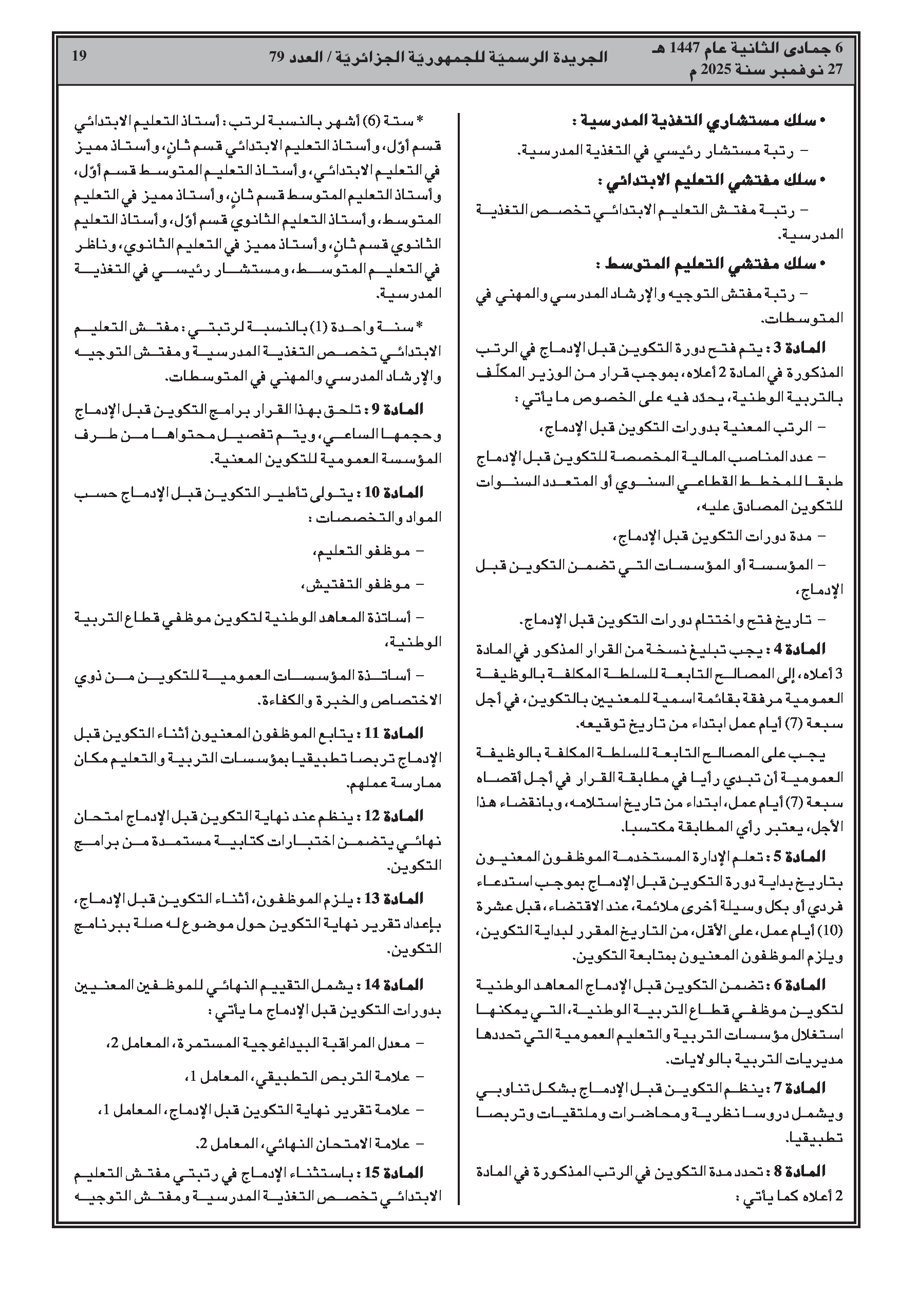 - ضبط مدة ومحتوى التكوين المسبق للإدماج في رتب أساتذة التعليم (ابتدائي، متوسط، ثانوي) والمفتشين.