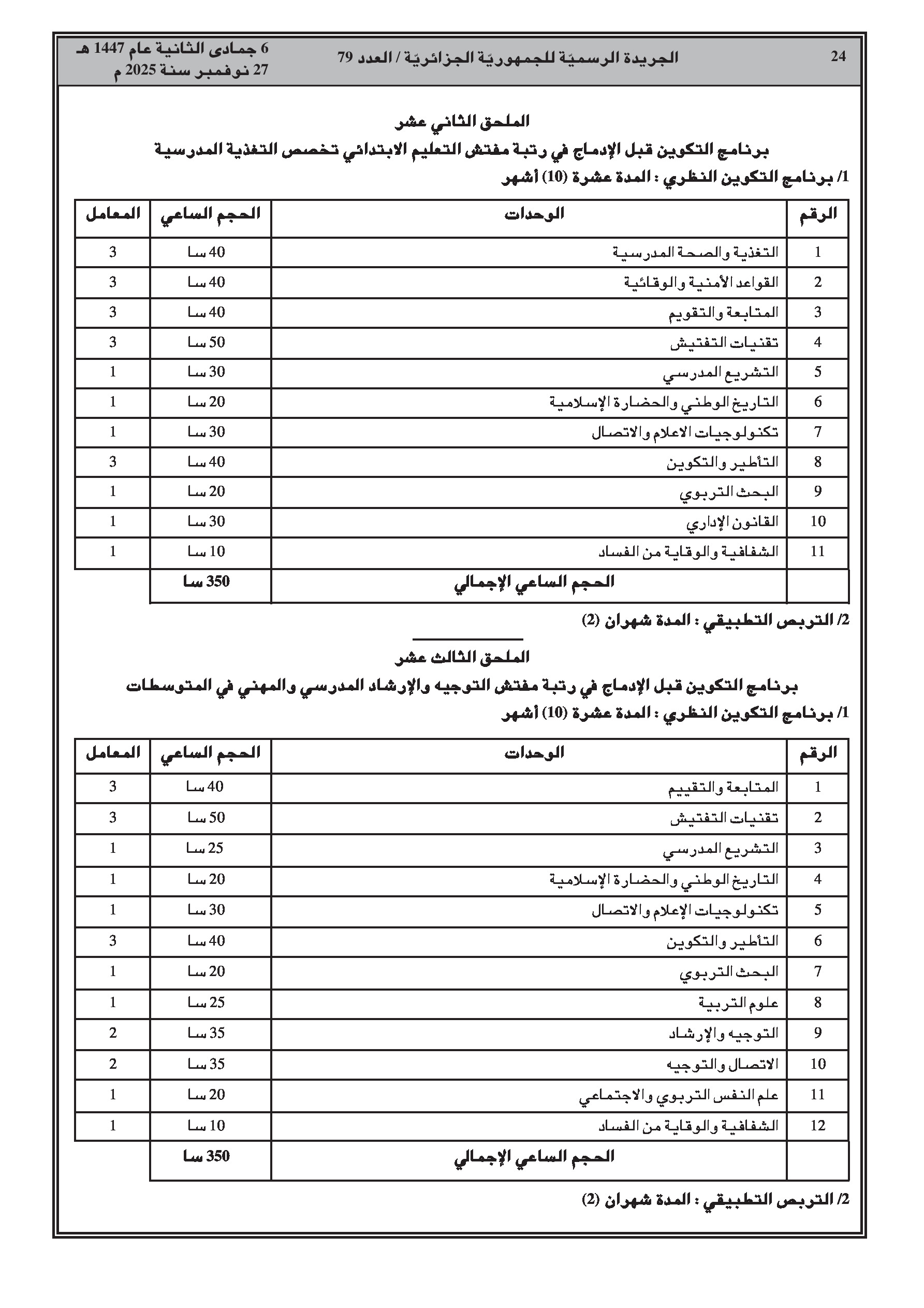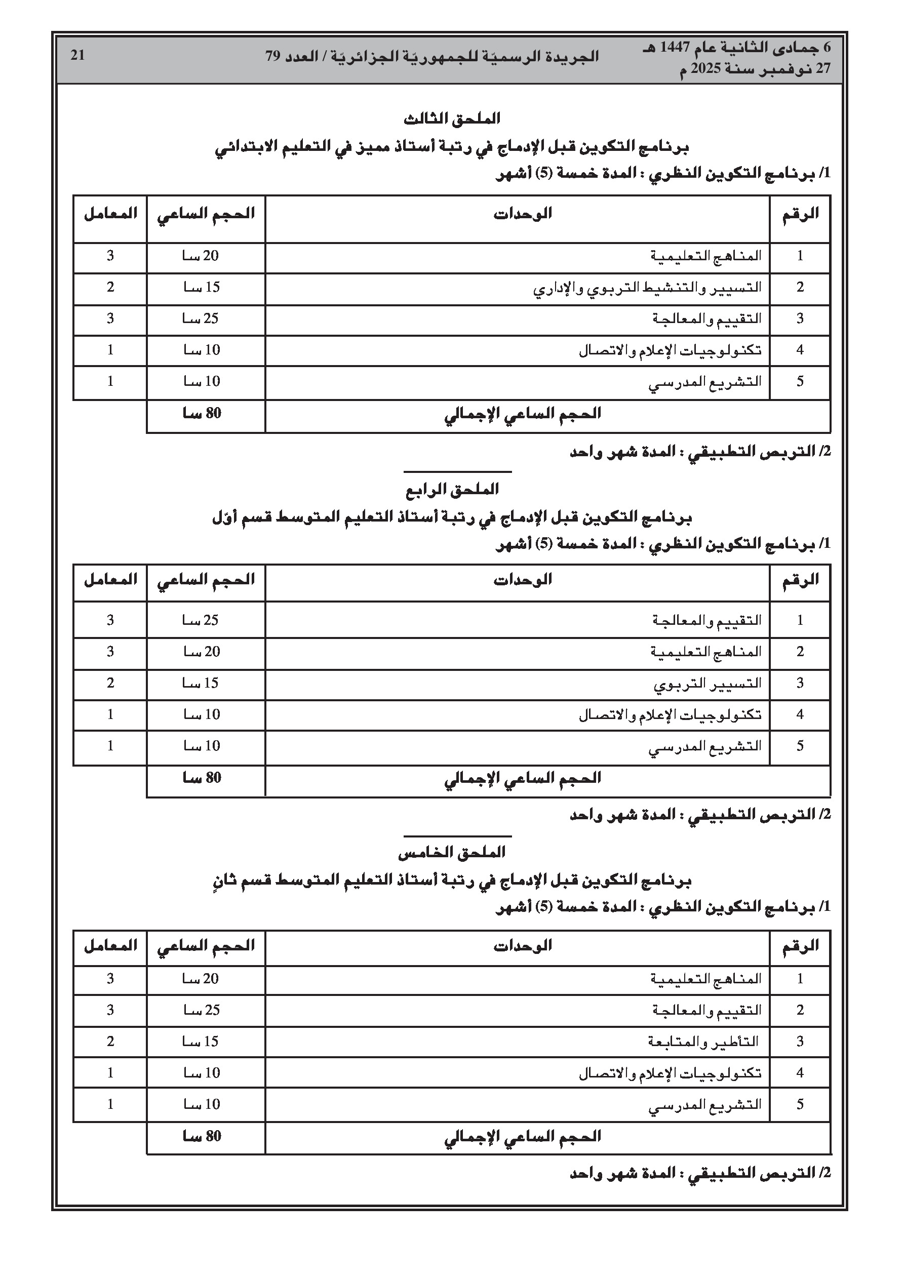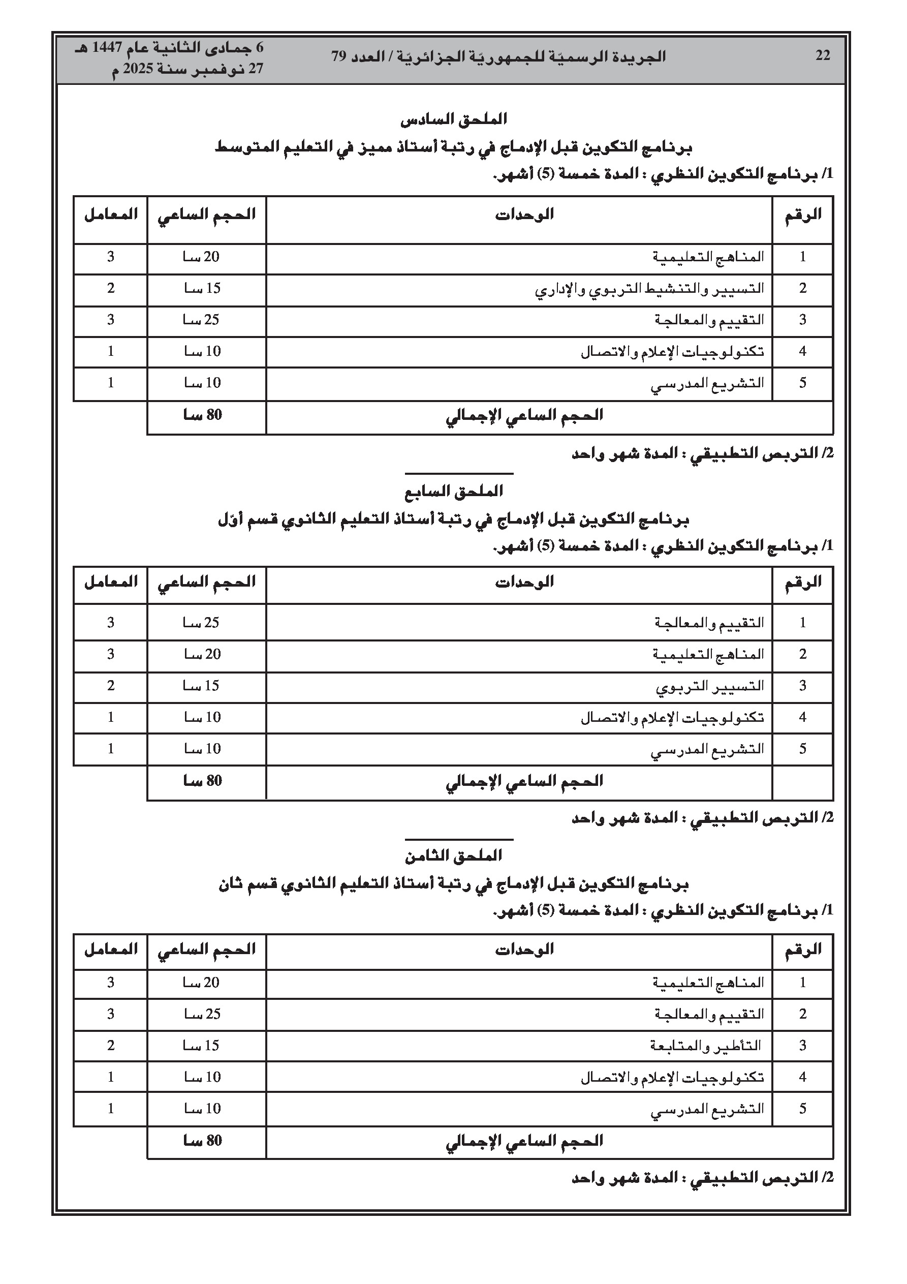 - ضبط مدة ومحتوى التكوين المسبق للإدماج في رتب أساتذة التعليم (ابتدائي، متوسط، ثانوي) والمفتشين.