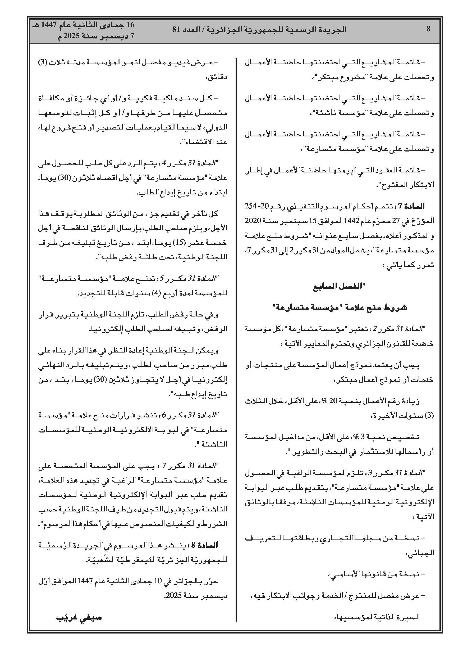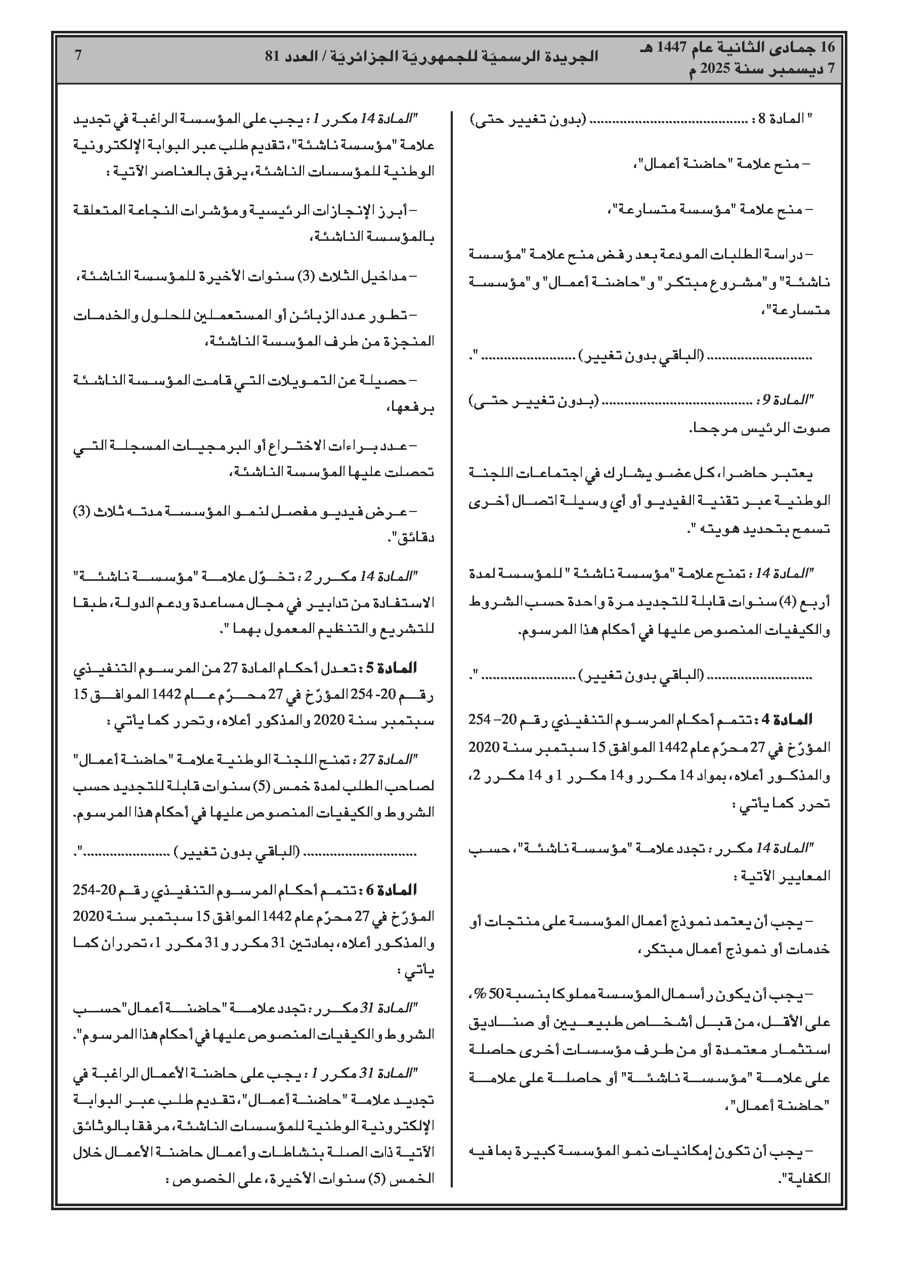 تعديل المرسوم التنفيذي المتعلق باللجنة الوطنية لمنح علامة "مؤسسة ناشئة" لإدراج علامة جديدة "Scale-up" وتحديد شروط الاستفادة منها.