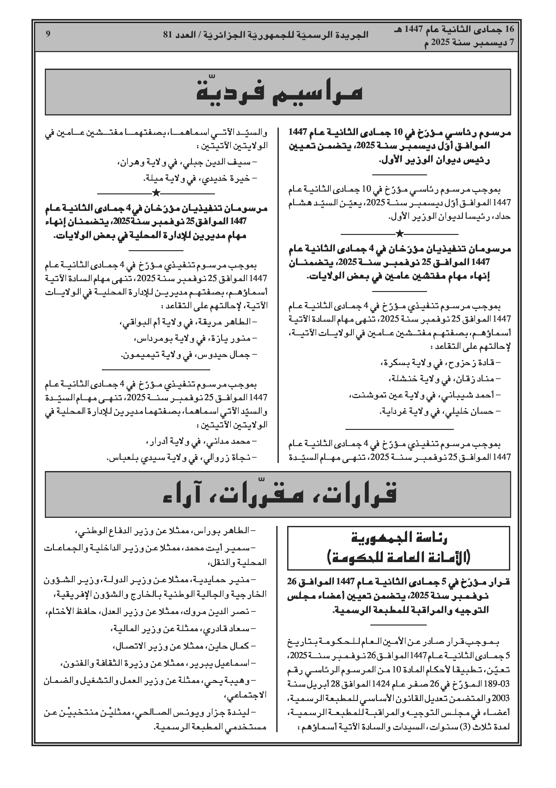 3. تعيينات: مدير ديوان الوزير الأول وتغييرات في القضاء العسكري