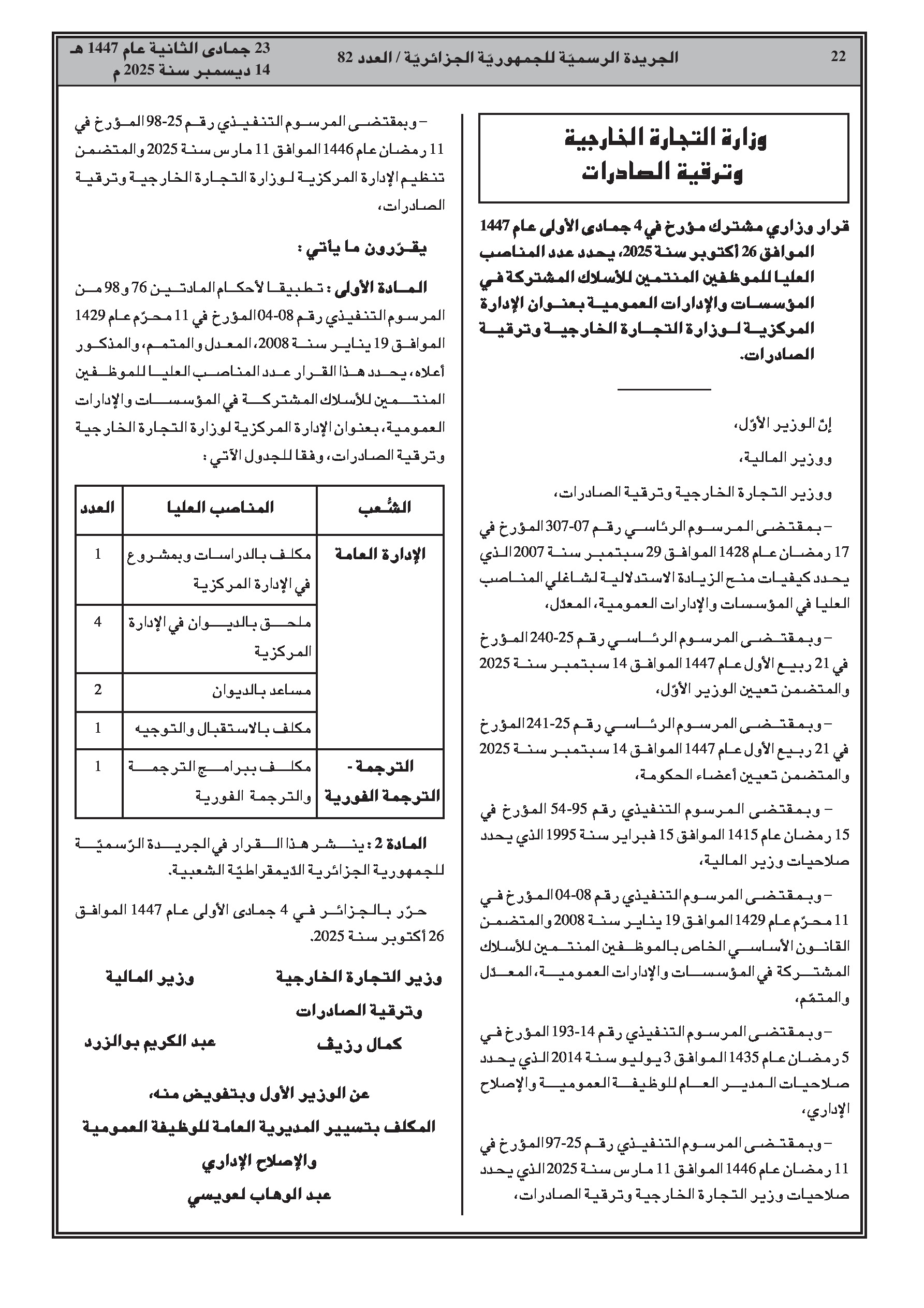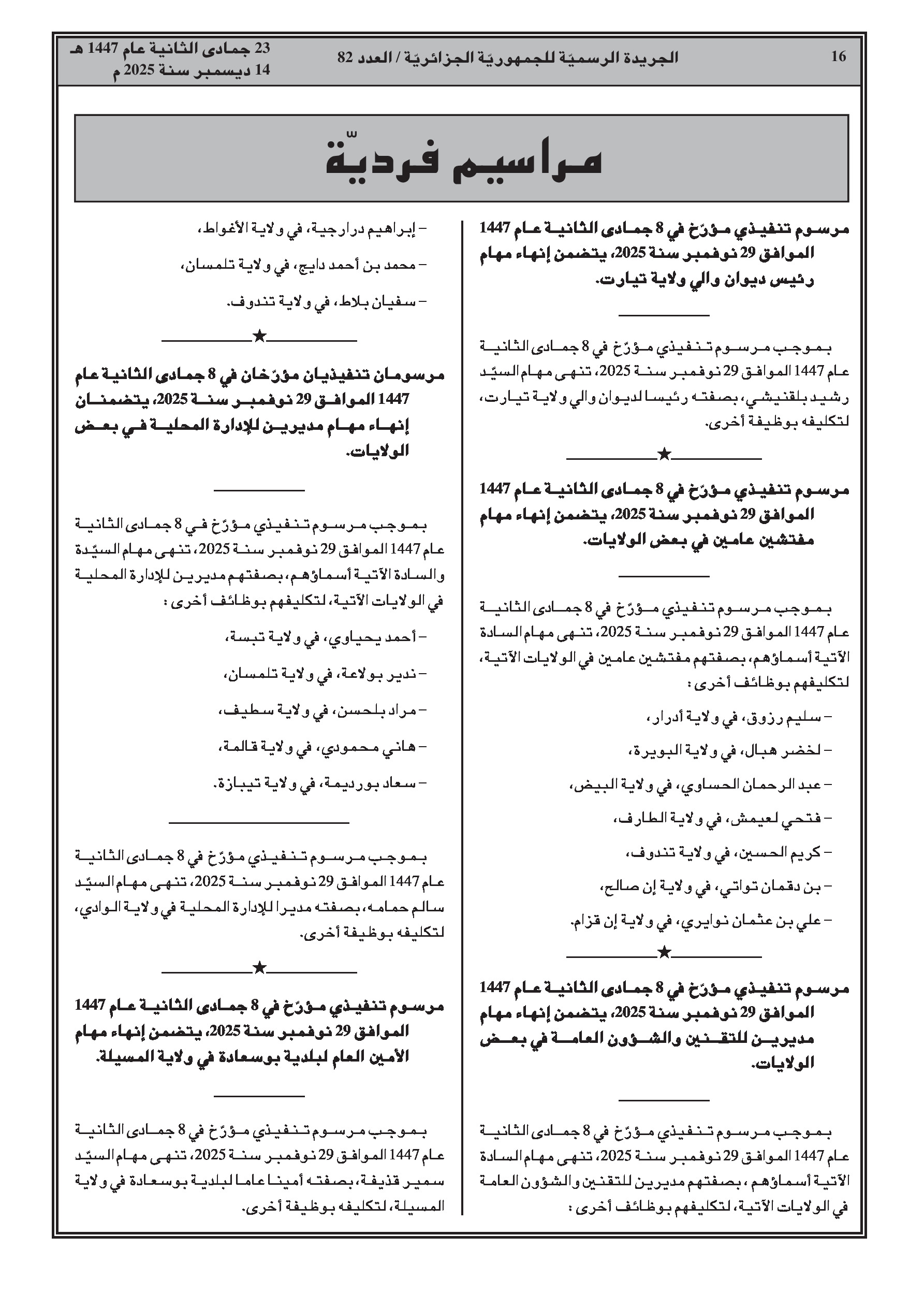 مراسيم تتضمن حركة في سلك رؤساء الدواوين، المفتشين العامين، ومديري التنظيم والشؤون العامة والإدارة المحلية في عدة ولايات.
