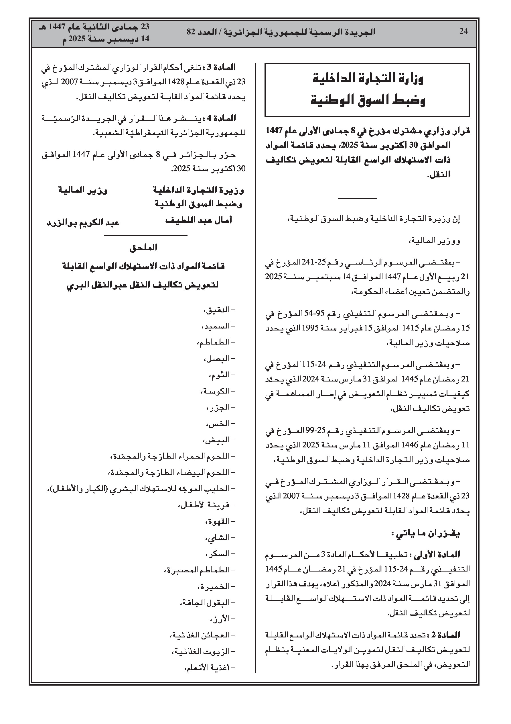 تحديد قائمة المواد واسعة الاستهلاك التي يتم تعويض تكاليف نقلها لضمان تموين الولايات المعنية بنظام التعويض (الجنوب والهضاب).