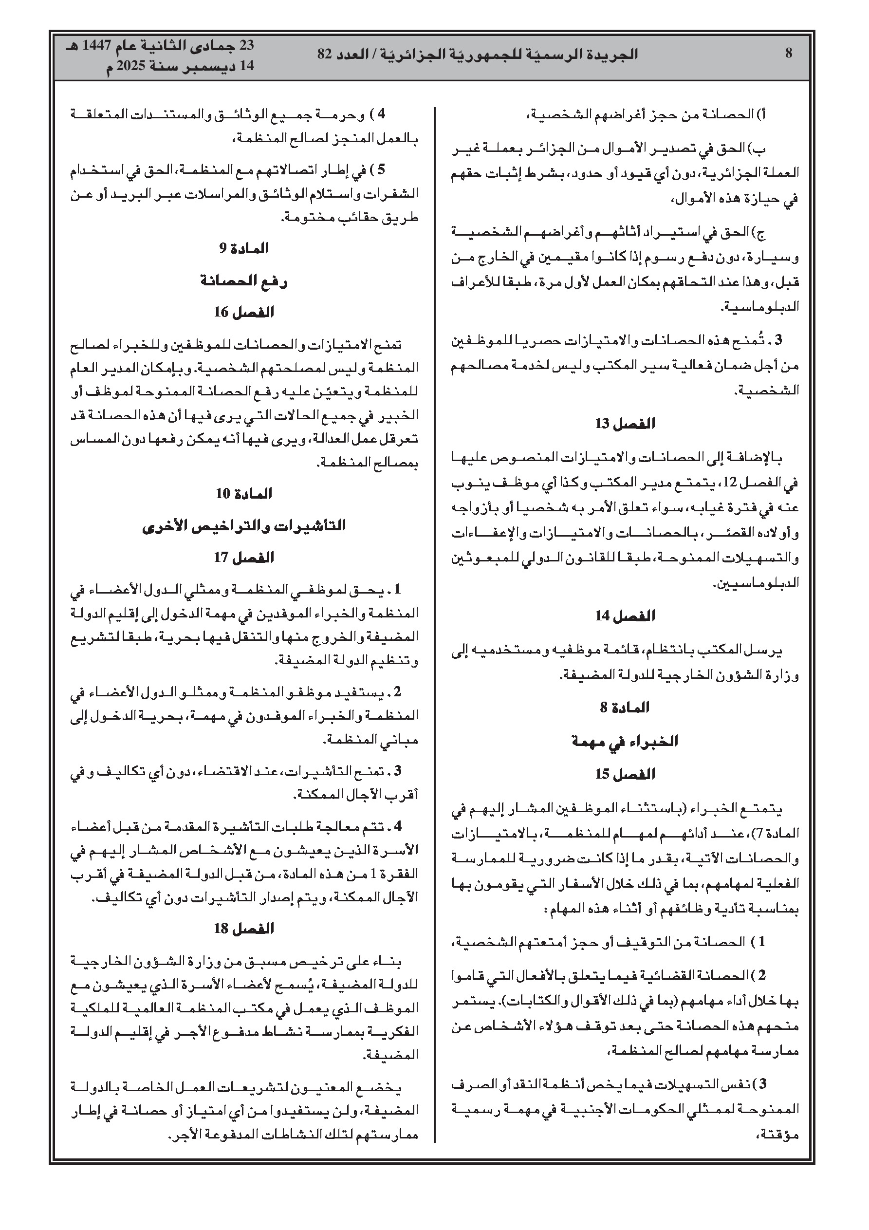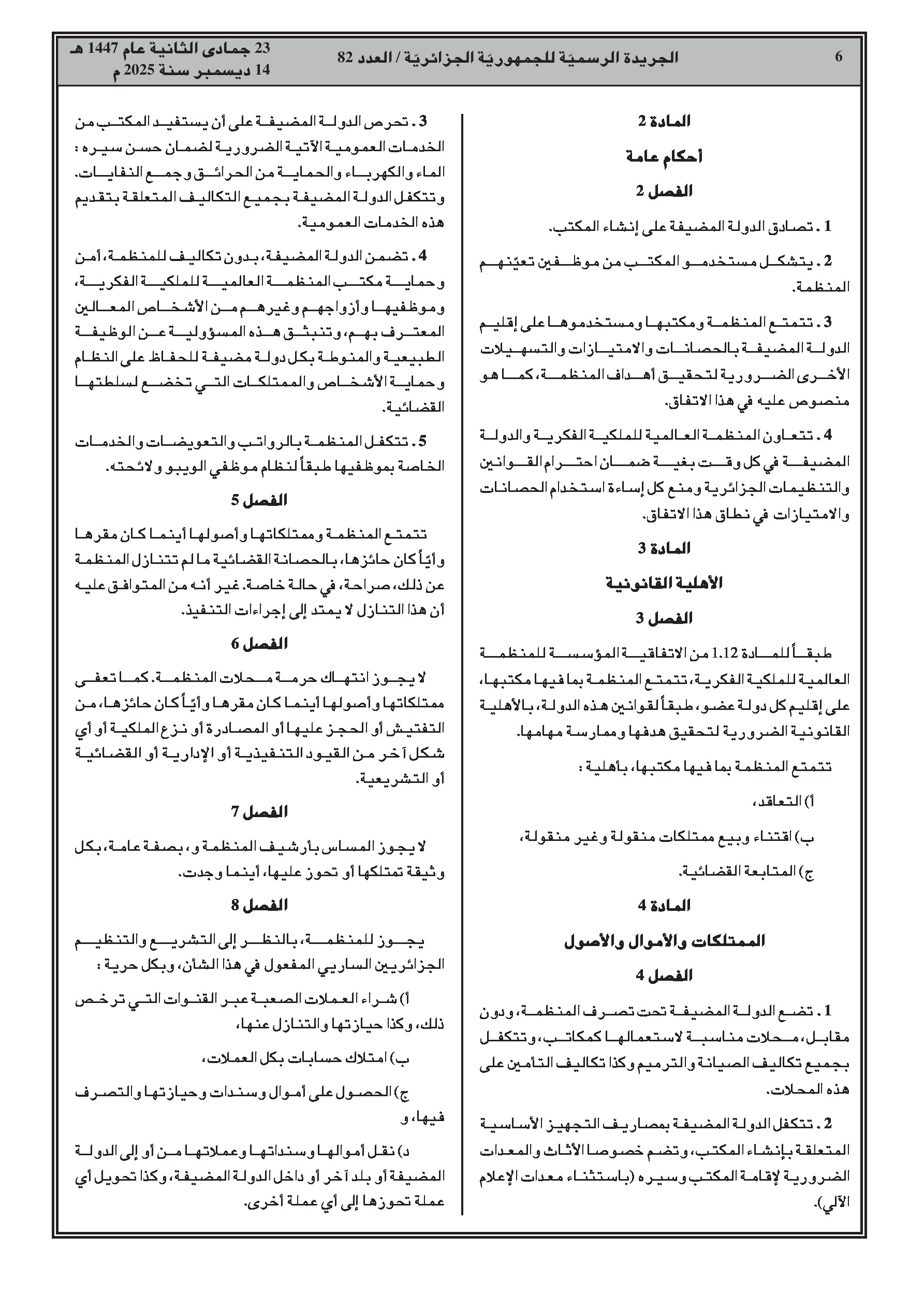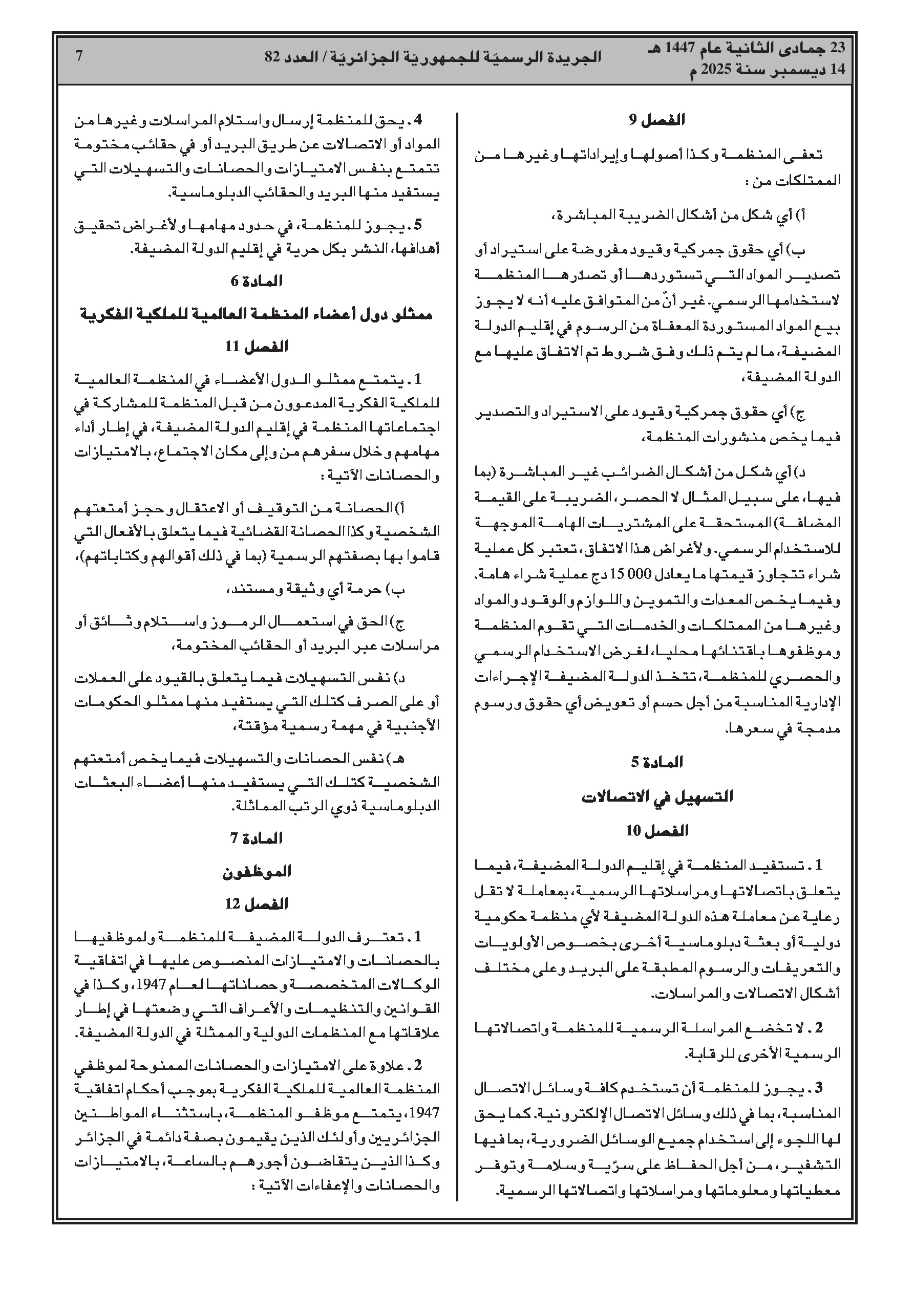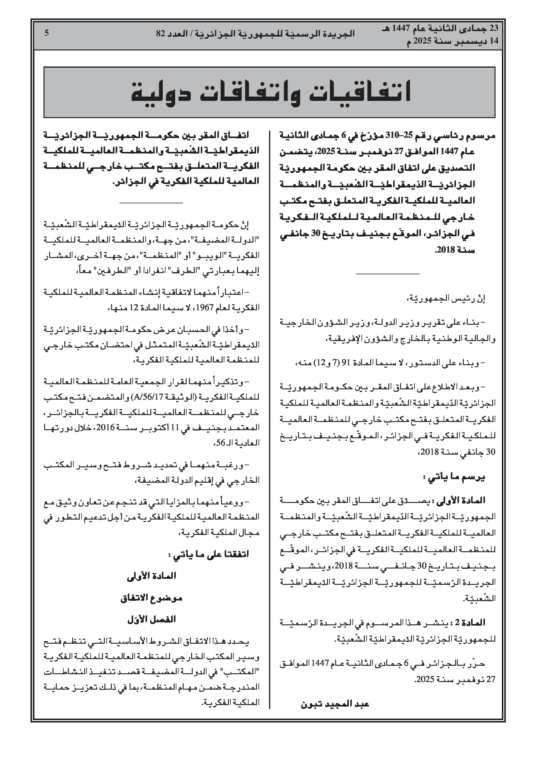 المصادقة على اتفاق المقر بين الجزائر والمنظمة العالمية للملكية الفكرية لإنشاء مكتب خارجي للمنظمة في الجزائر.
