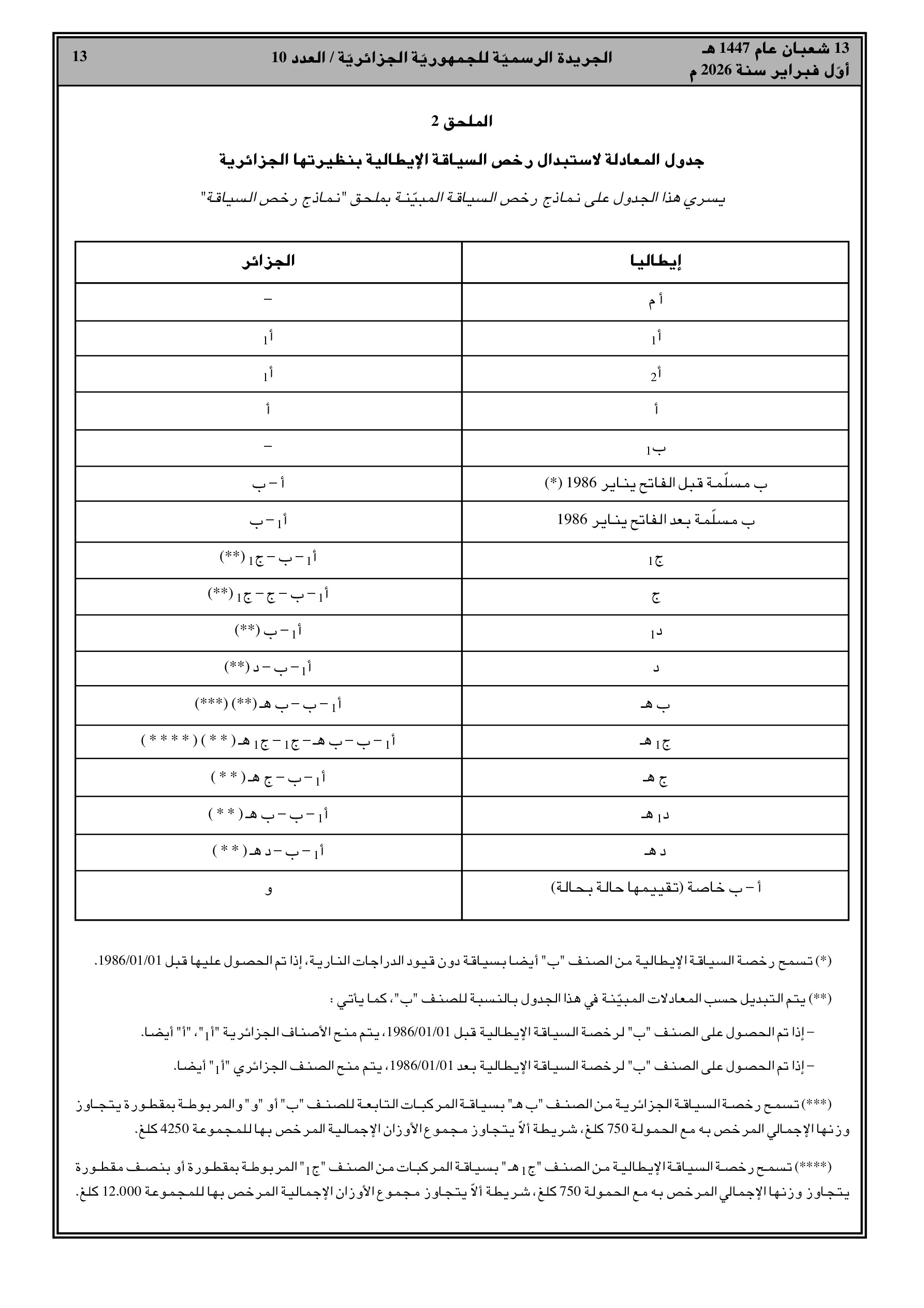 تحديد جداول المعادلة بين أصناف الرخص الجزائرية والإيطالية (الملاحق).