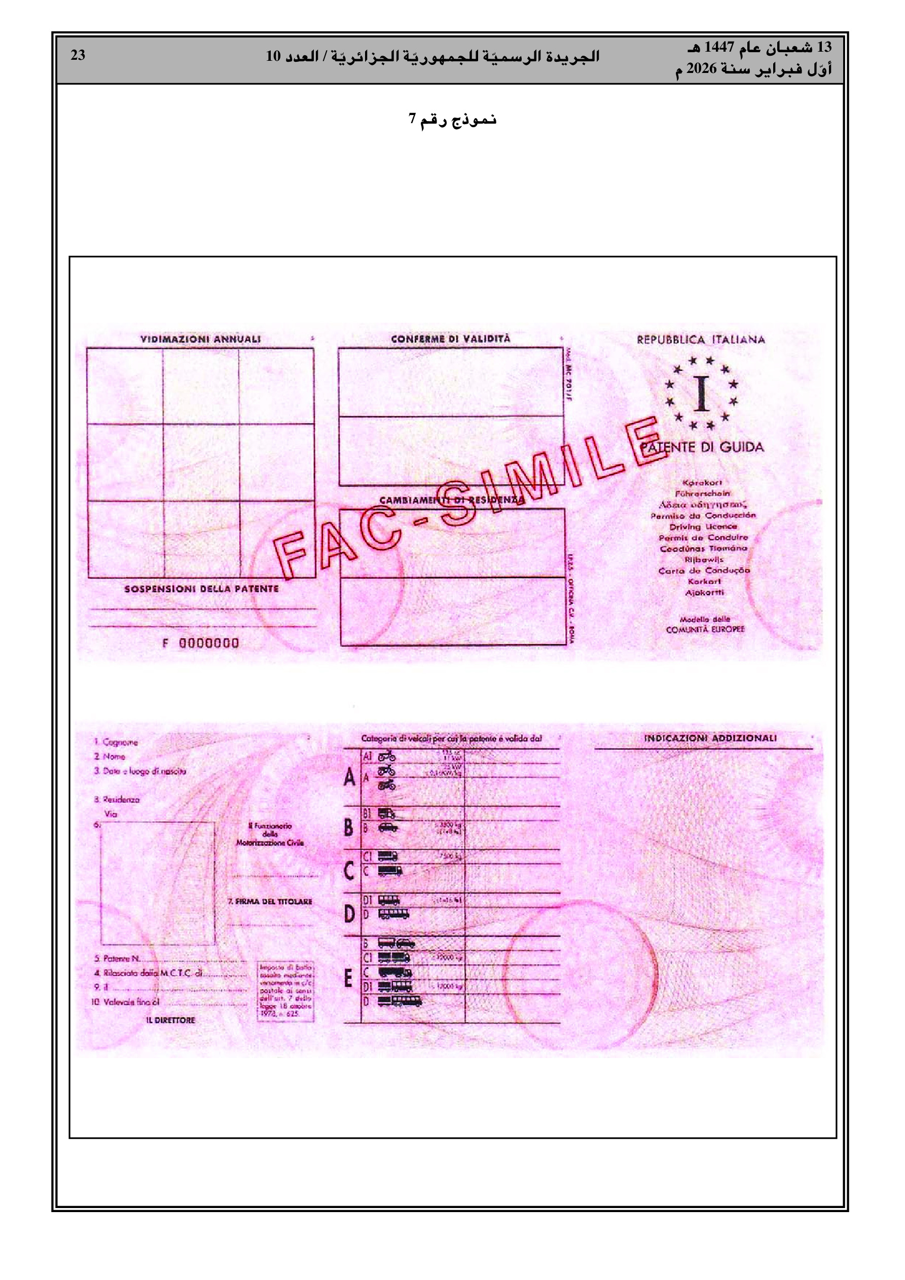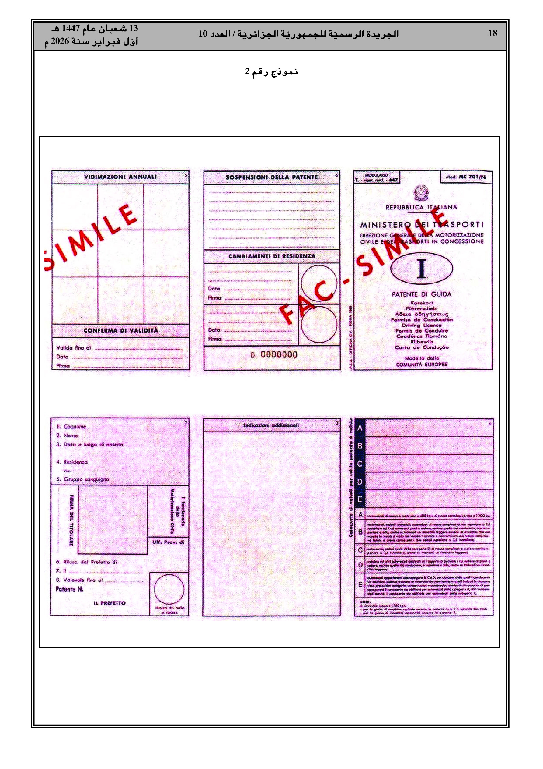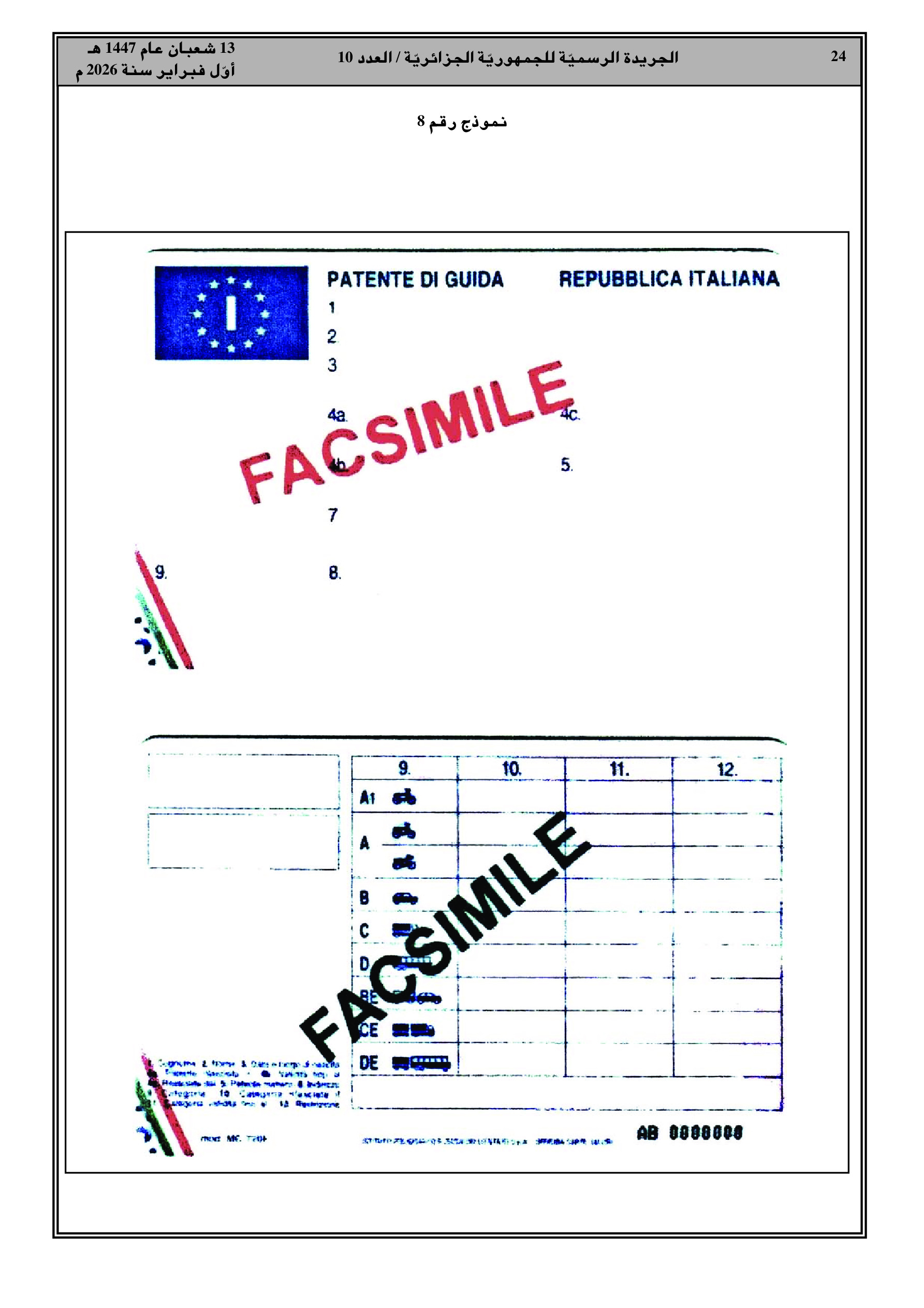 مرسوم رئاسي يصادق على الاتفاقية بين الجزائر وإيطاليا حول الاعتراف المتبادل برخص السياقة واستبدالها.
