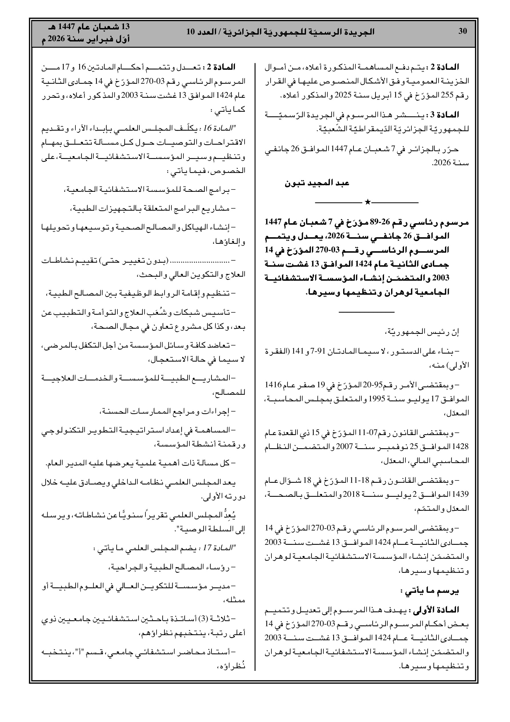 تعديل مرسوم إنشاء وتنظيم المؤسسة الاستشفائية الجامعية بوهران لتعزيز هياكلها العلمية والإدارية.