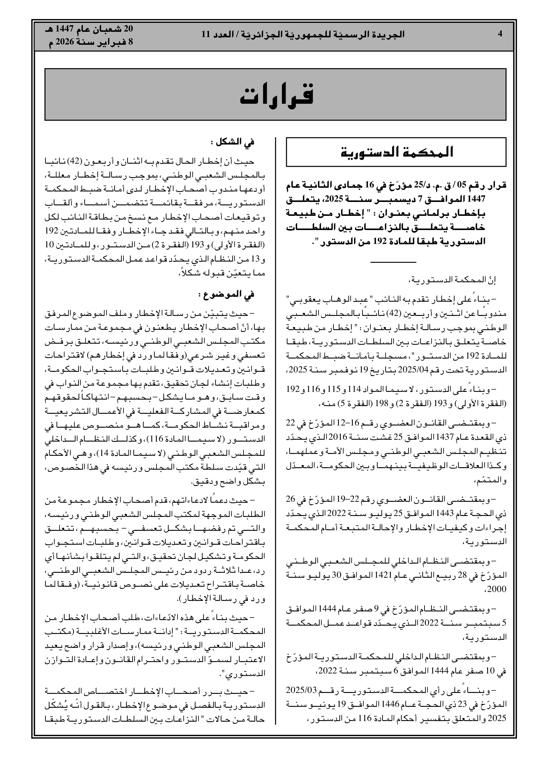المحكمة الدستورية ترفض إخطاراً قدمه نواب حول خلافات مع مكتب المجلس الشعبي الوطني لعدم الاختصاص.