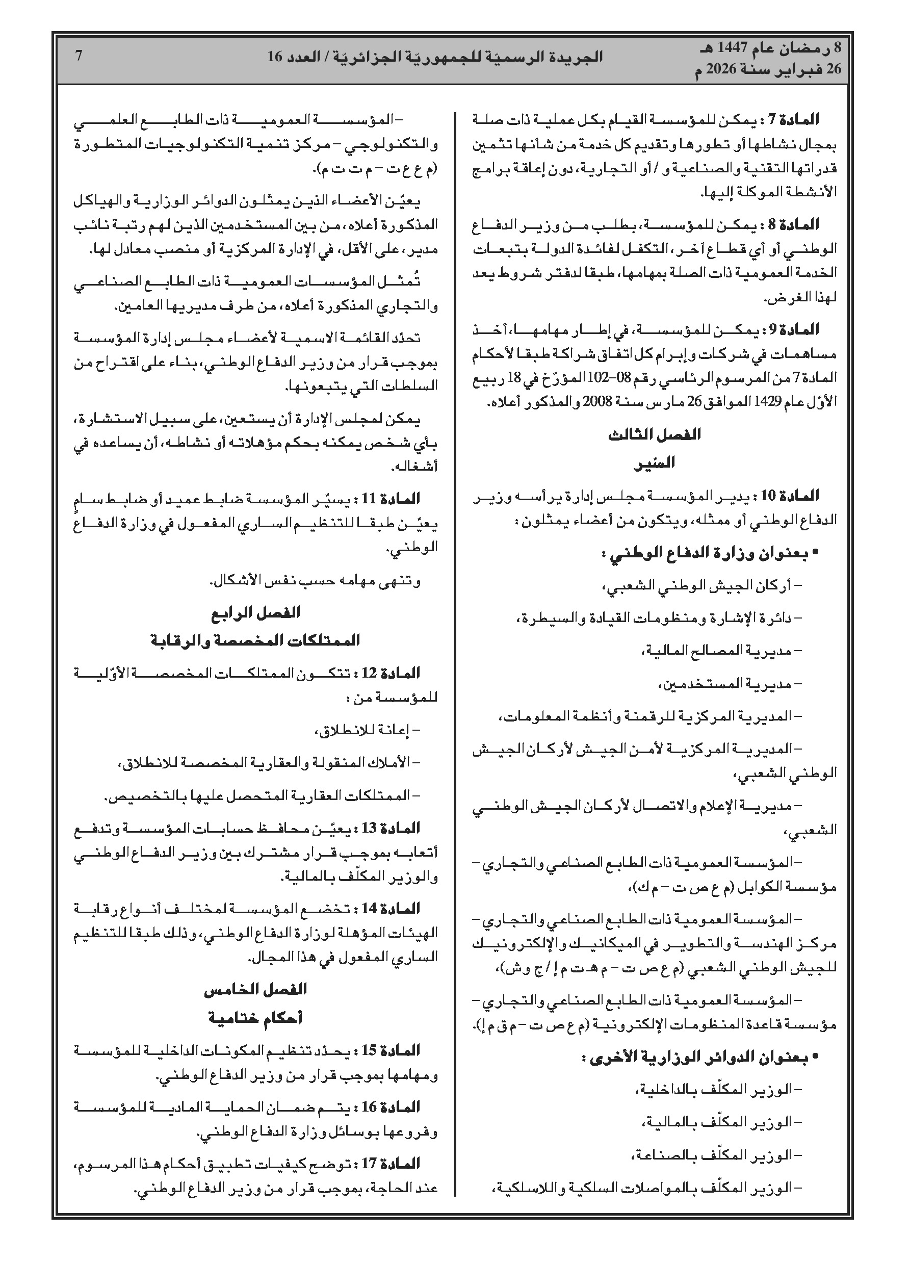 مراسيم رئاسية تقضي بإنشاء ثلاث مؤسسات عمومية ذات طابع صناعي وتجاري تحت وصاية وزارة الدفاع الوطني.