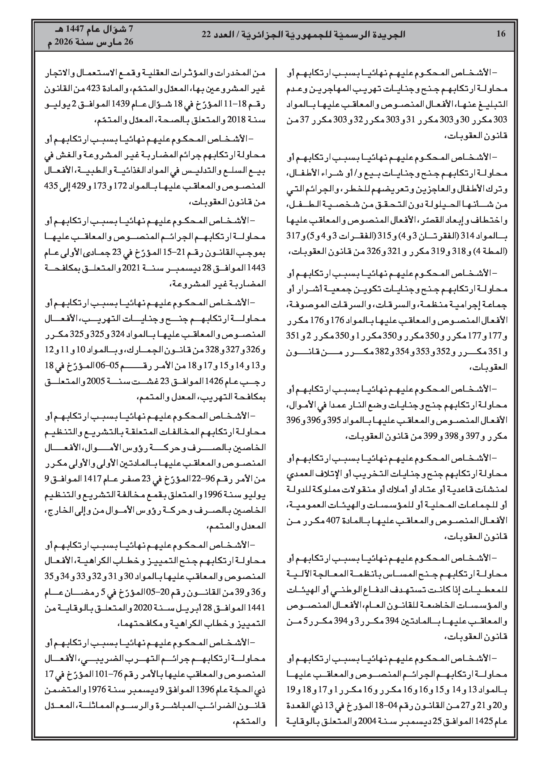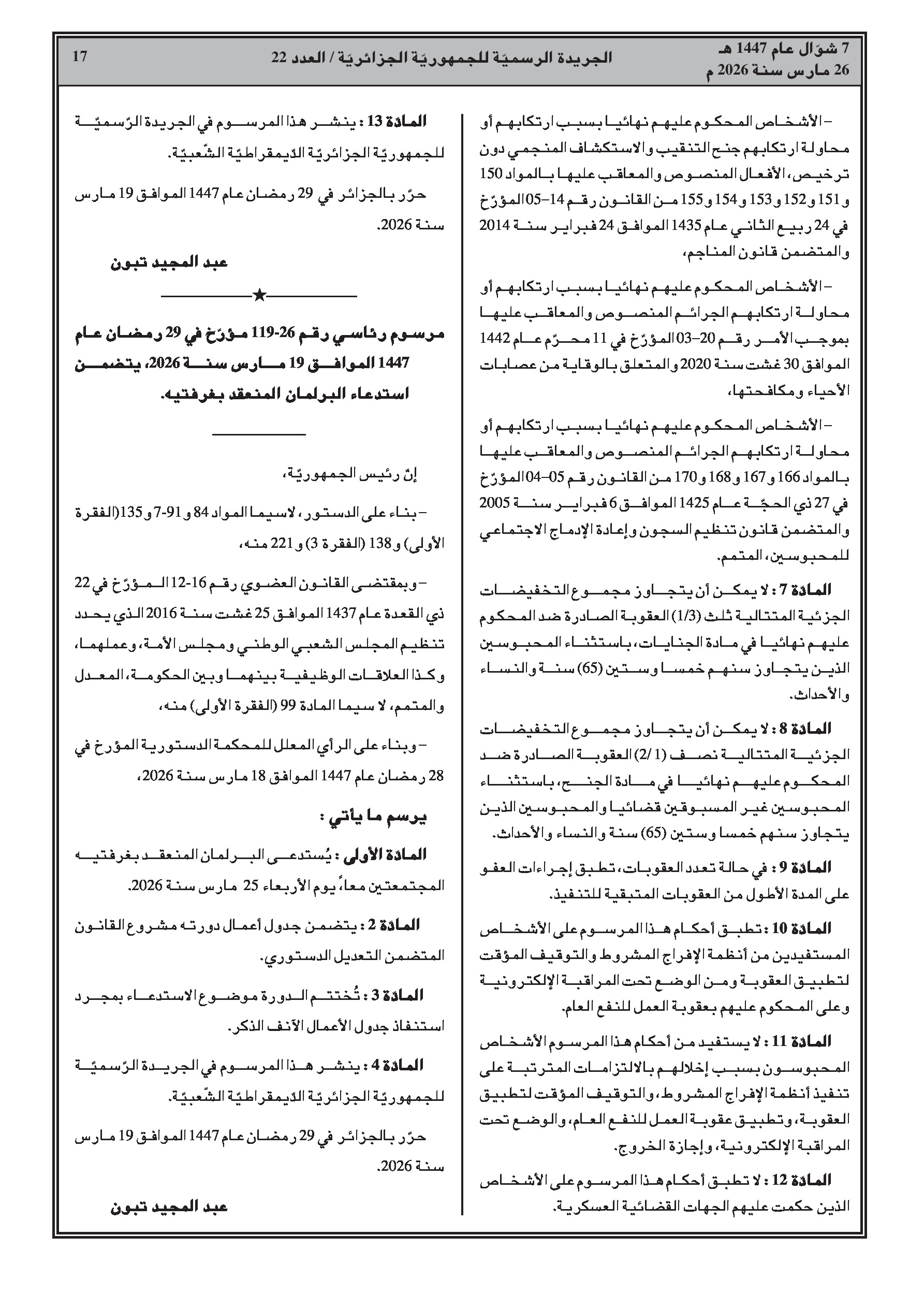 مرسوم رئاسي يتضمن تدابير عفو لصالح الأشخاص المحبوسين وغير المحبوسين المحكوم عليهم نهائيا بمناسبة عيد الفطر المبارك، مع استثناء المدانين في جرائم خطيرة محددة.