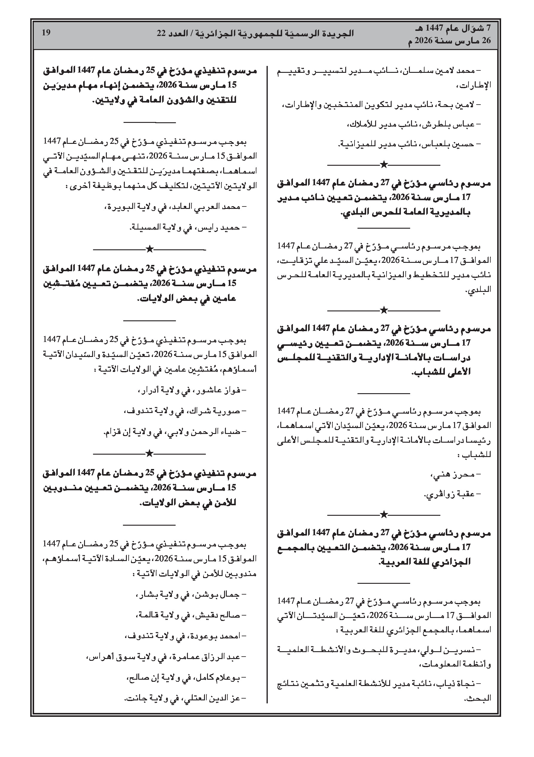 - حركية وتعيينات لمفتشين ومدراء في الإدارات المحلية ومختلف الوزارات.