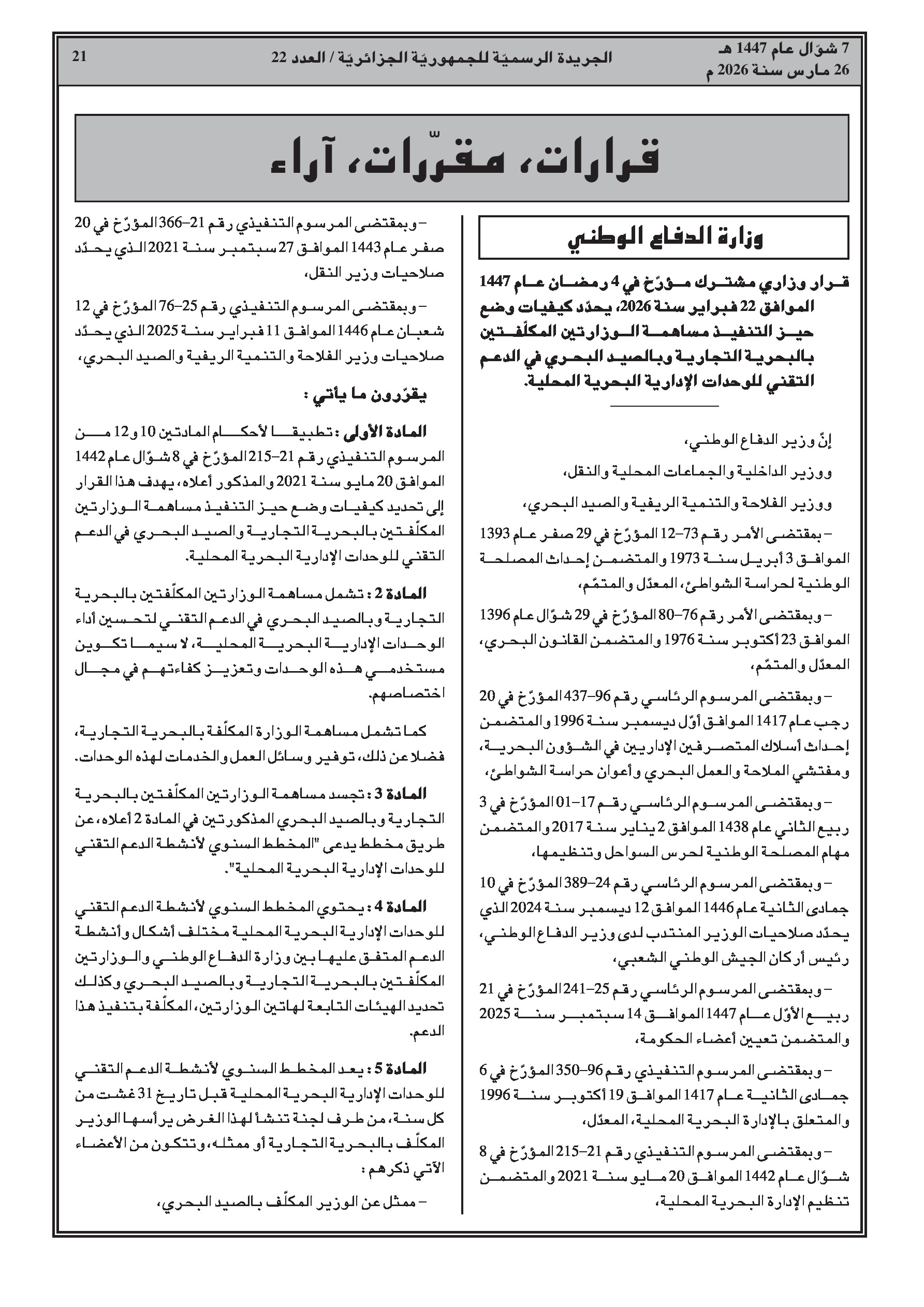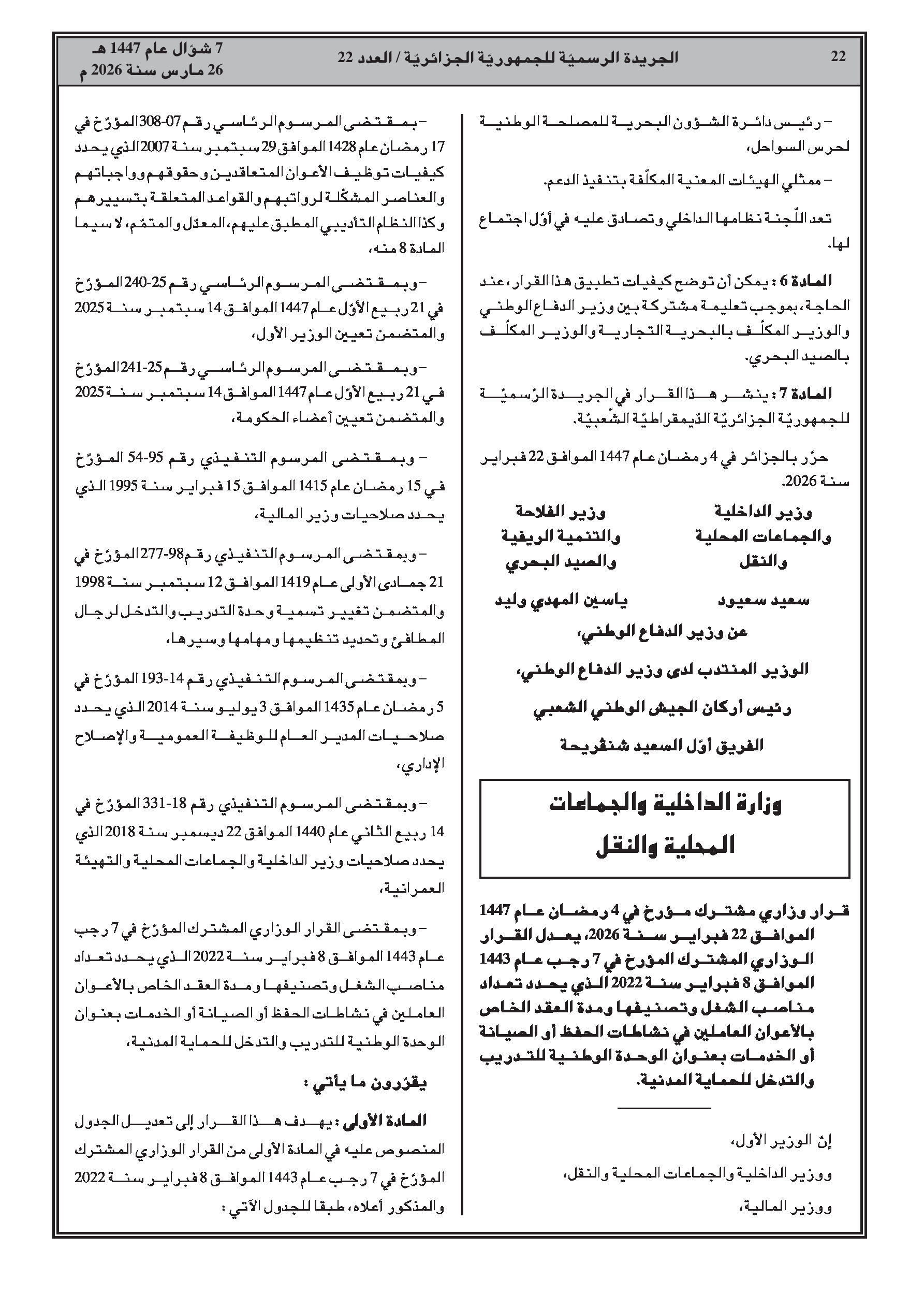 - تحديد نسب مساهمة البلديات والولايات في صندوق التضامن والضمان للجماعات المحلية لسنة 2026.