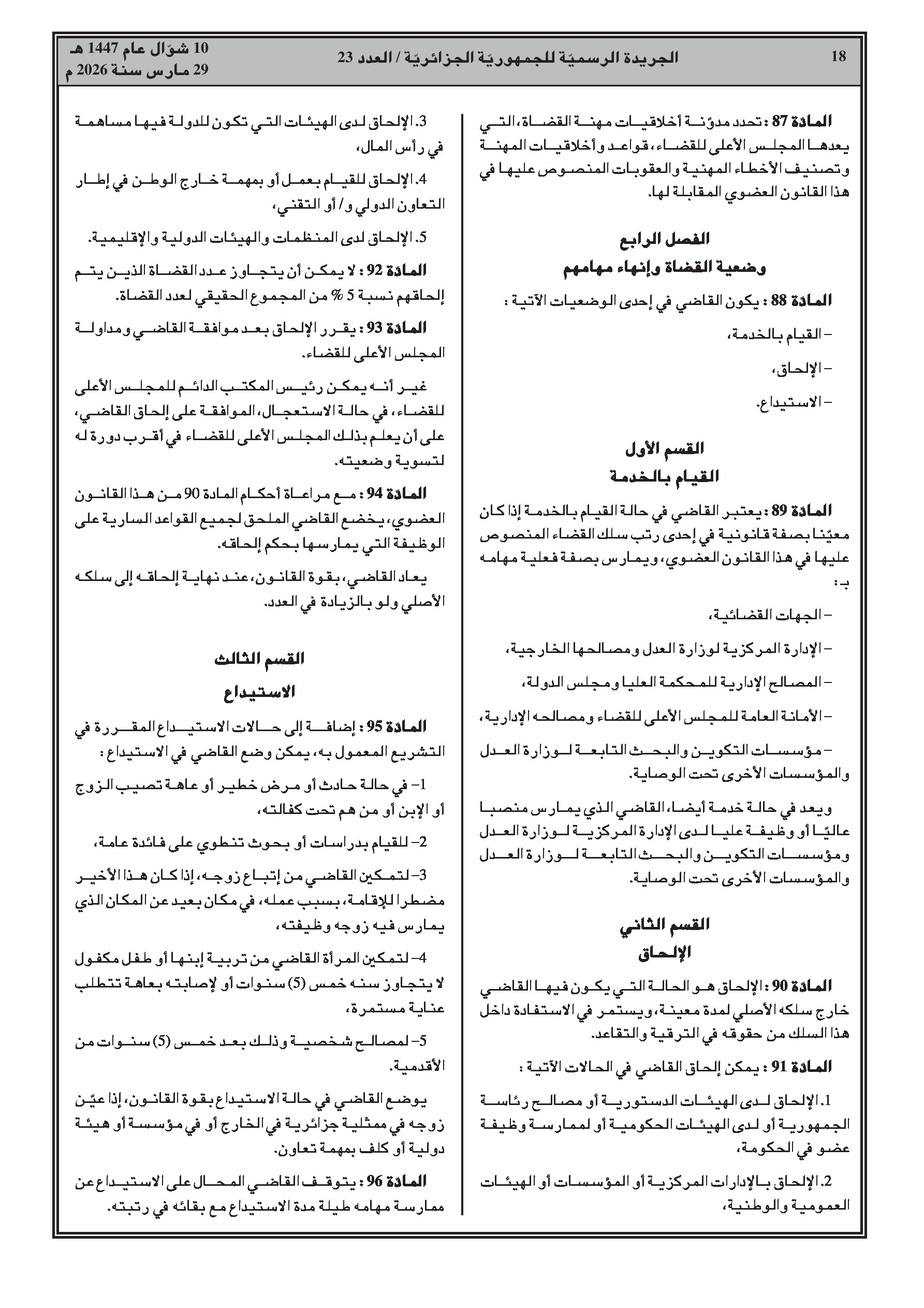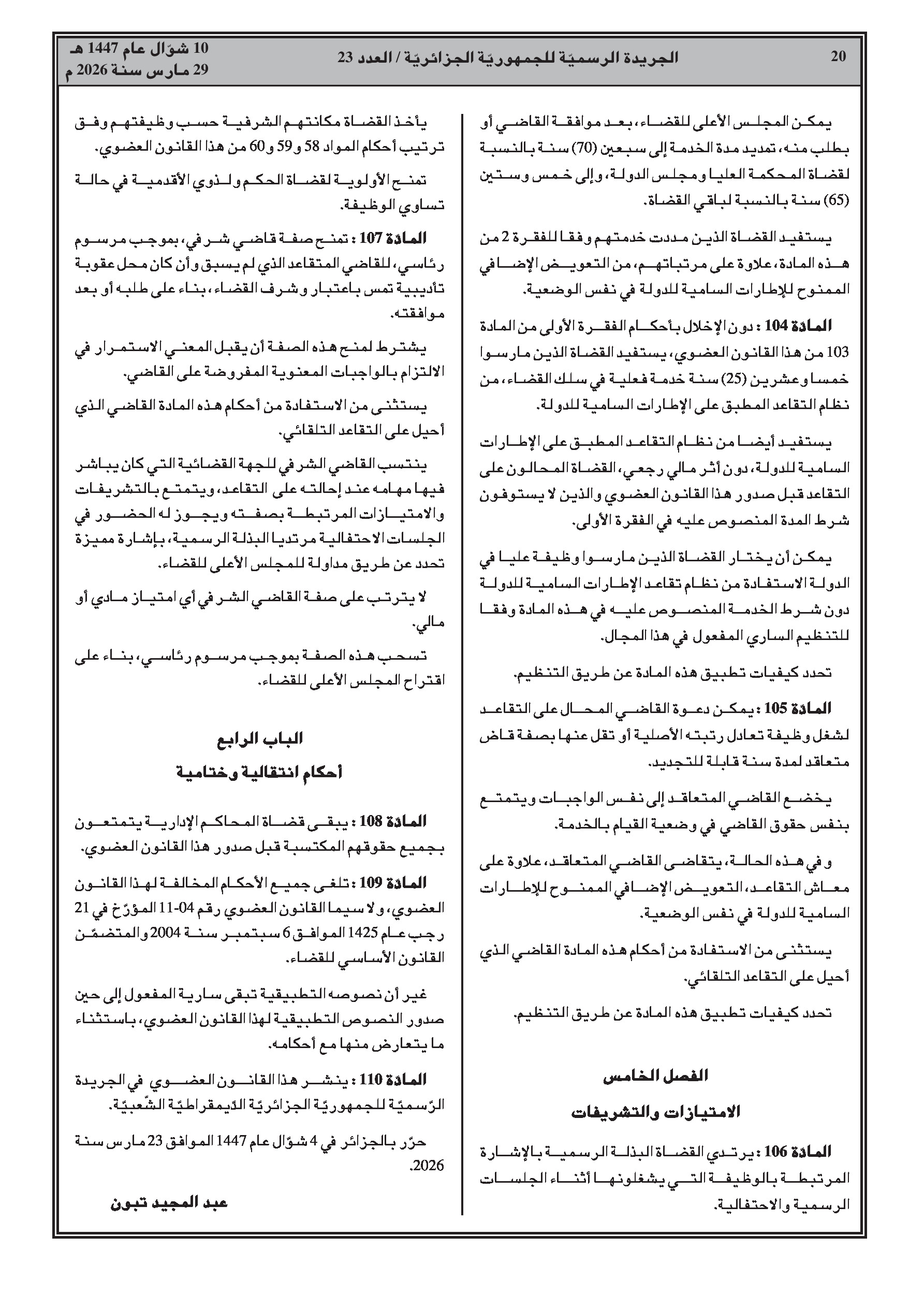 صدور القانون العضوي المتضمن القانون الأساسي للقضاء بعد مصادقة المحكمة الدستورية.