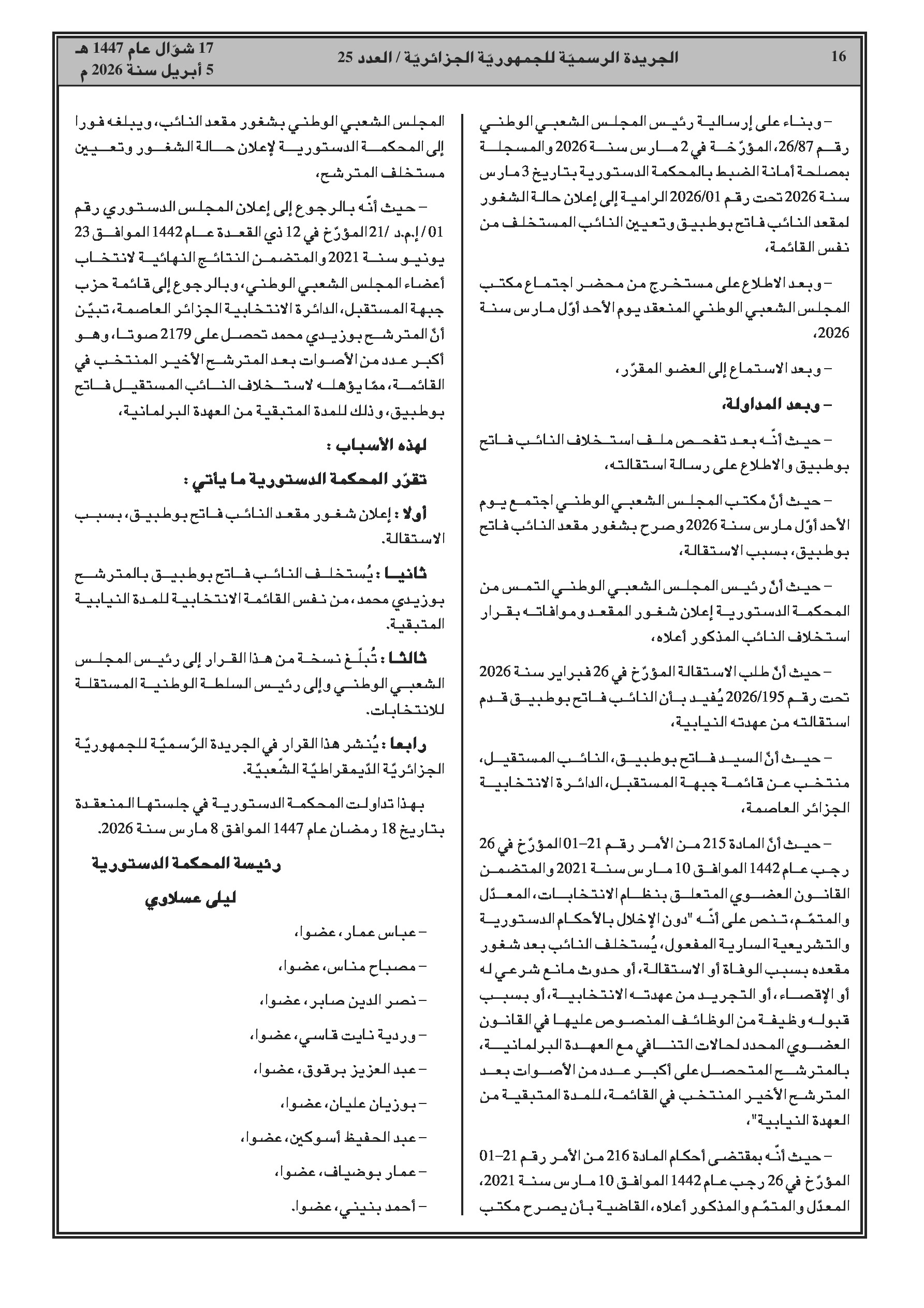 - إعلان شغور مقعد النائب فاتح بوطبيق إثر استقالته من عهدته البرلمانية.