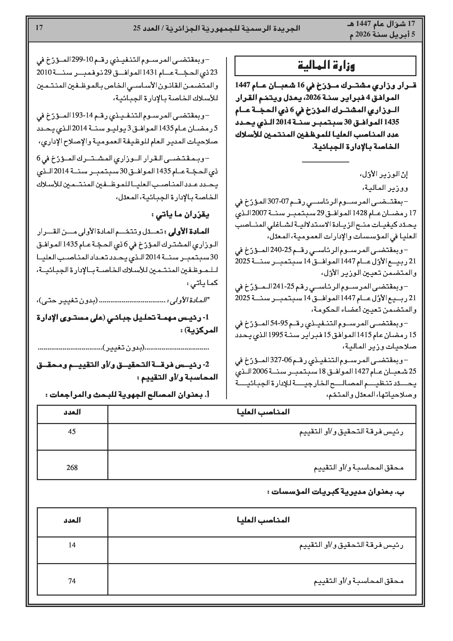 تعديل الهيكل التنظيمي للإدارة المركزية بوزارة المالية وتحديد المناصب العليا في الإدارة الجبائية.
