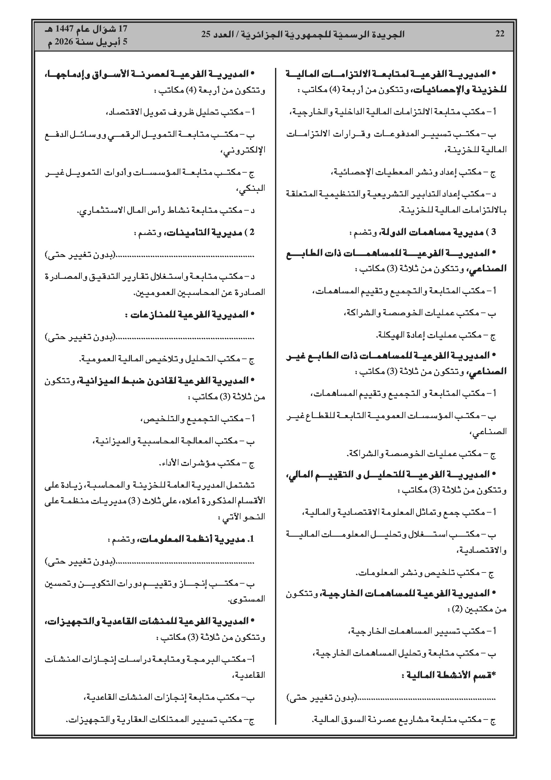 - تنظيم جديد للإدارة المركزية يشمل المديريات العامة للضرائب، الميزانية، الخزينة، والأملاك الوطنية.