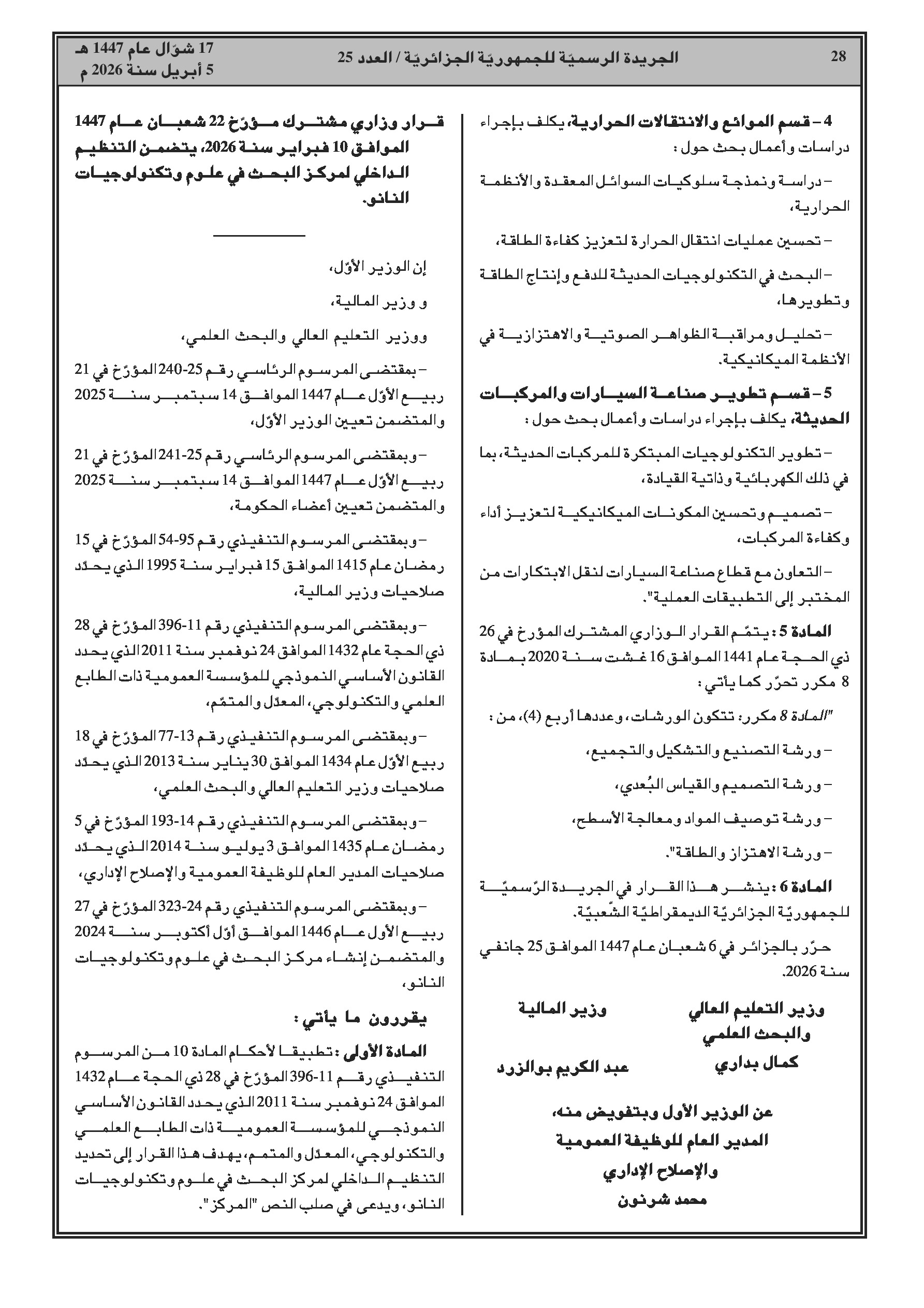 تحديد التنظيم الداخلي لثلاثة مراكز بحث وطنية متخصصة في الميكانيكا، تكنولوجيا النانو، والرياضيات التطبيقية.