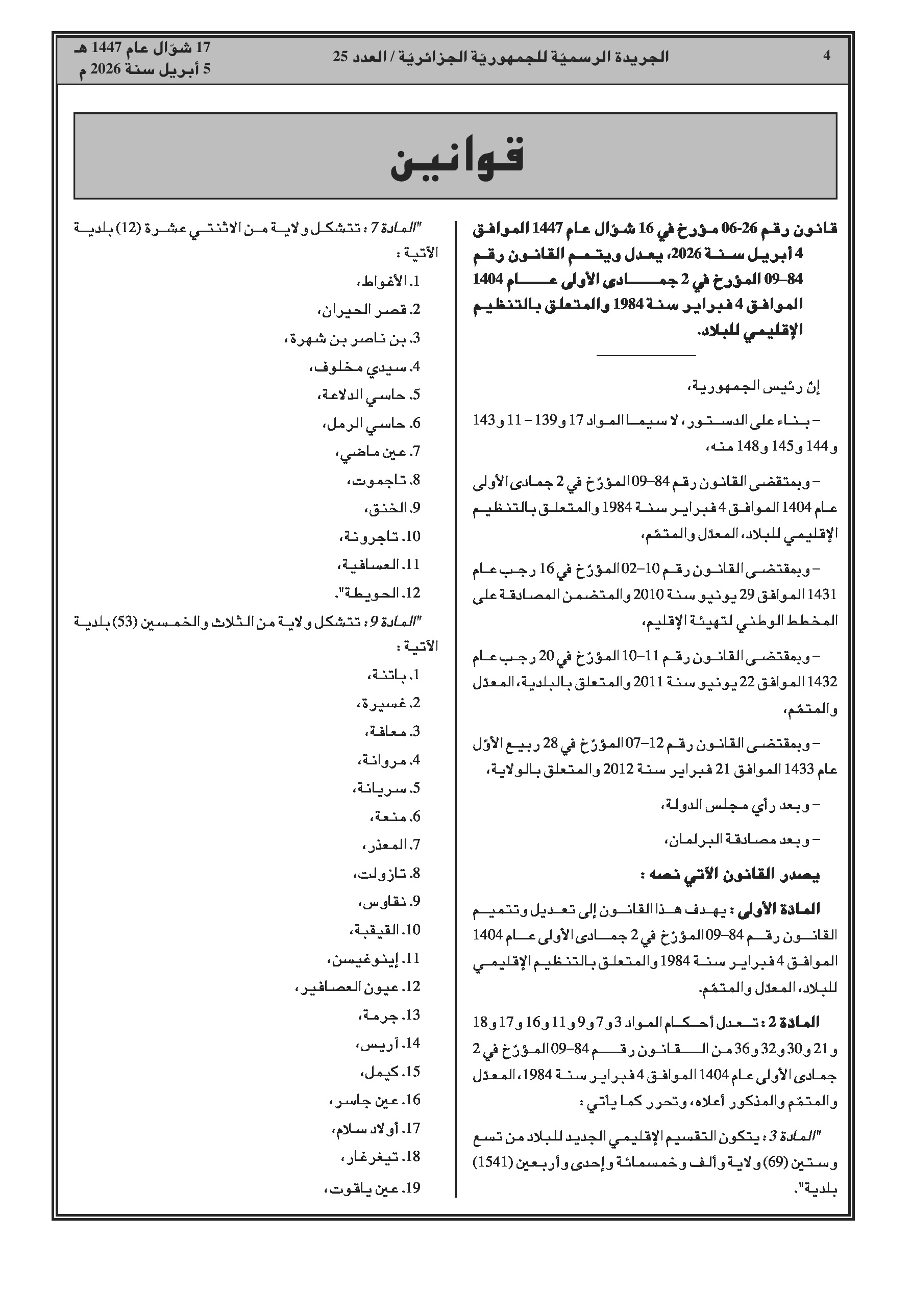 - استمرار الولايات الأم في تسيير شؤون الولايات الجديدة وتغطية ميزانيتها إلى غاية تنصيب أجهزتها بشكل كامل في أجل أقصاه نهاية سنة 2026.