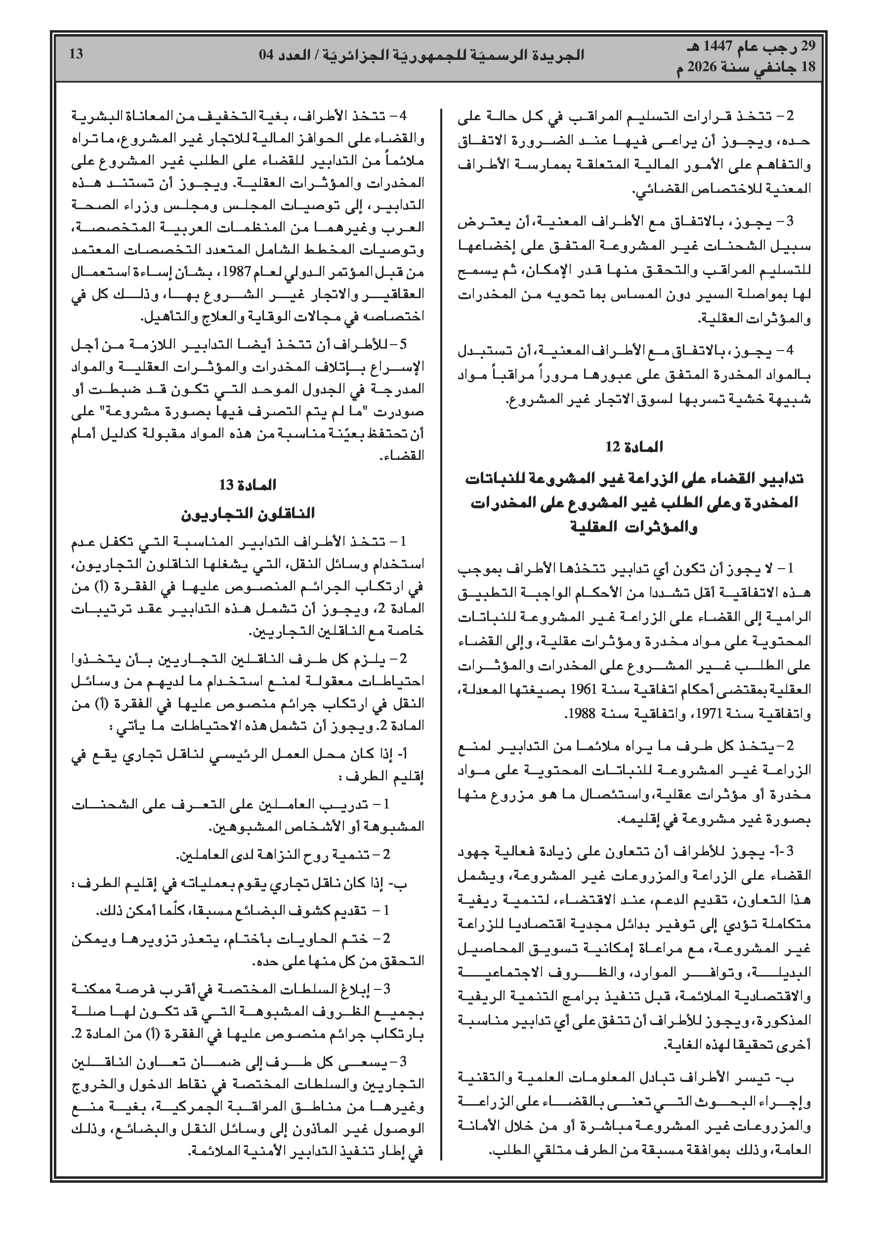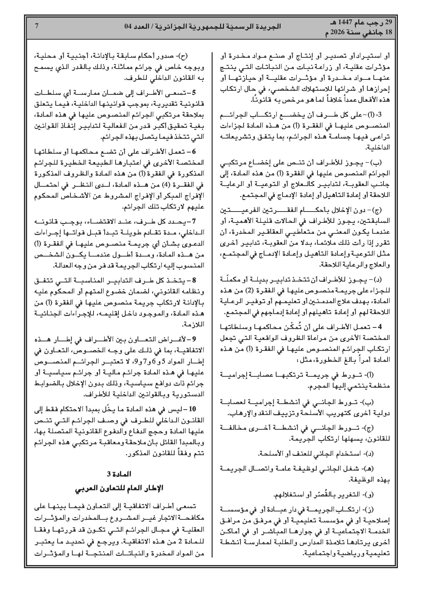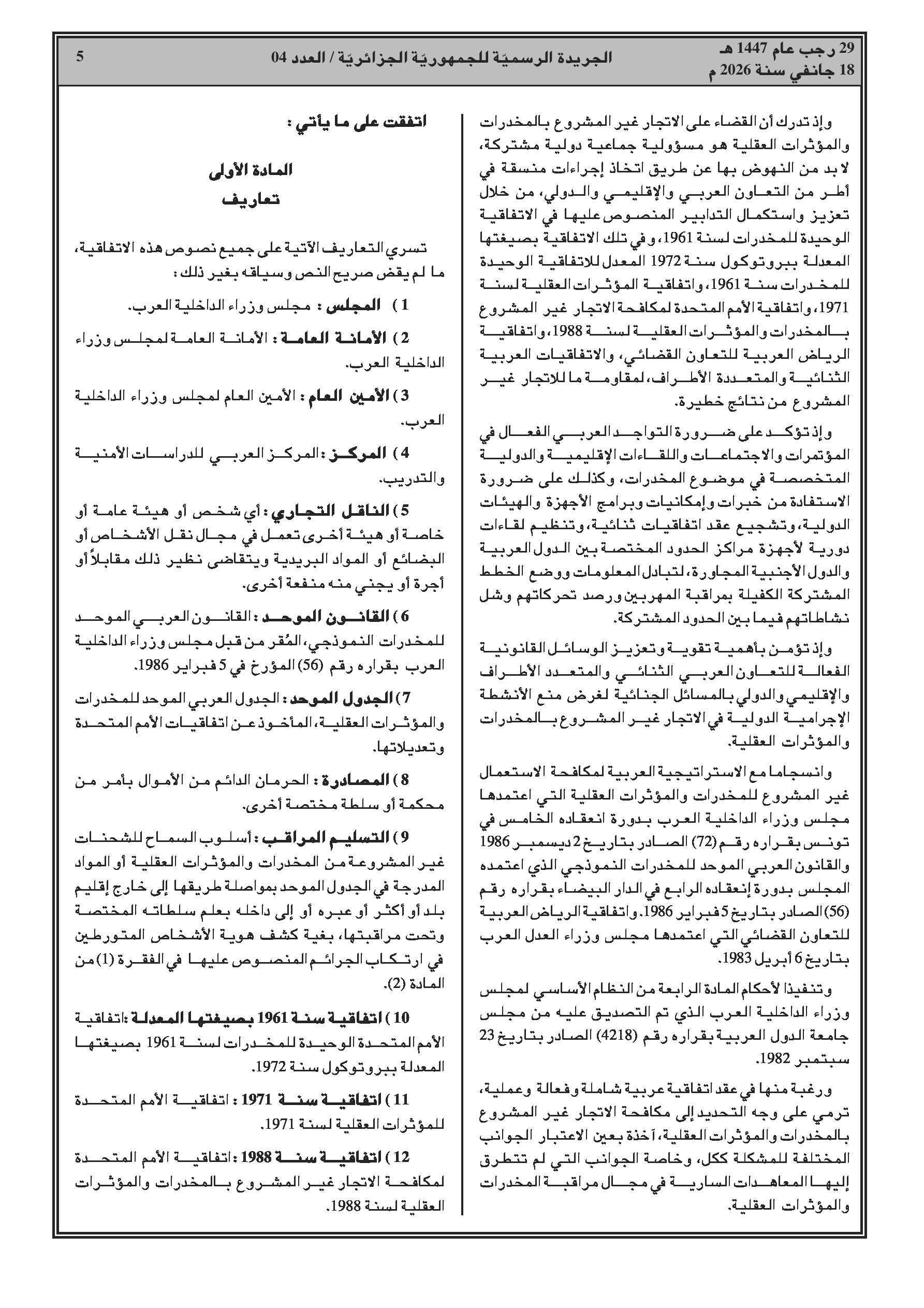 انضمام الجزائر للاتفاقية العربية لمكافحة الاتجار غير المشروع بالمخدرات والمؤثرات العقلية.