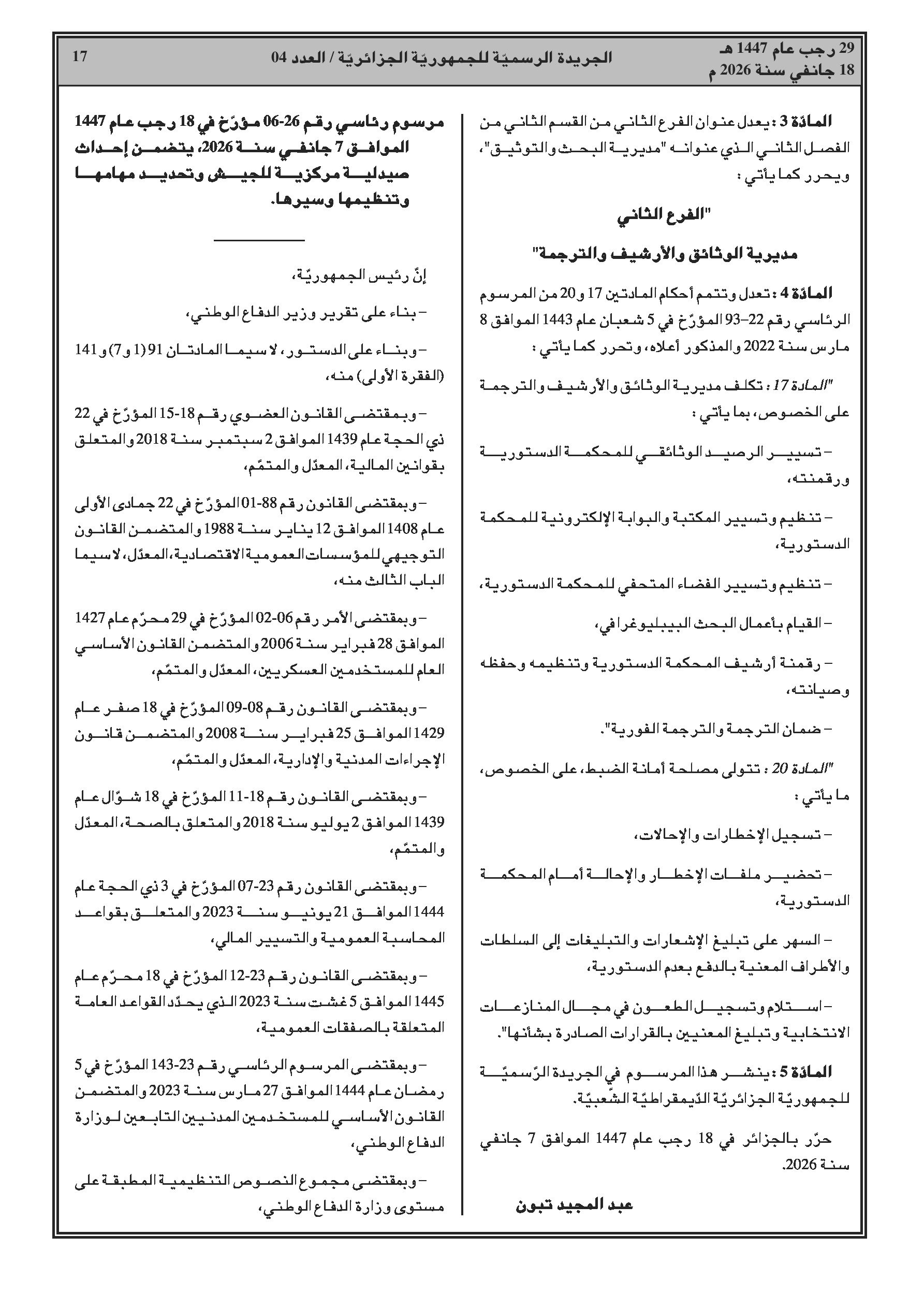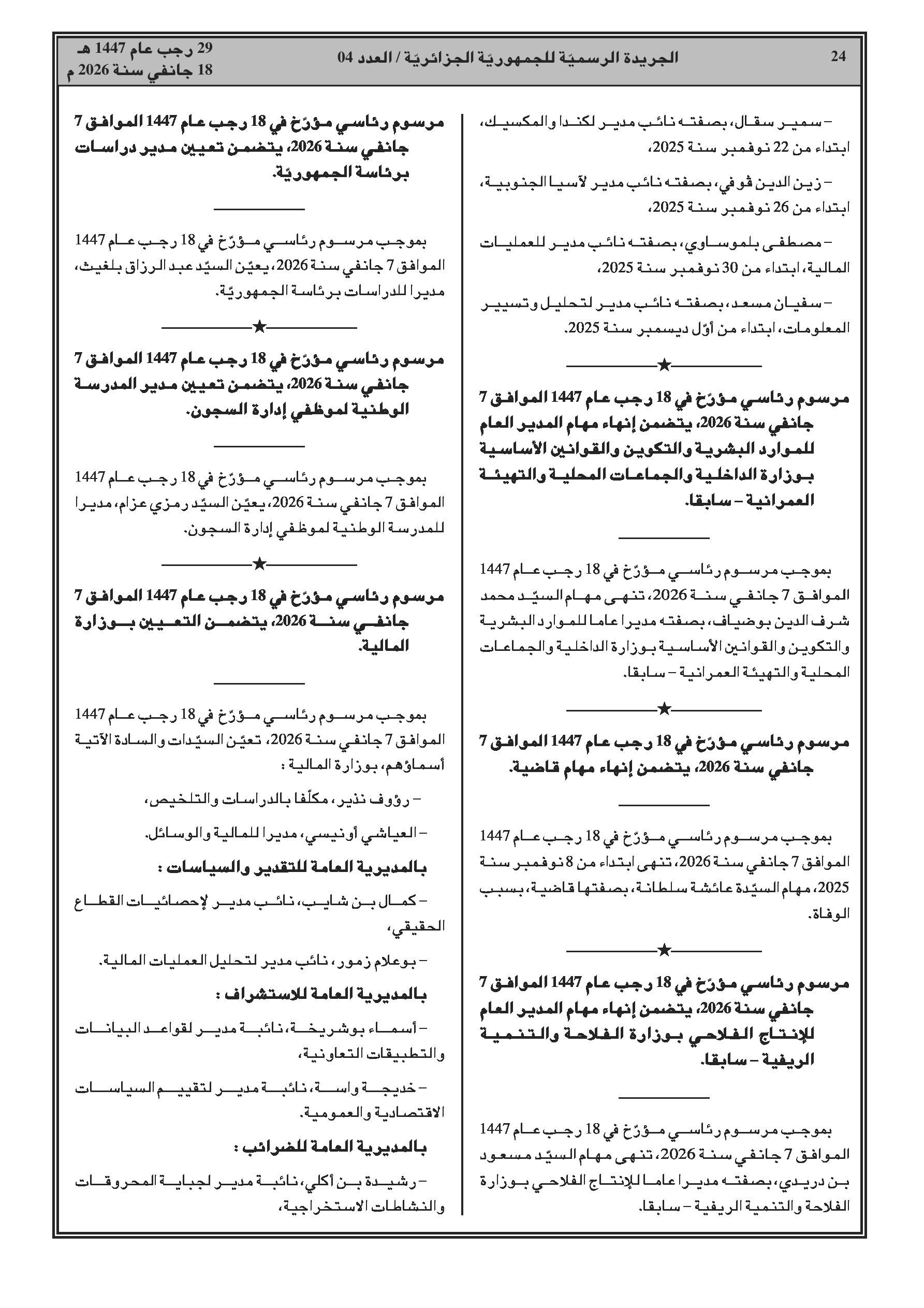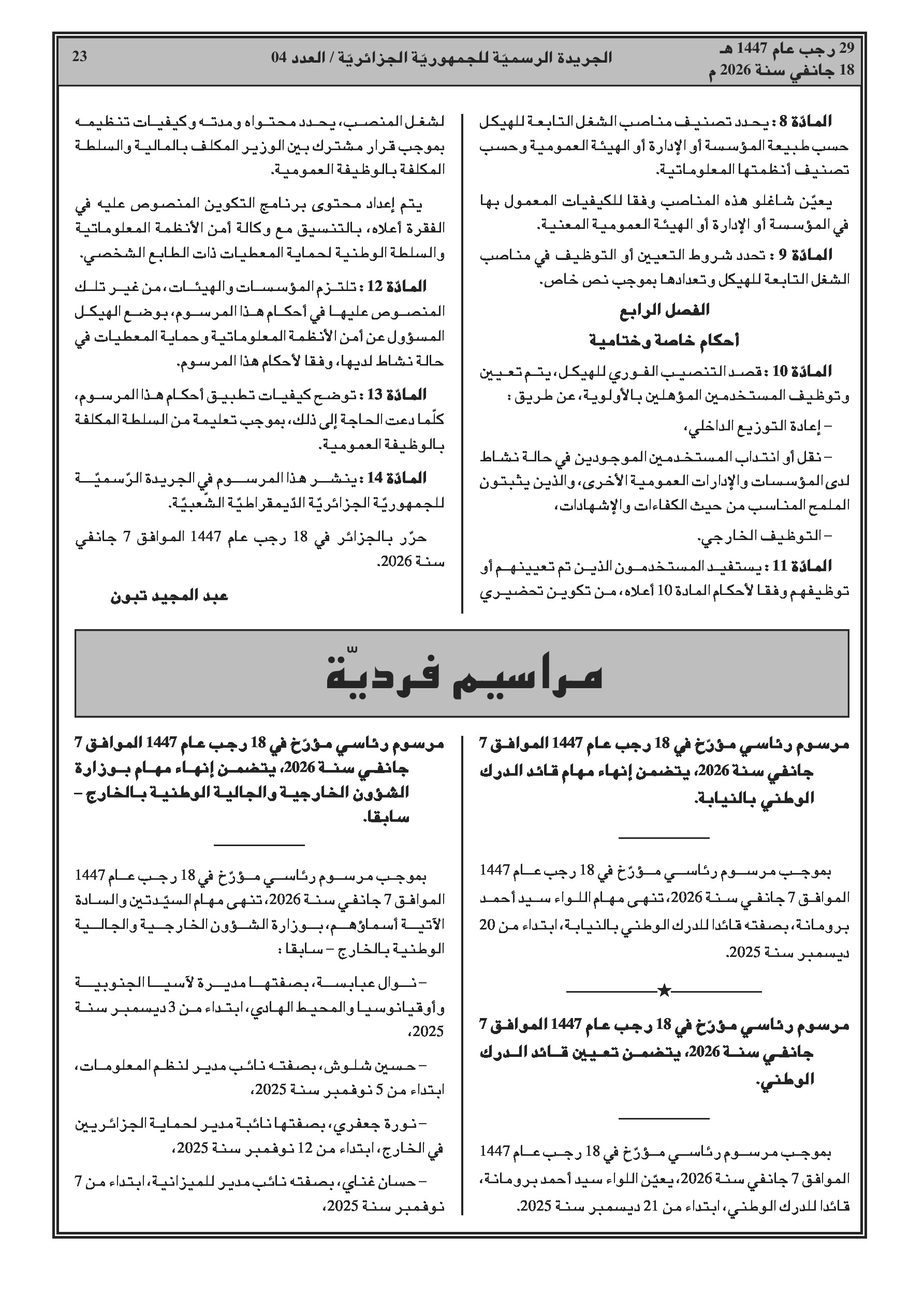 مراسيم رئاسية تتضمن تغييرات في قيادة الدرك الوطني ومناصب عليا في عدة وزارات.