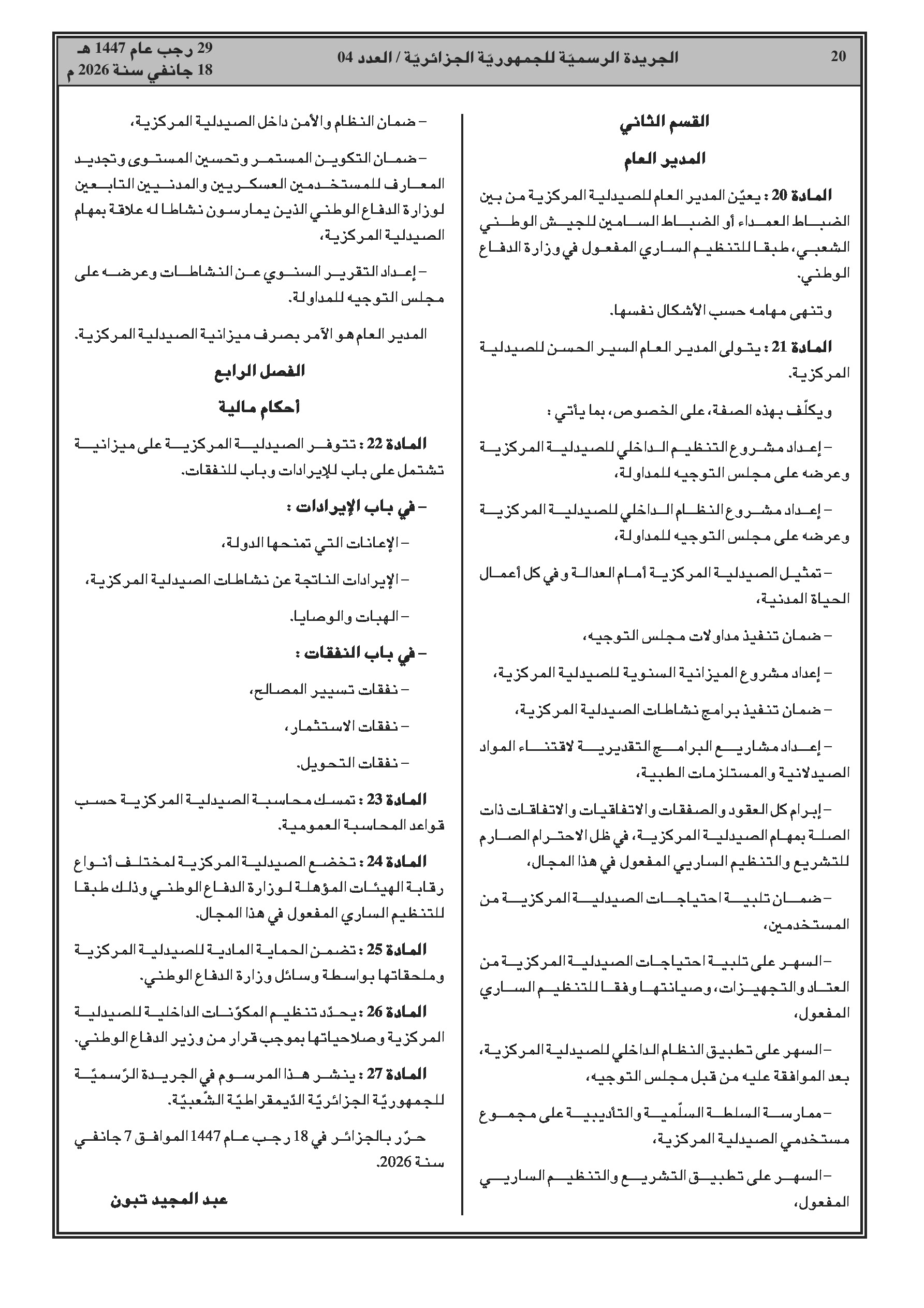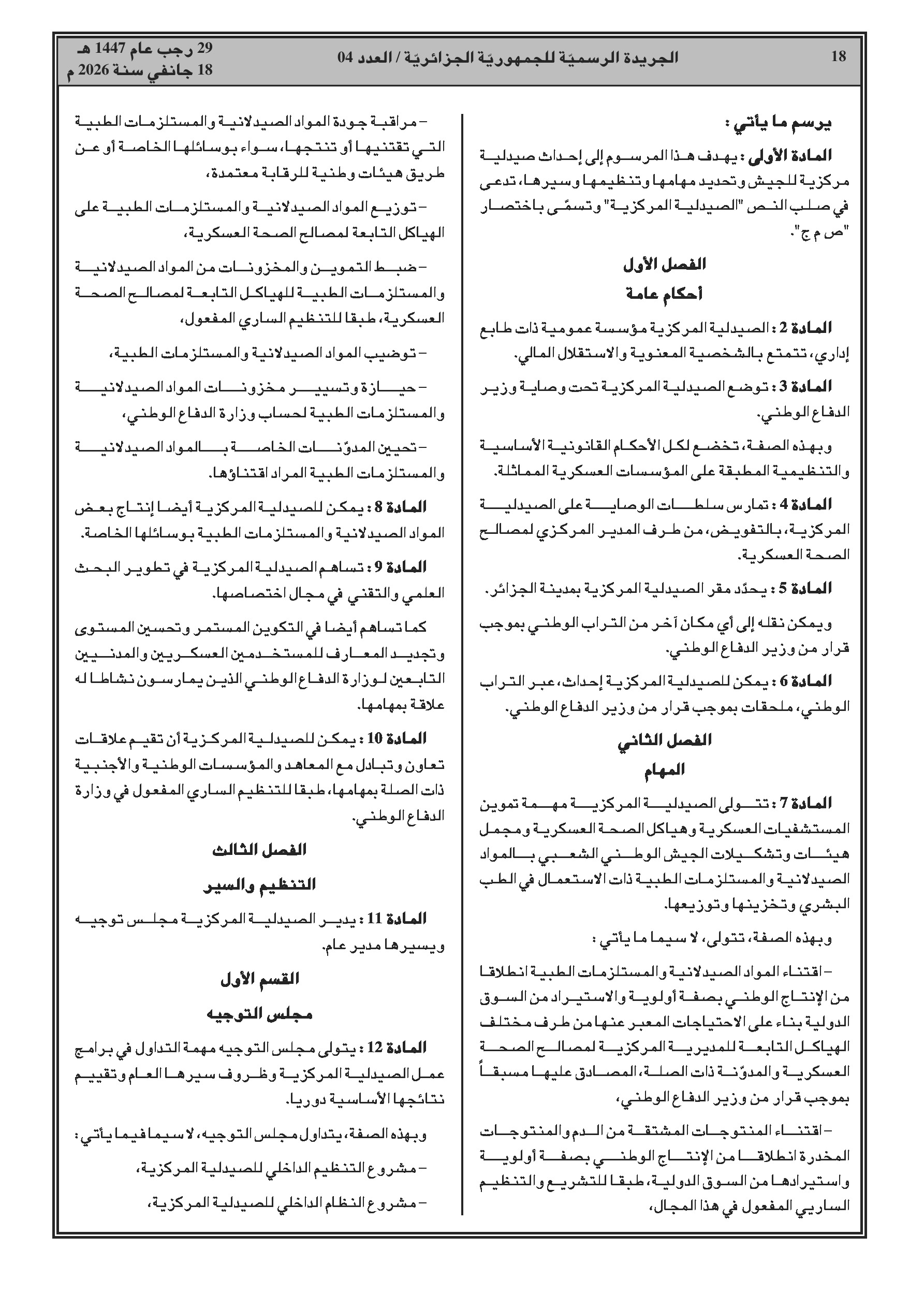 تأسيس مؤسسة عمومية تحت وصاية وزارة الدفاع لتموين الهياكل العسكرية بالأدوية.