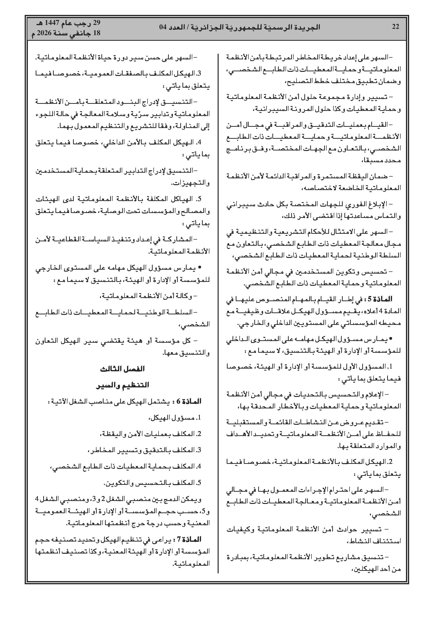 إلزام المؤسسات والإدارات العمومية بإنشاء هيكل مسؤول عن أمن الأنظمة المعلوماتية وحماية البيانات.