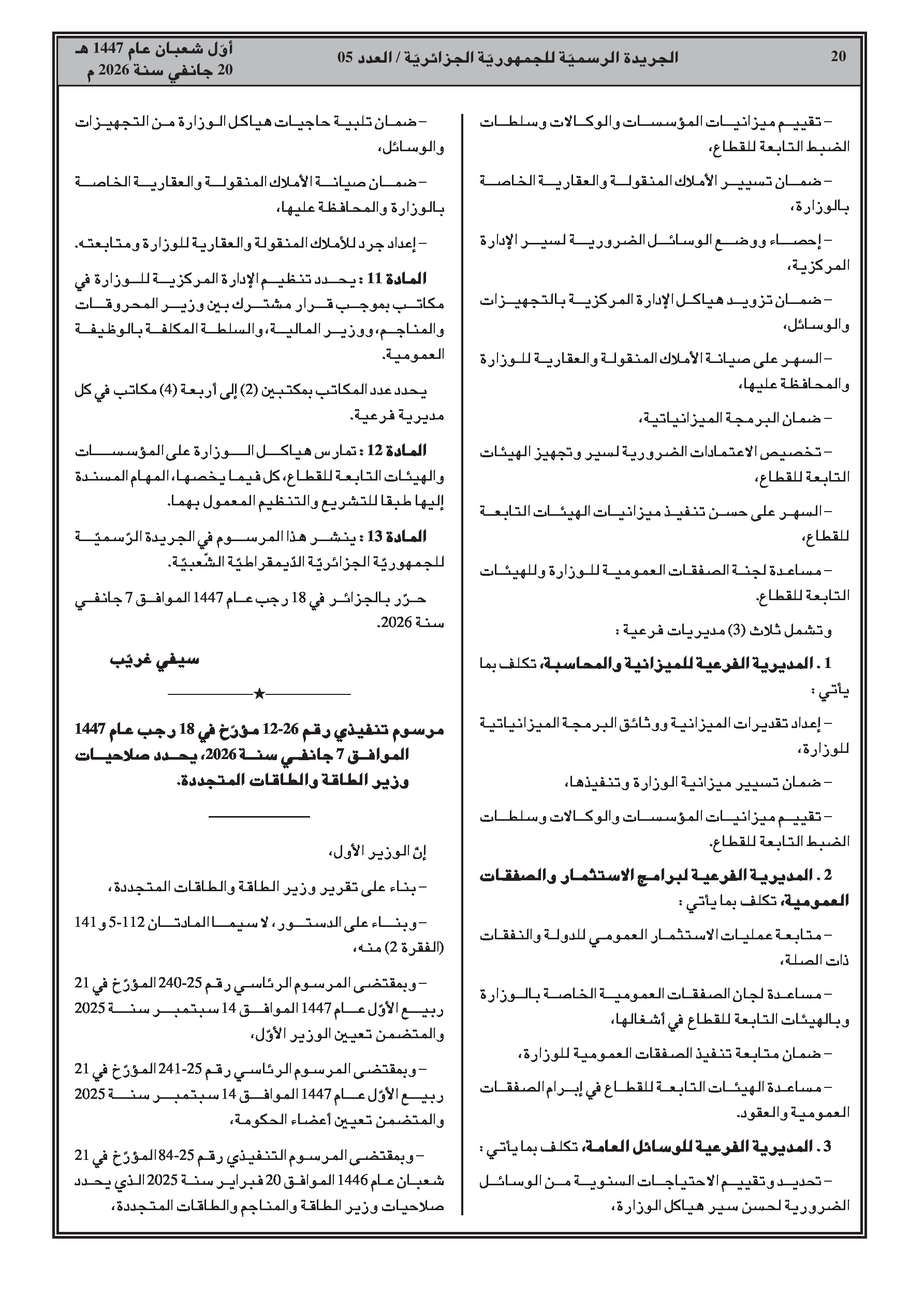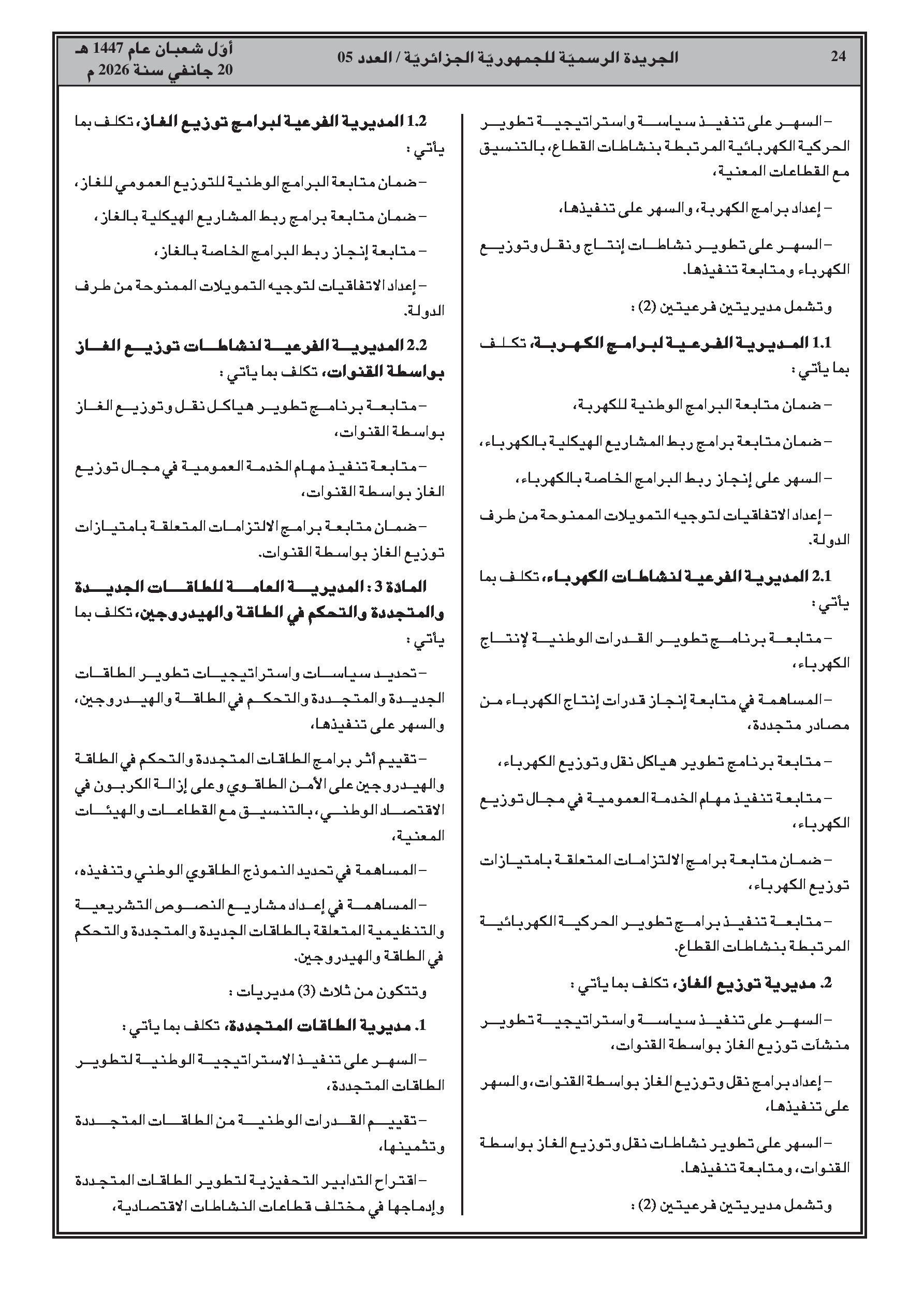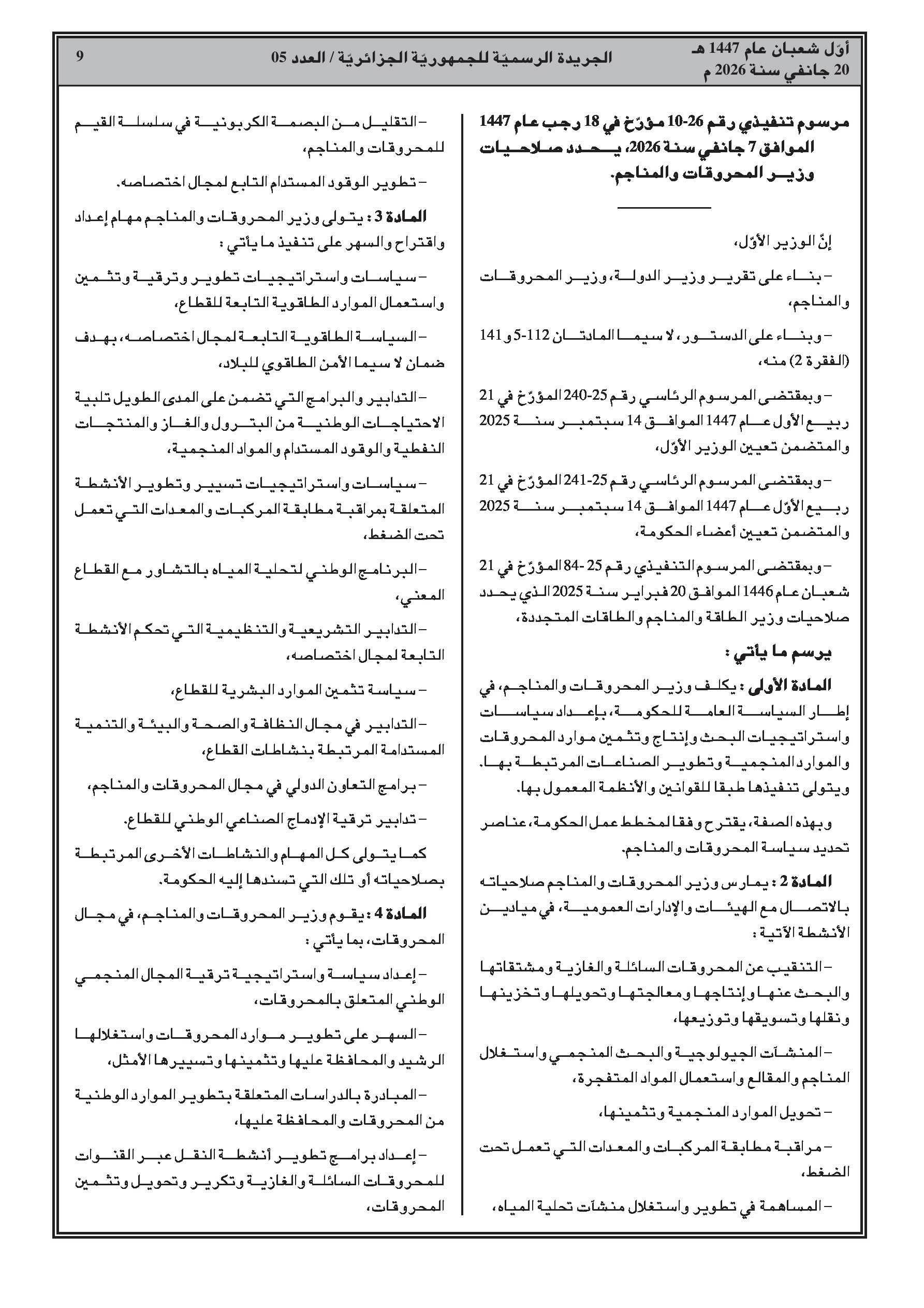 مراسيم تنفيذية تحدد مهام الوزير والهيكل التنظيمي للوزارة مع التركيز على الانتقال الطاقوي.