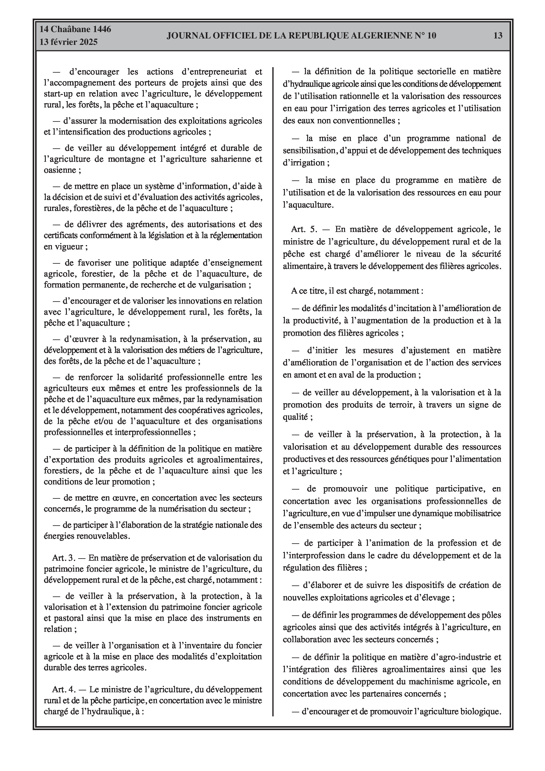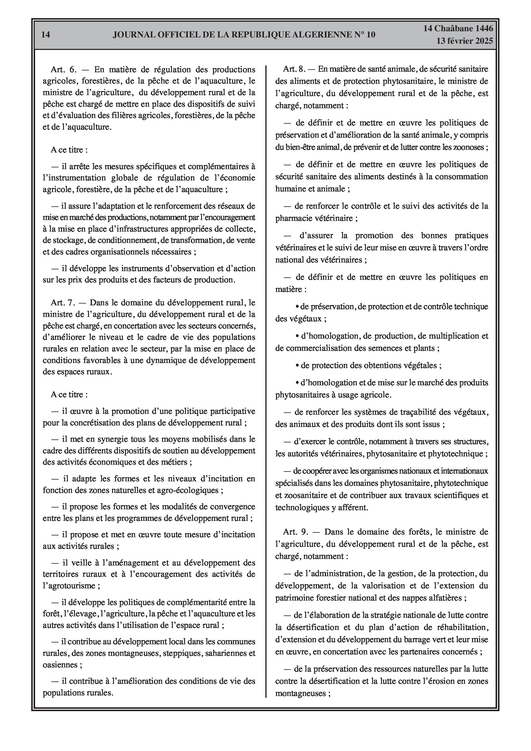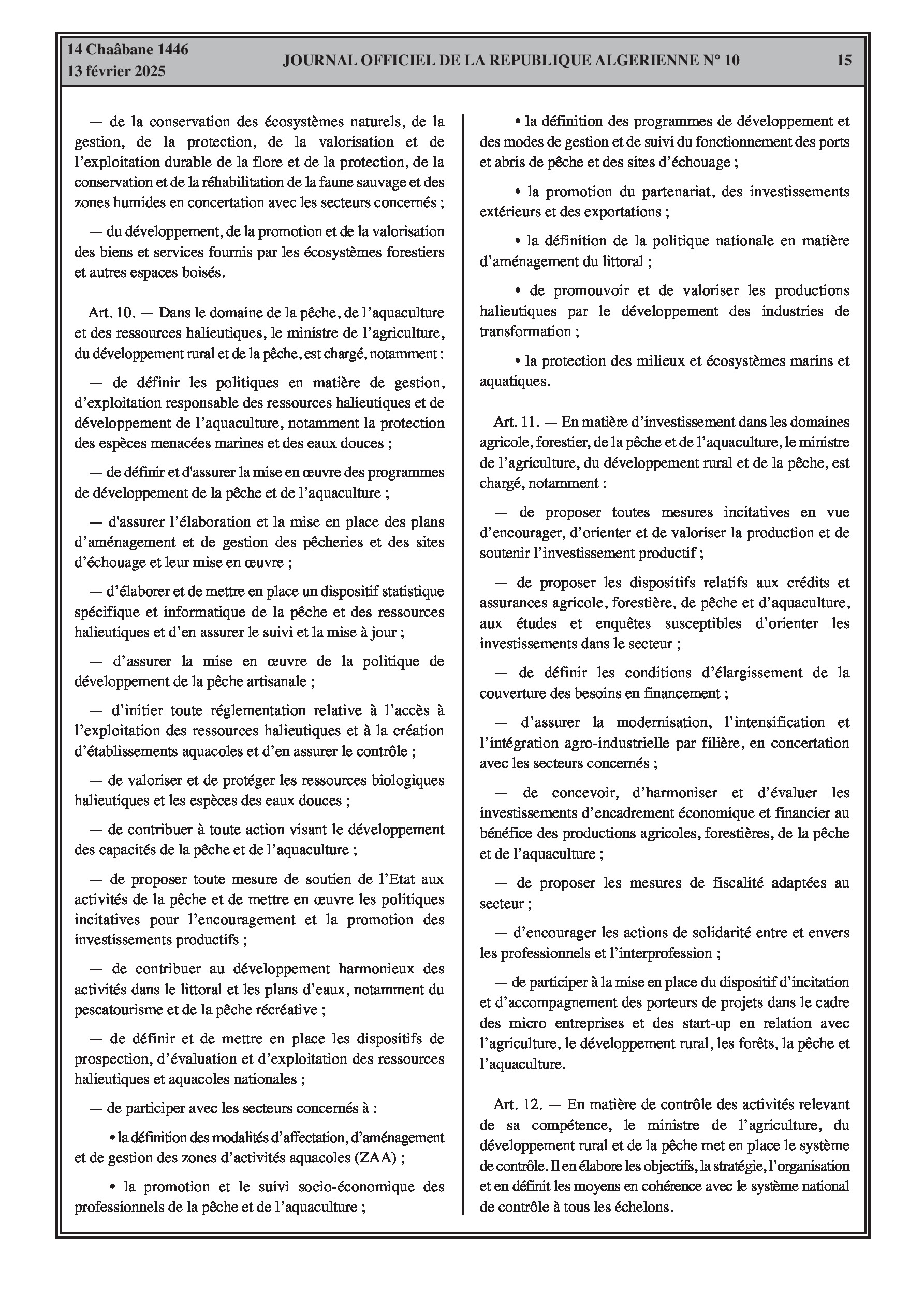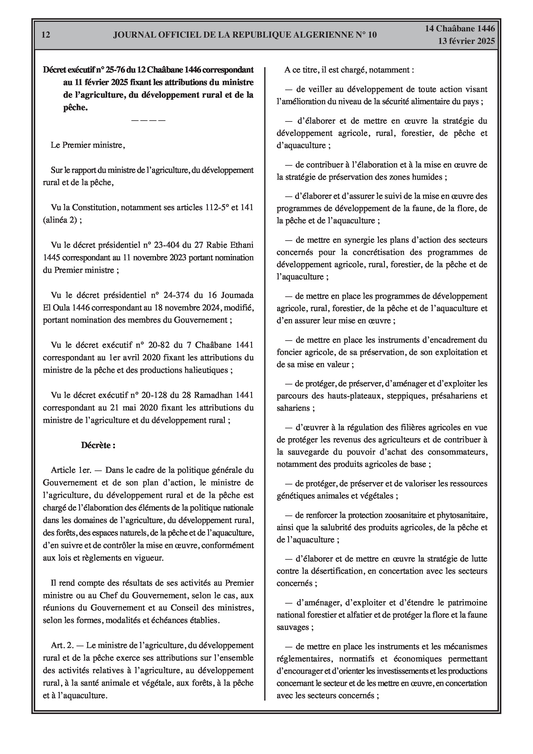Le décret exécutif n° 25-76 établit les attributions du ministre de l'Agriculture, du Développement Rural et de la Pêche, couvrant l'agriculture, le développement rural, les forêts, la pêche et l'aquaculture.