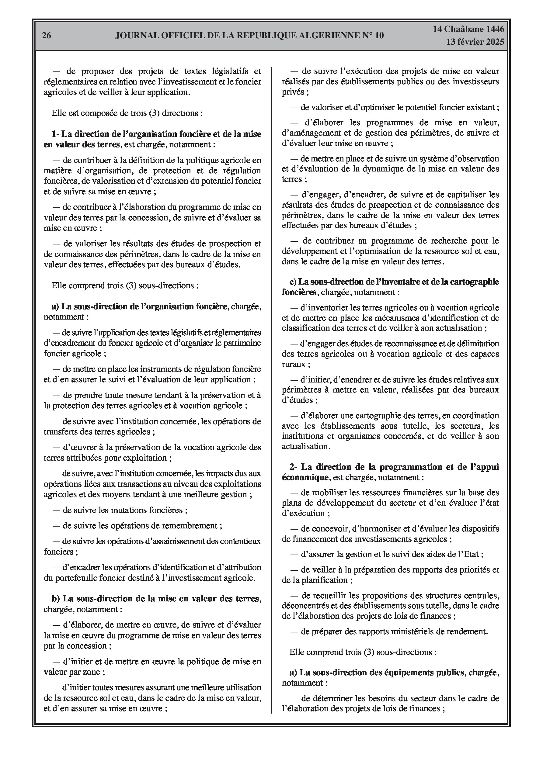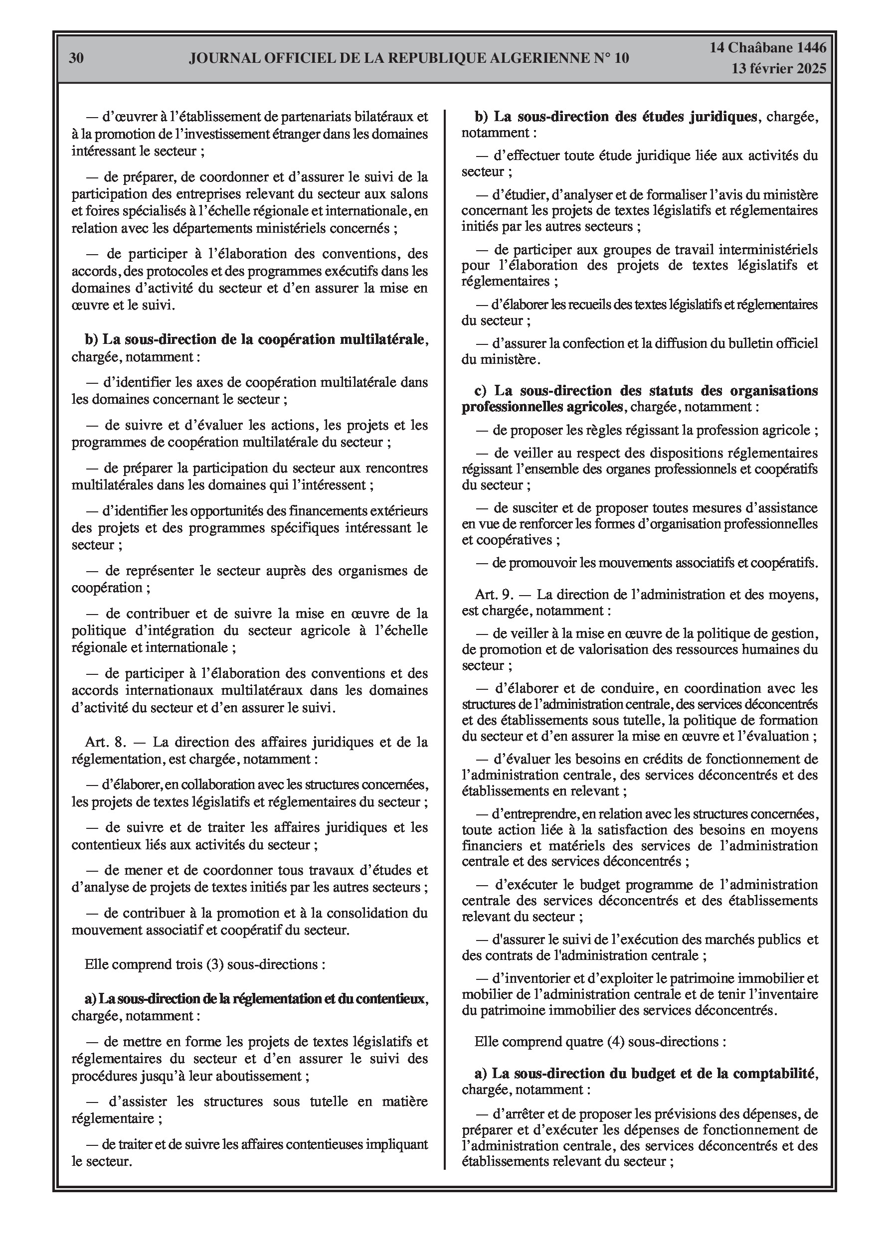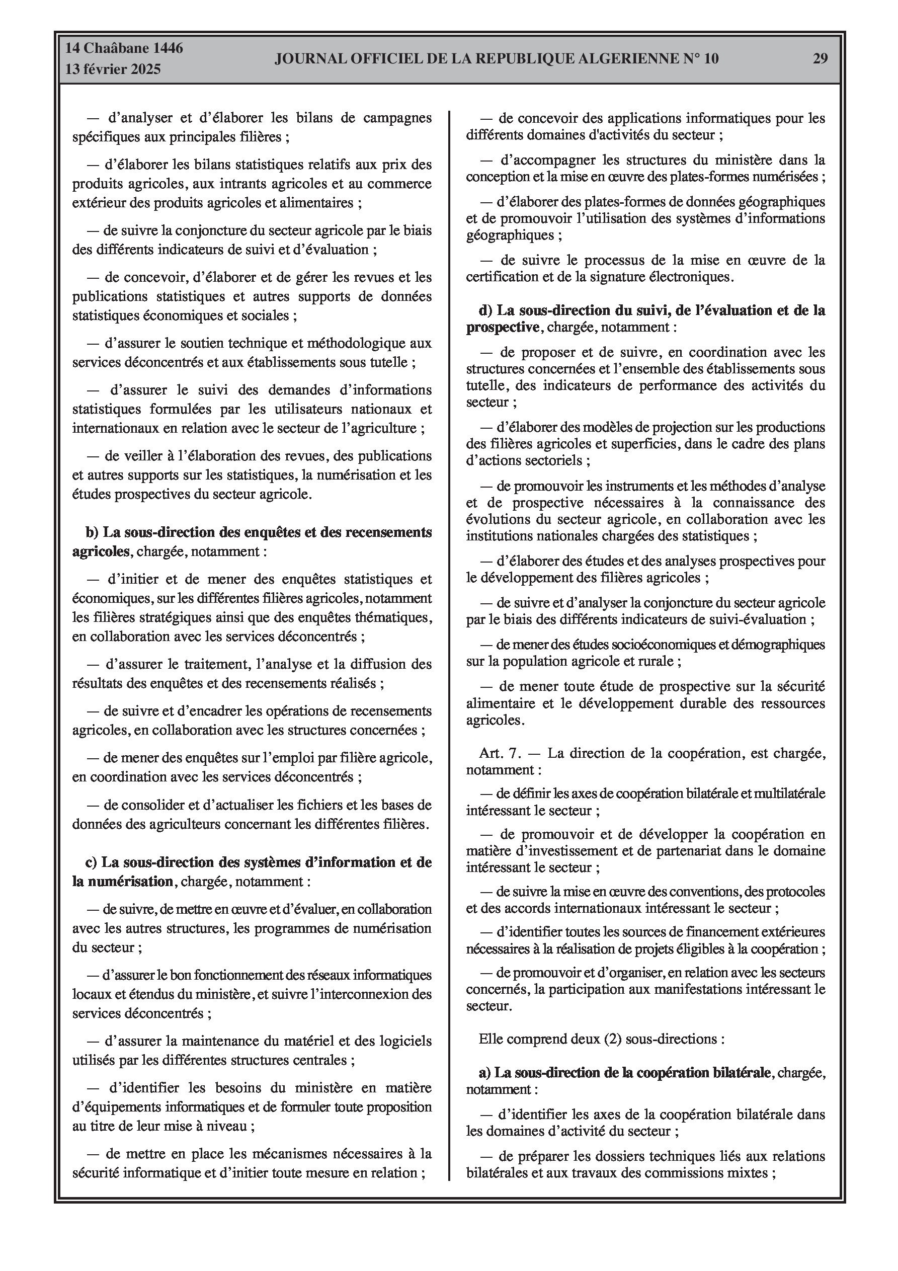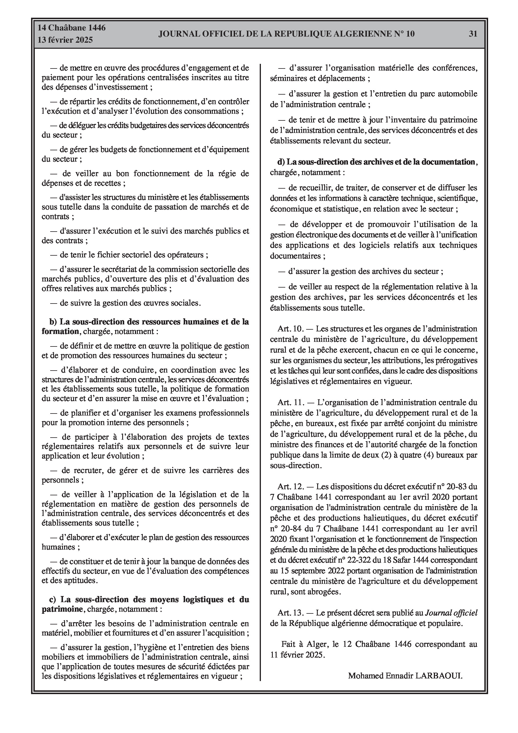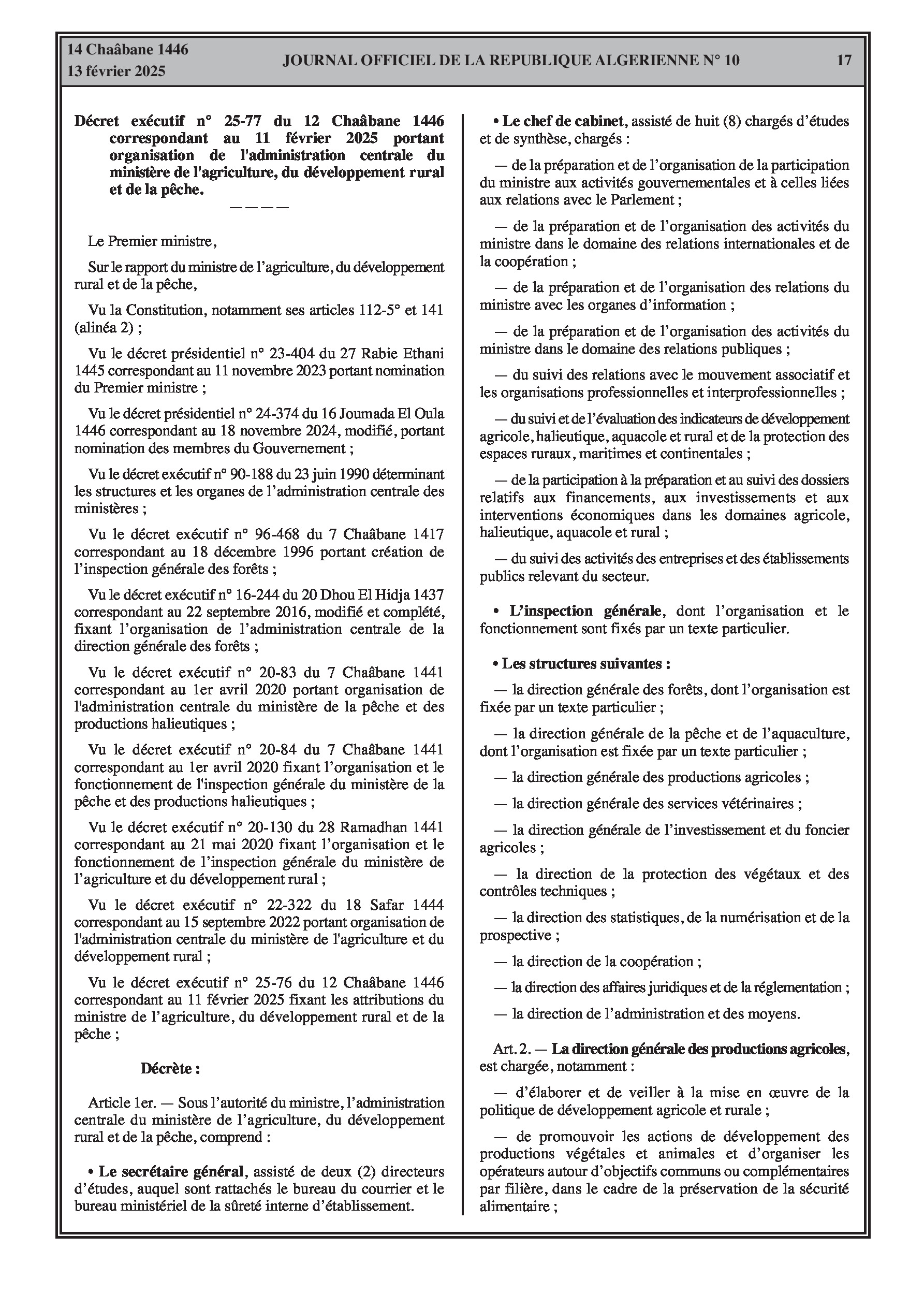 Le décret exécutif n° 25-77 détaille l'organisation de l'administration centrale du ministère de l'Agriculture, du Développement Rural et de la Pêche.
