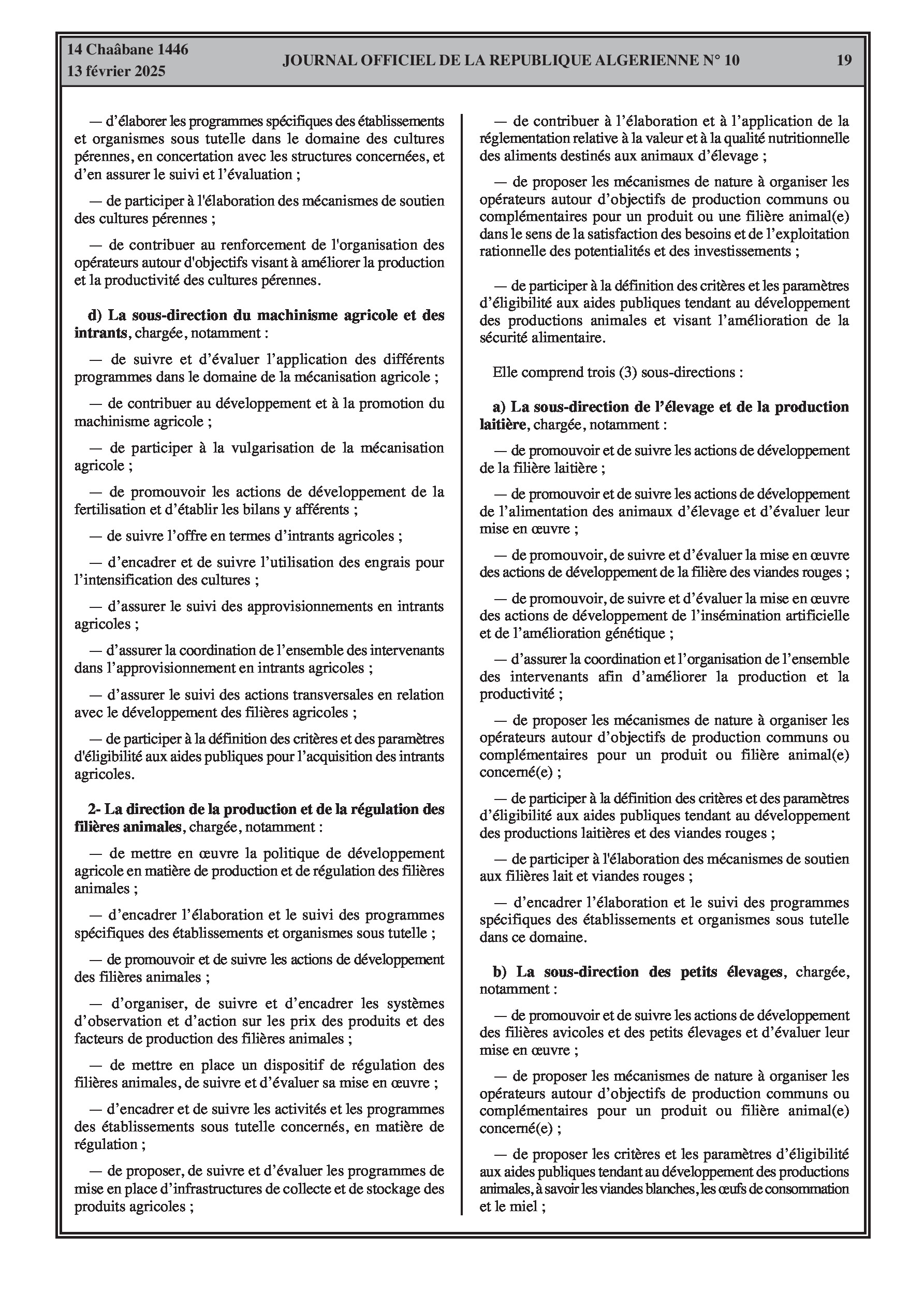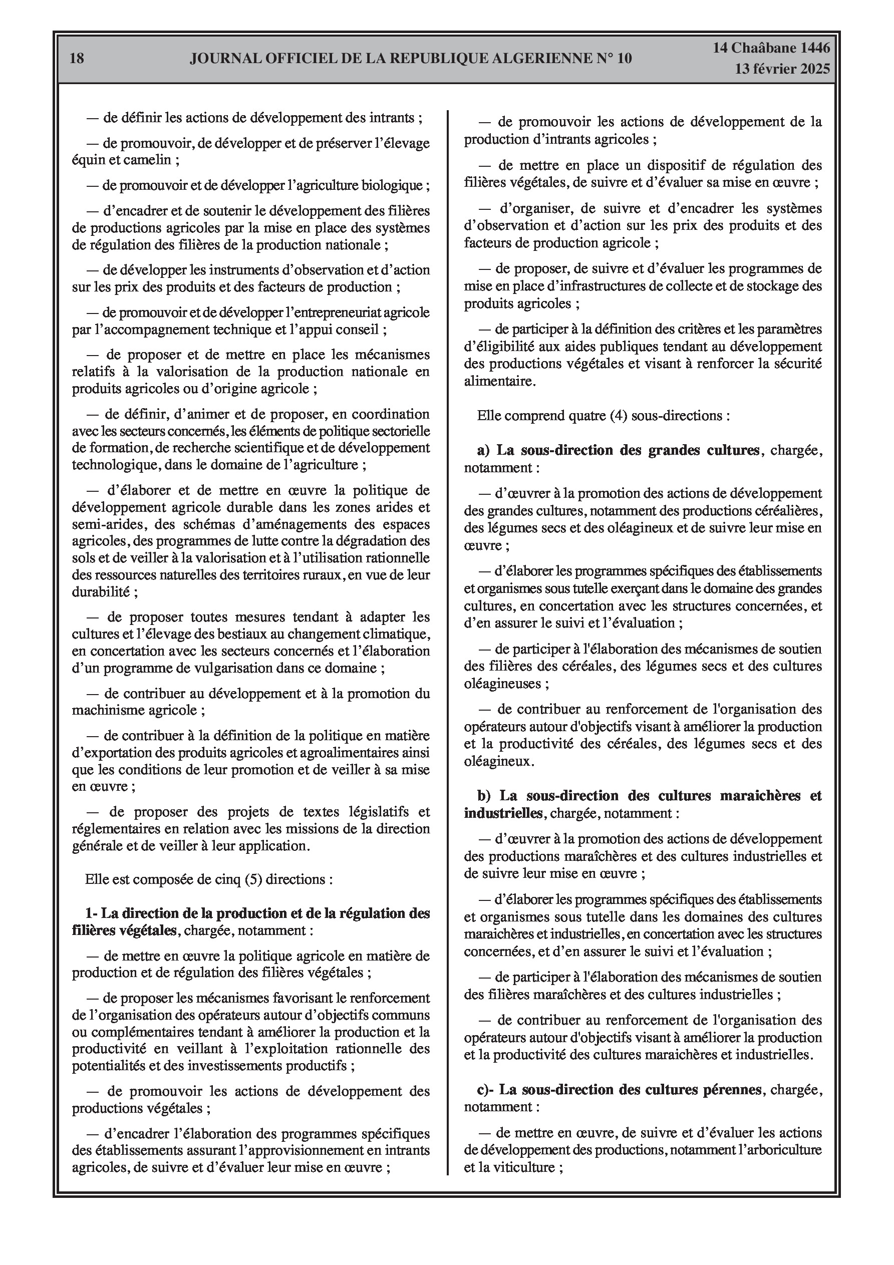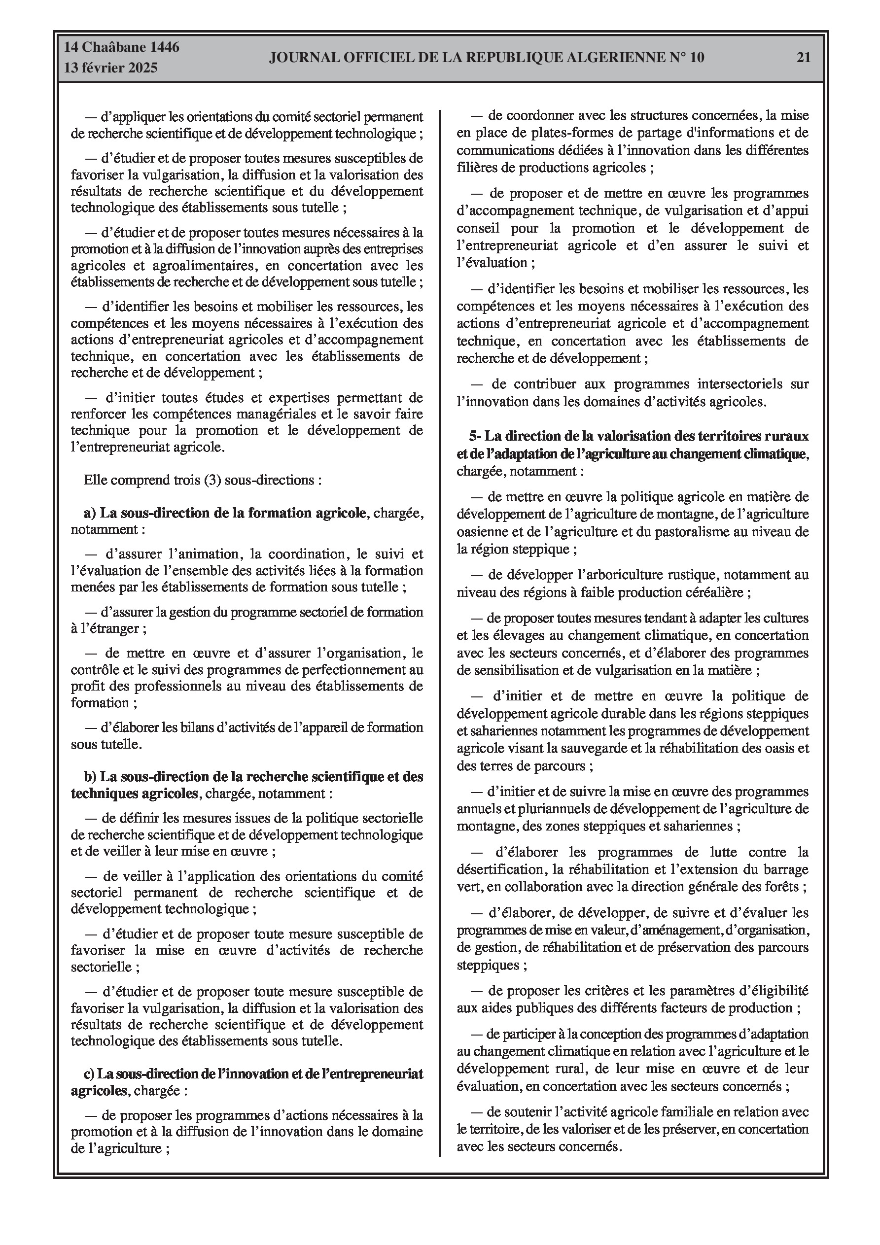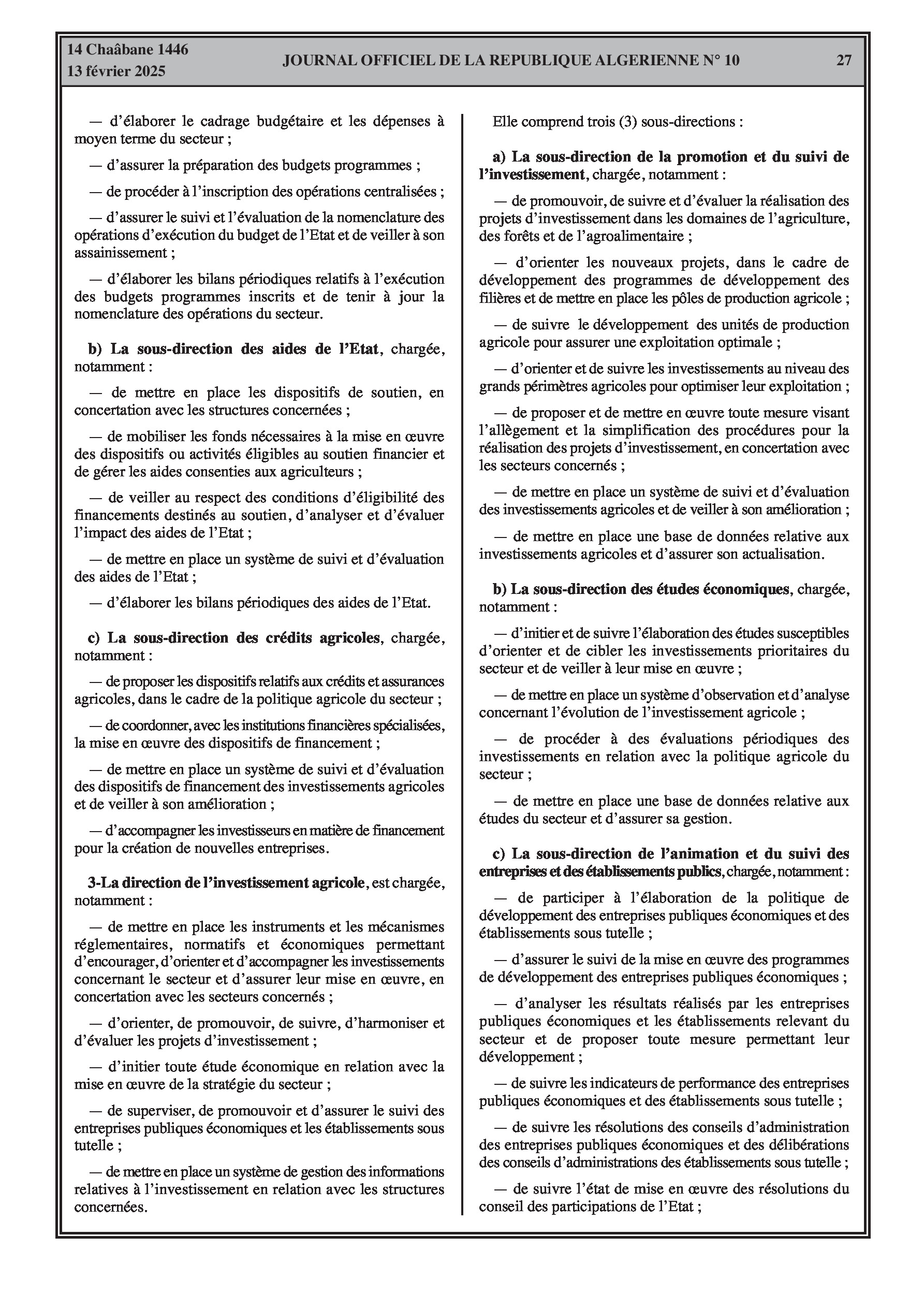 Le décret exécutif n° 25-77 détaille l'organisation de l'administration centrale du ministère de l'Agriculture, du Développement Rural et de la Pêche.