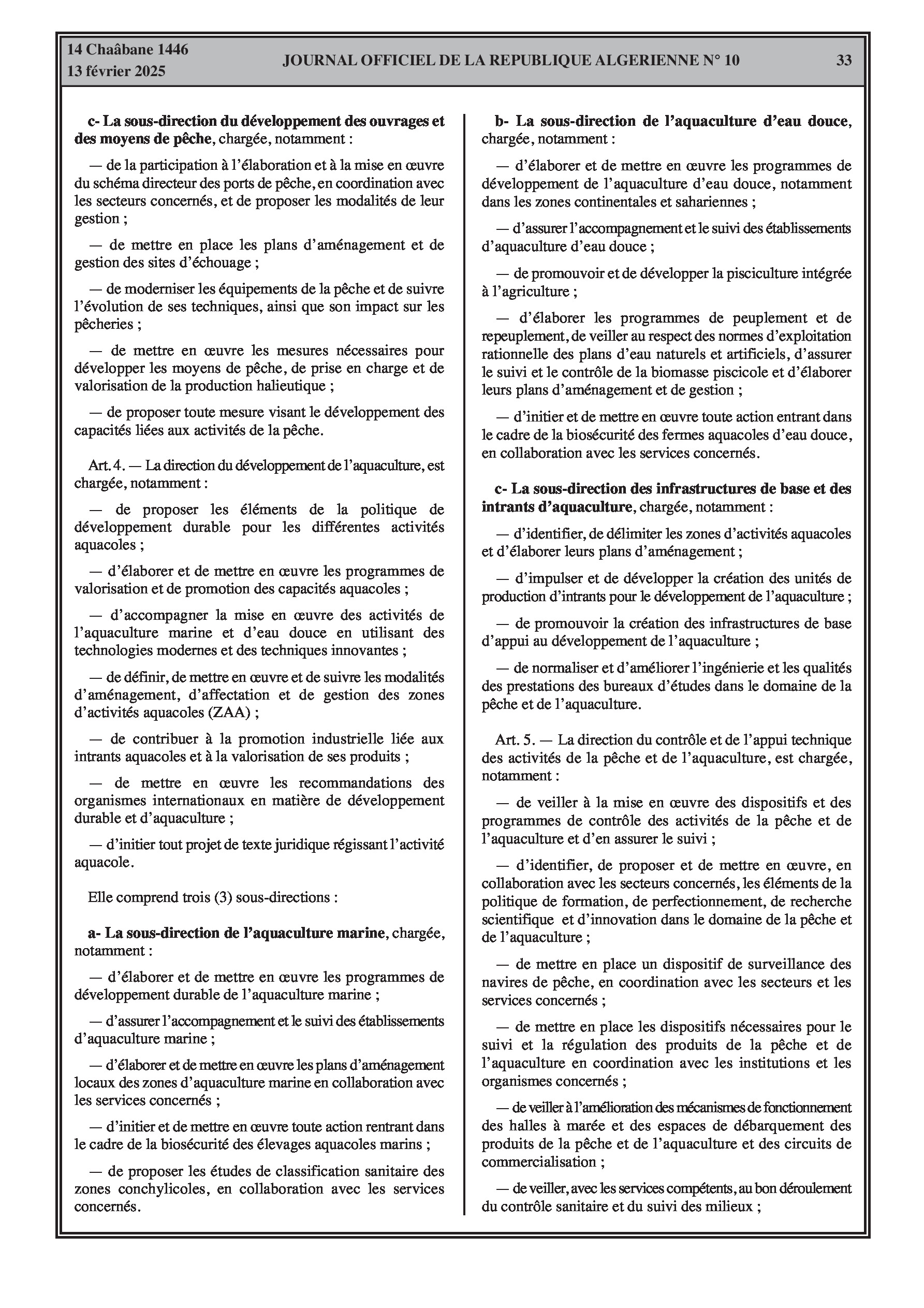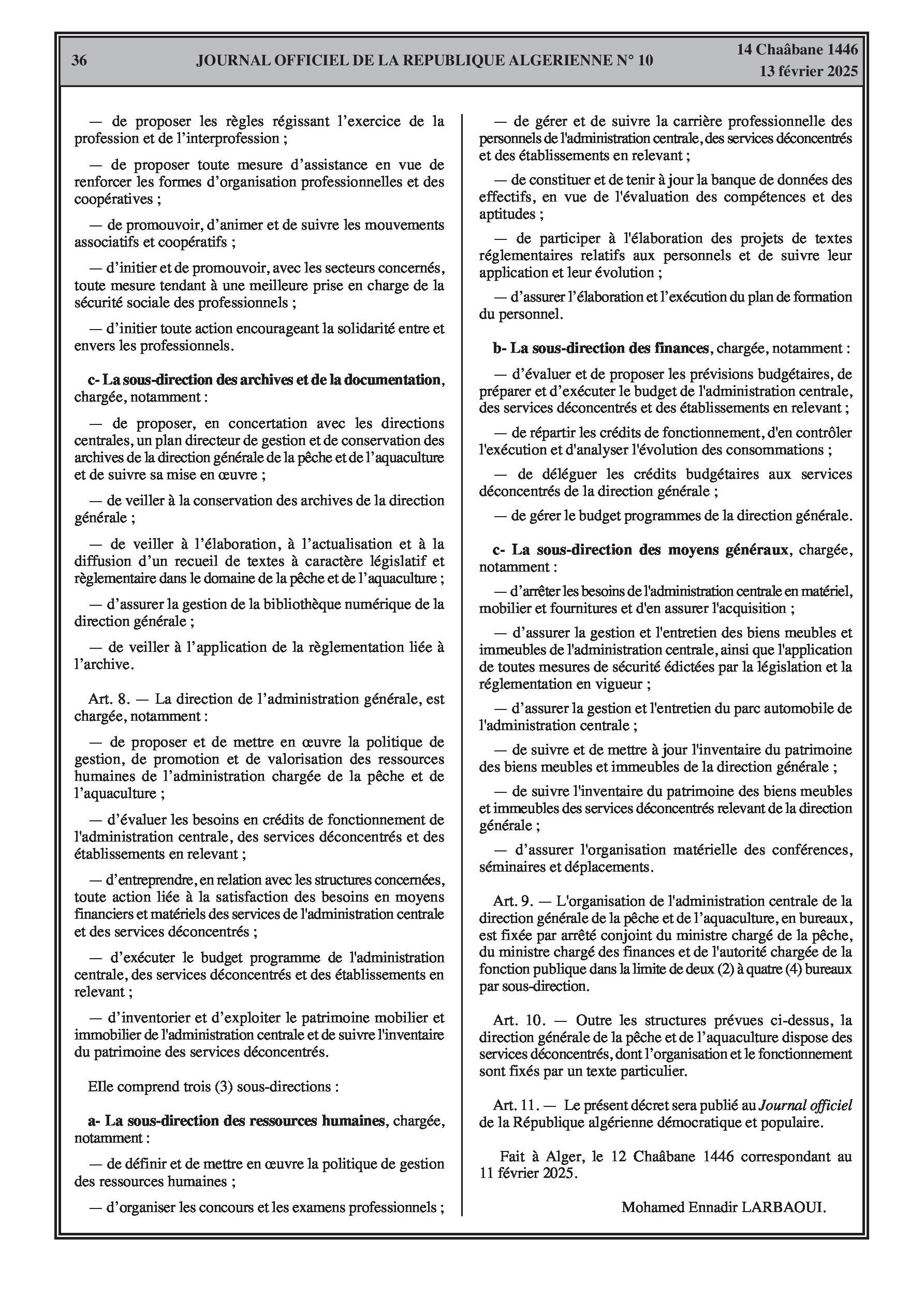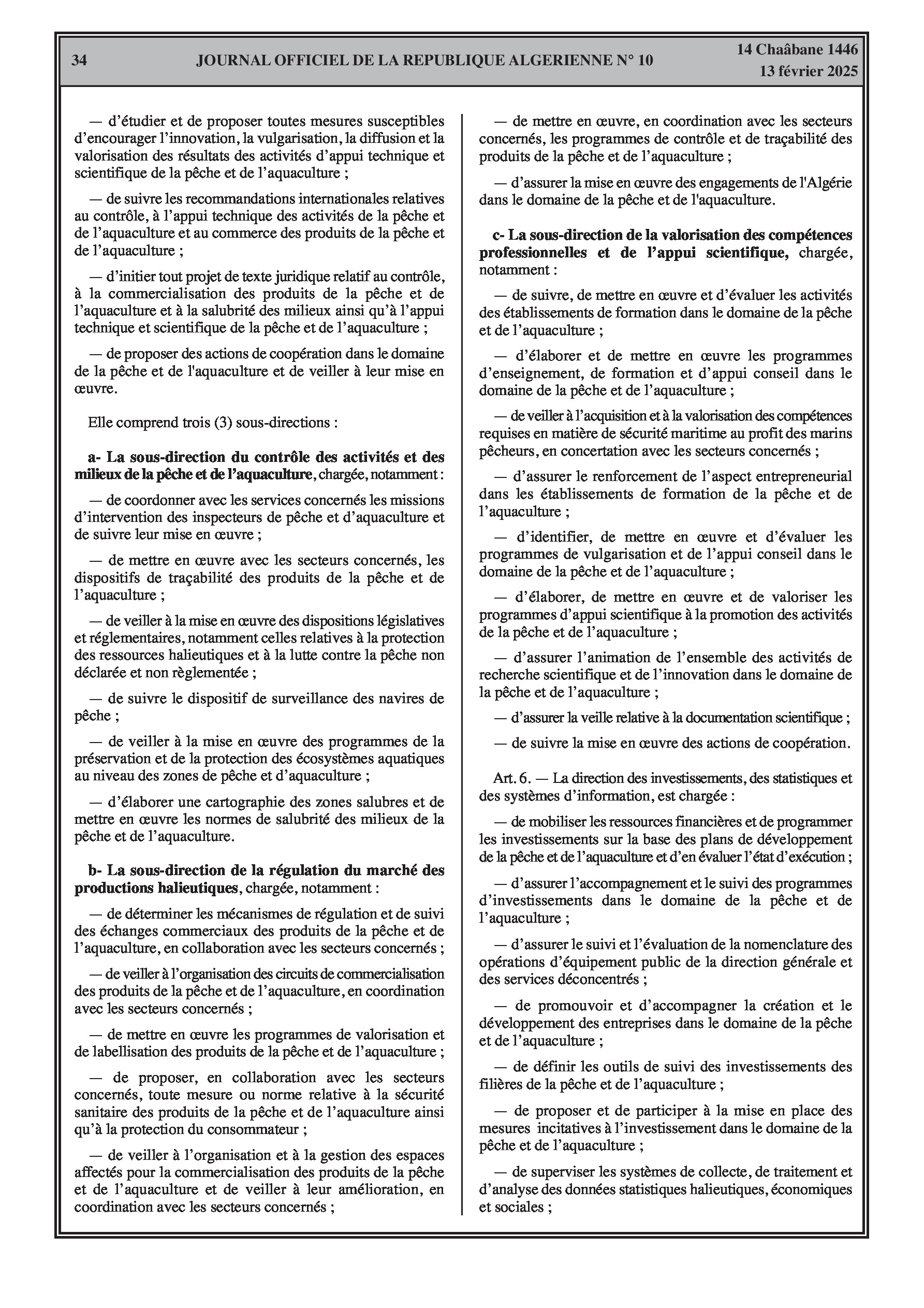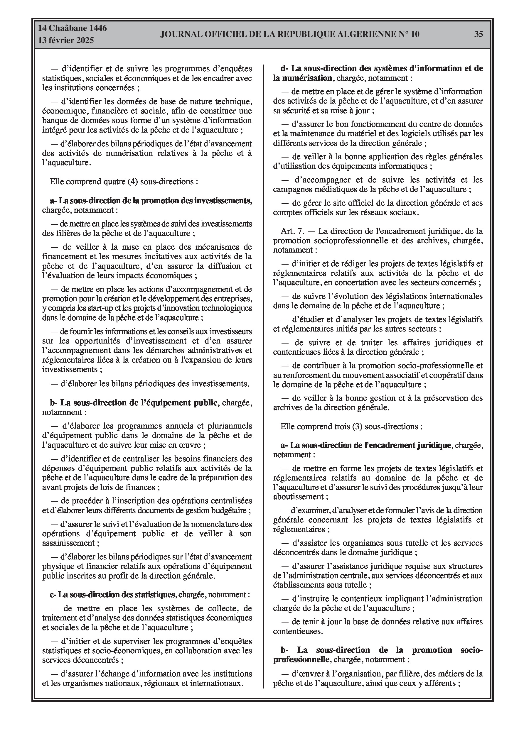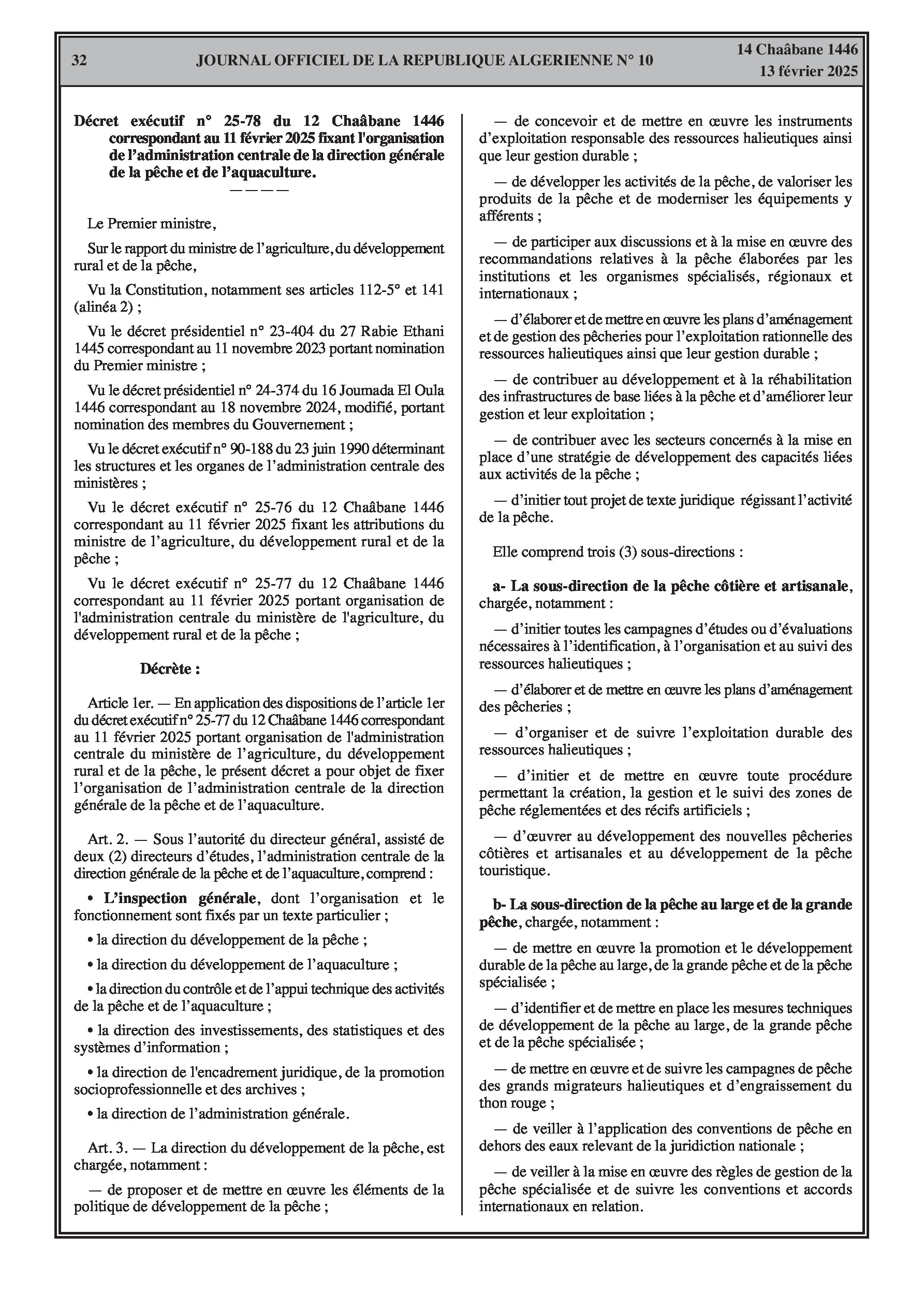 Le décret exécutif n° 25-78 spécifie l'organisation de l'administration centrale de la Direction Générale de la Pêche et de l'Aquaculture.