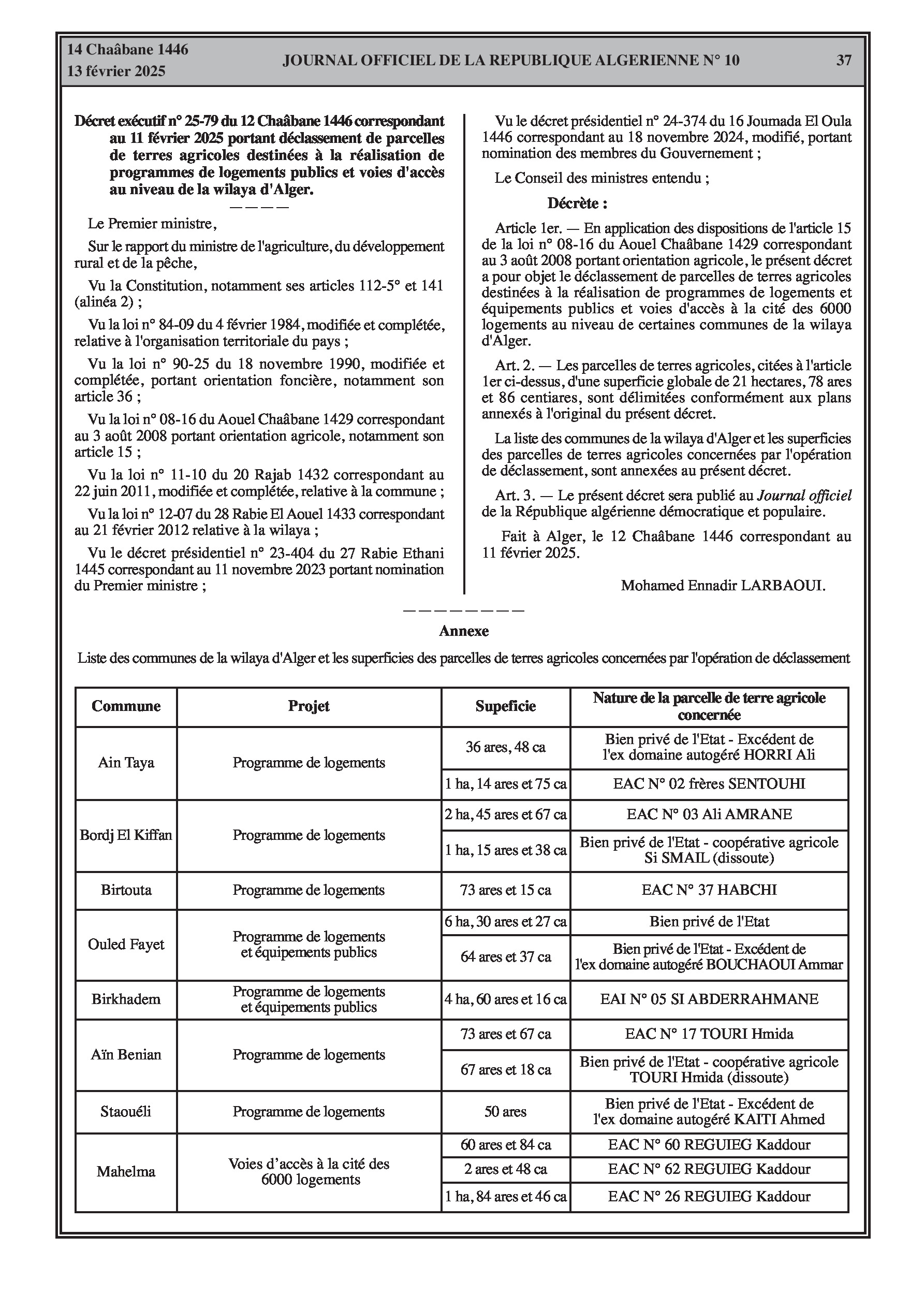 Le décret exécutif n° 25-79 déclassifie des parcelles de terrains agricoles dans la wilaya d'Alger pour des programmes de logements publics et des voies d'accès.