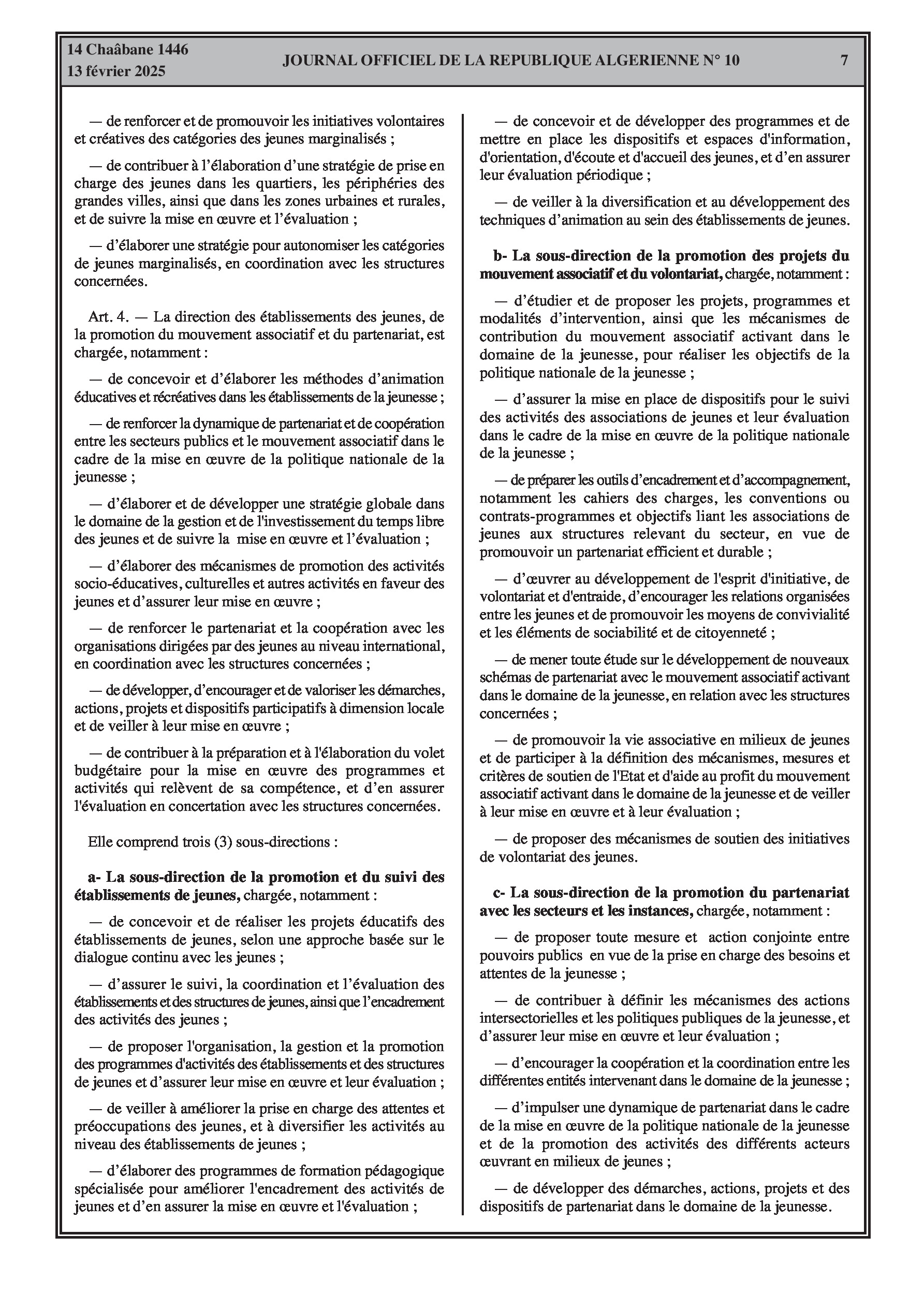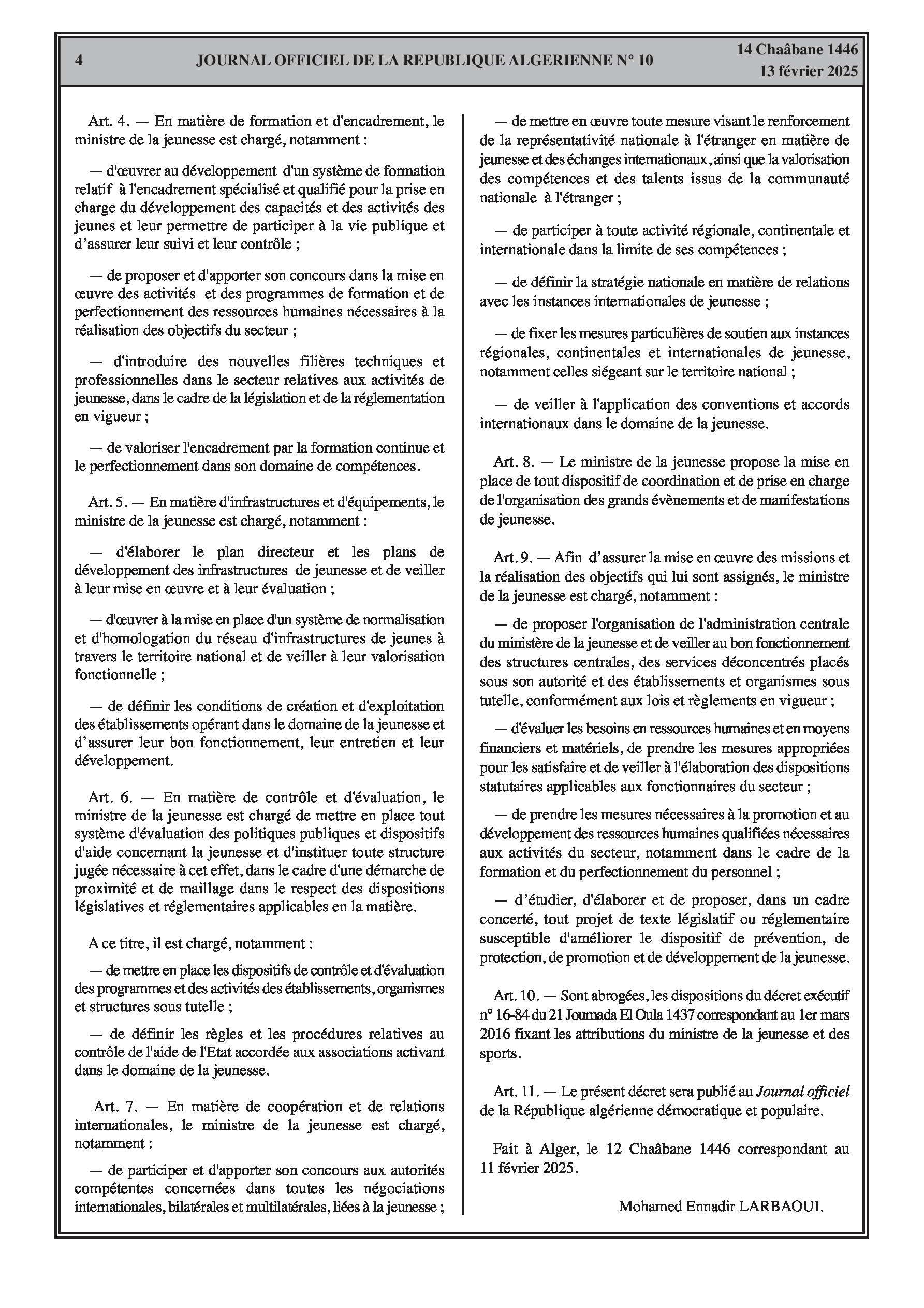Le décret exécutif n° 25-74 définit les pouvoirs et responsabilités du ministre de la Jeunesse, axés sur l'autonomisation des jeunes et le développement des activités.