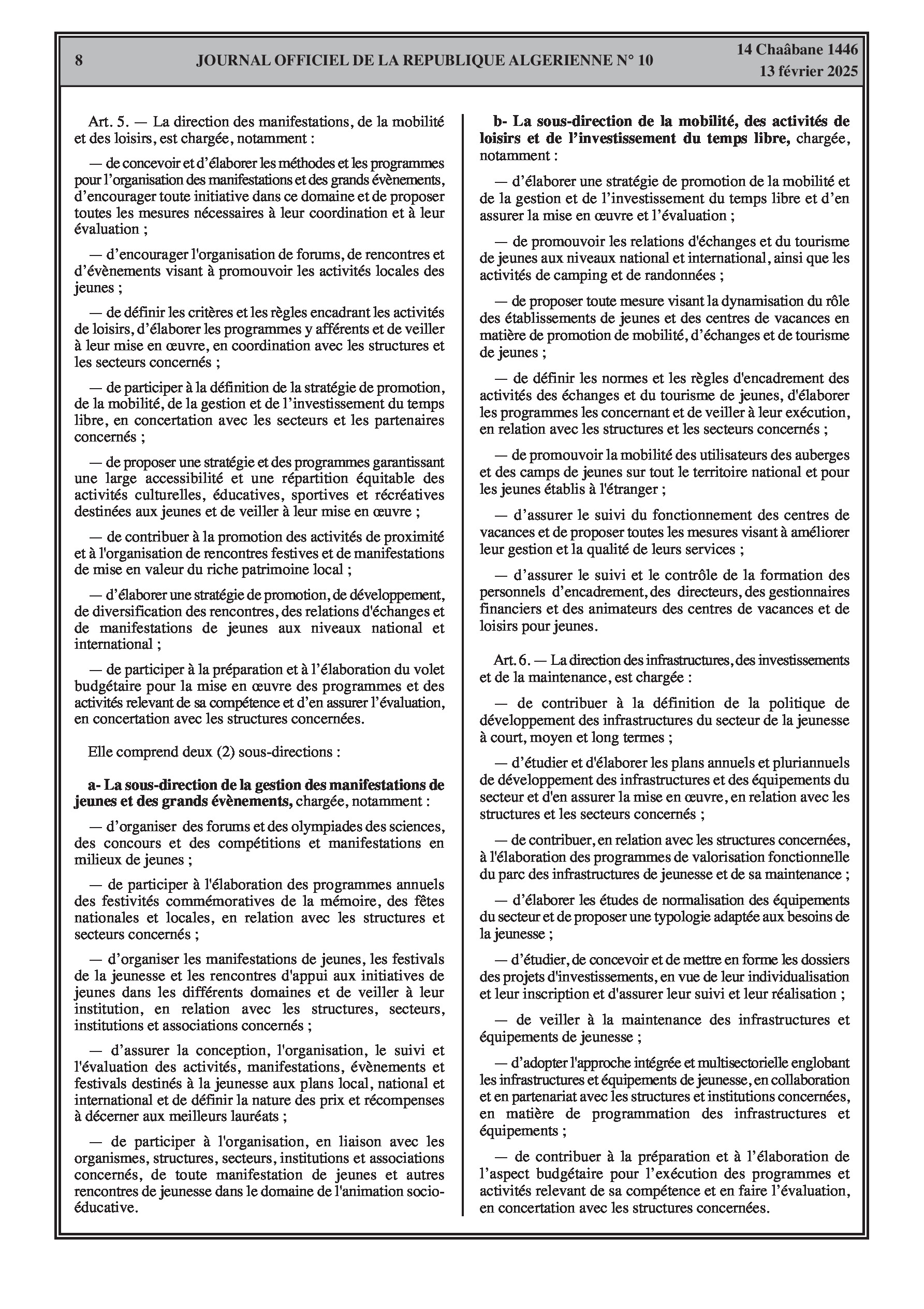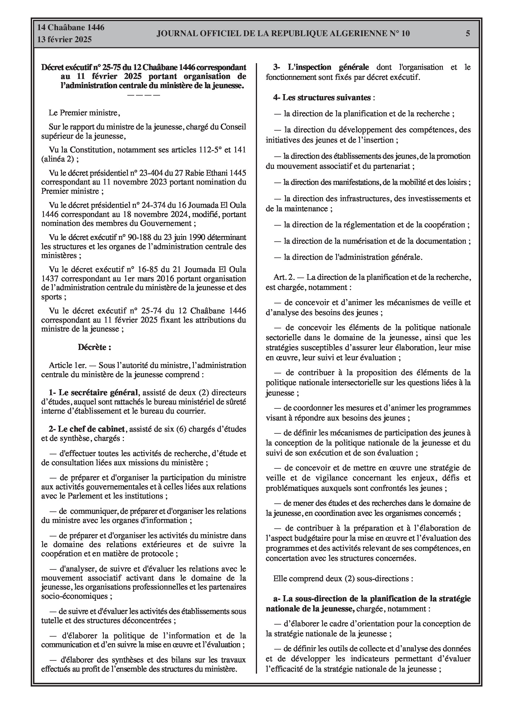 Le décret exécutif n° 25-75 définit la structure organisationnelle de l'administration centrale du ministère de la Jeunesse.