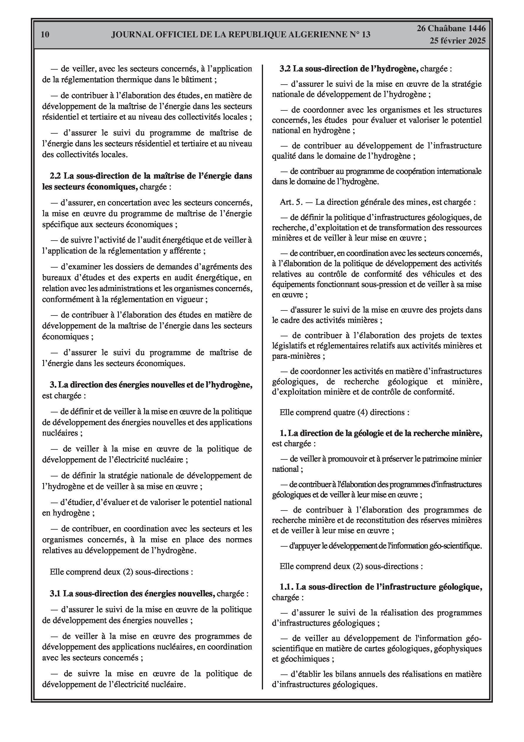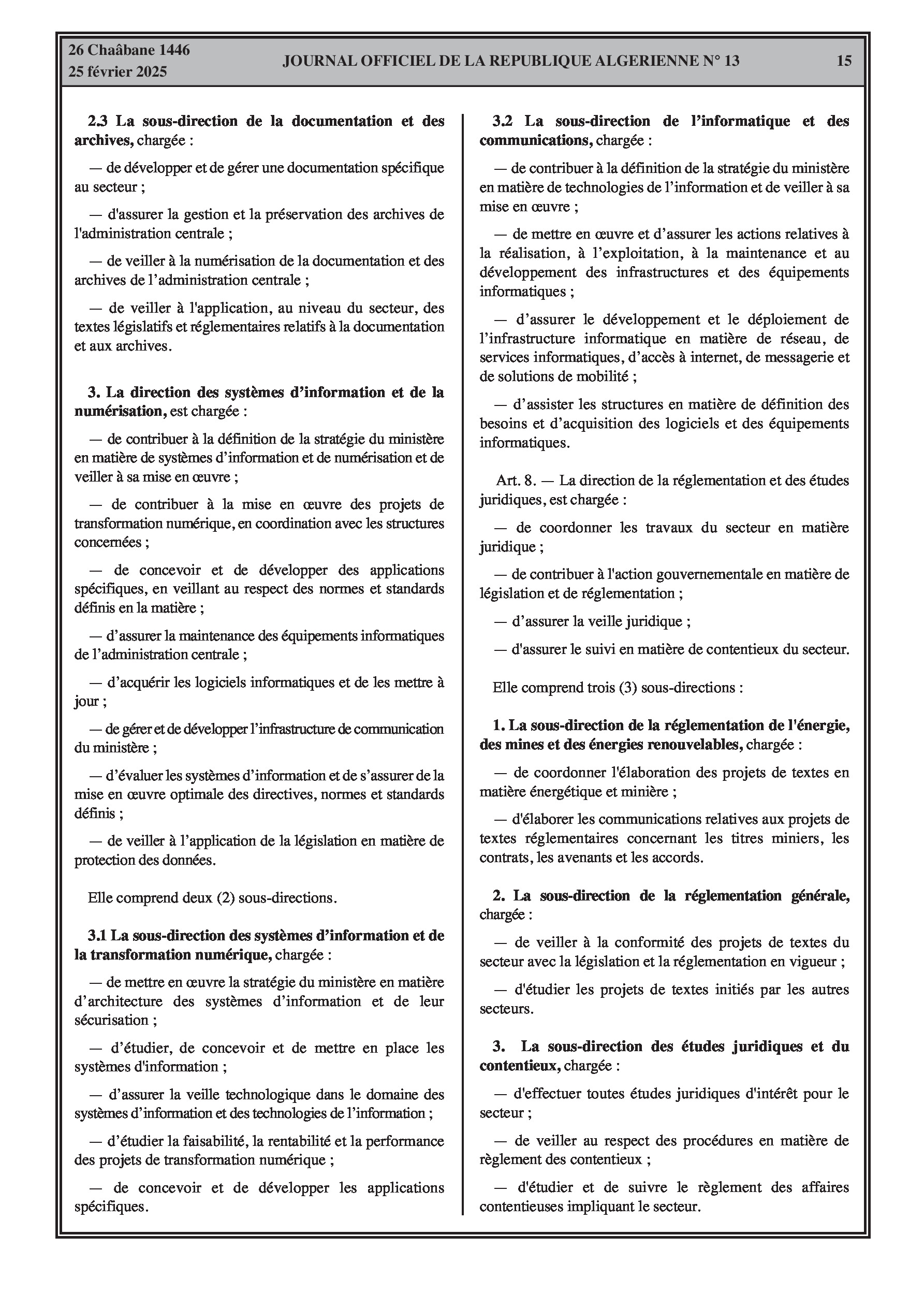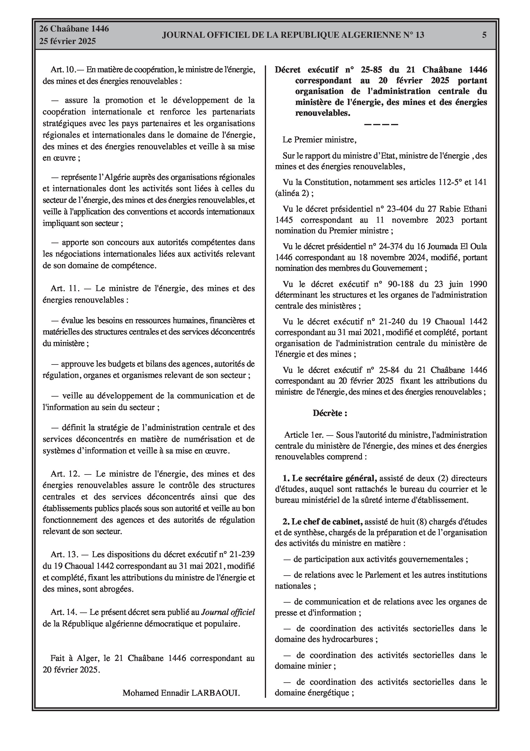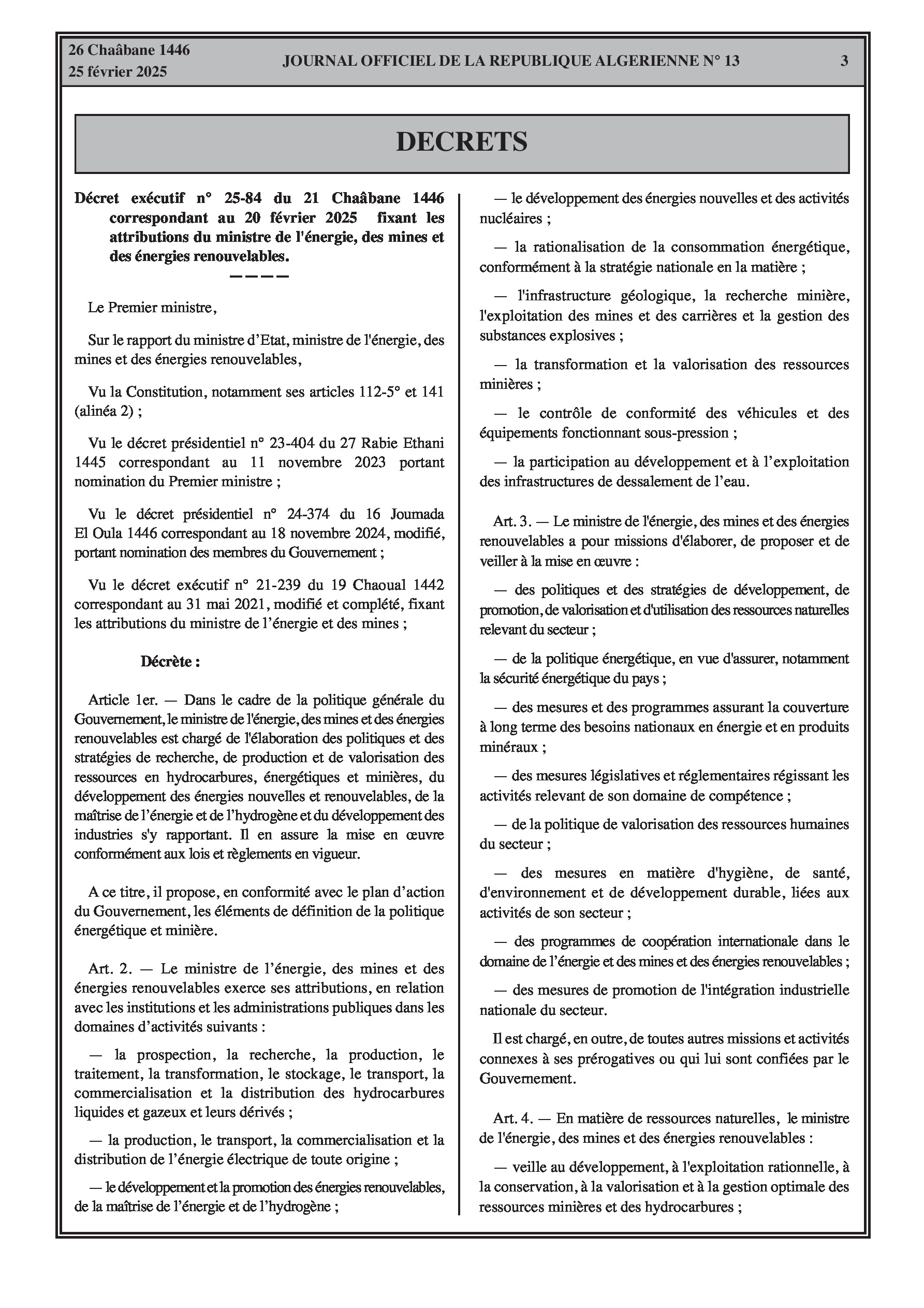 Le décret exécutif n° 25-84 fixe les attributions du ministre de l'énergie, des mines et des énergies renouvelables. Le décret exécutif n° 25-85 porte organisation de l'administration centrale du même ministère, incluant le secrétariat général, le cabinet du ministre, l'inspection générale, et les directions générales.
