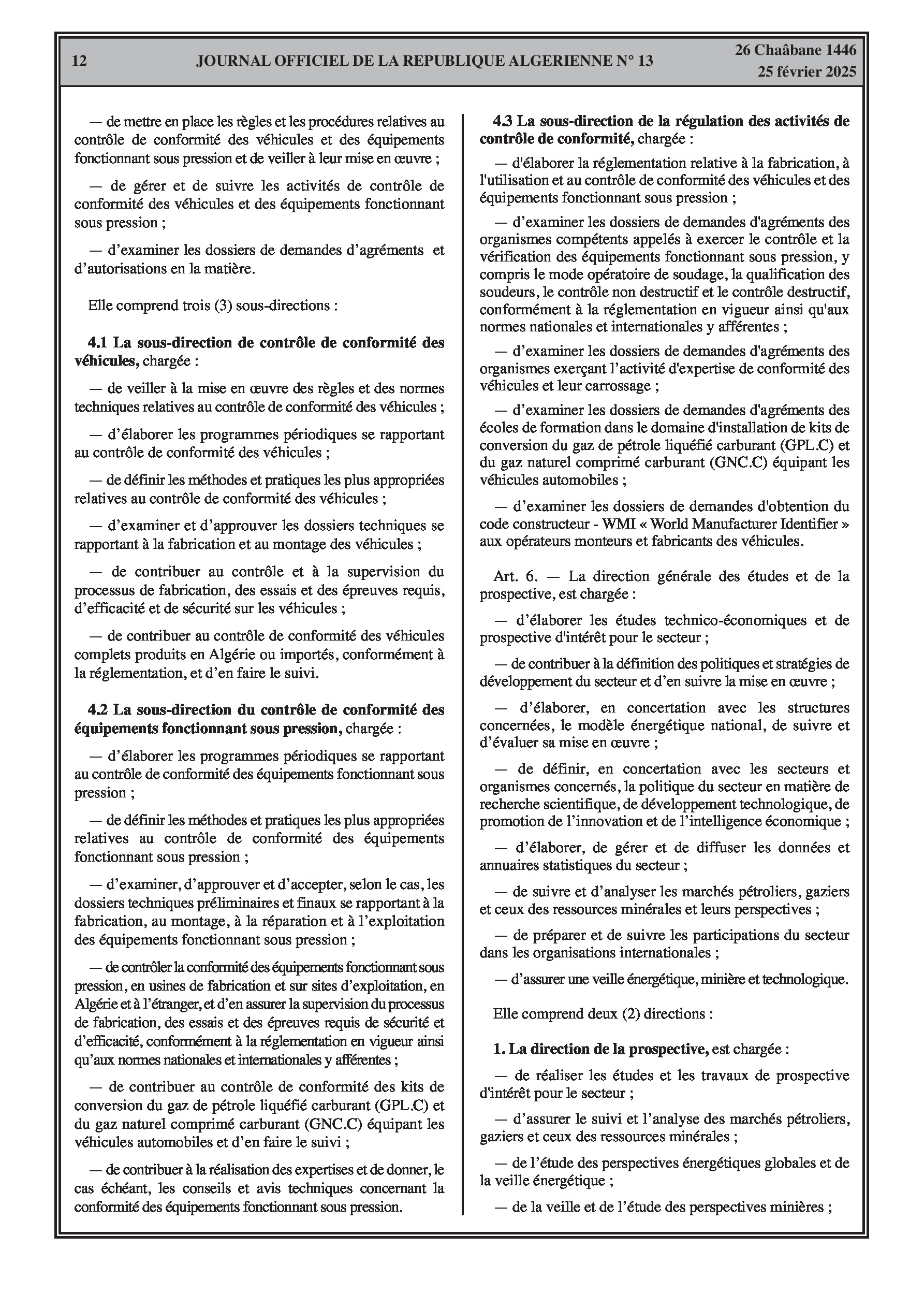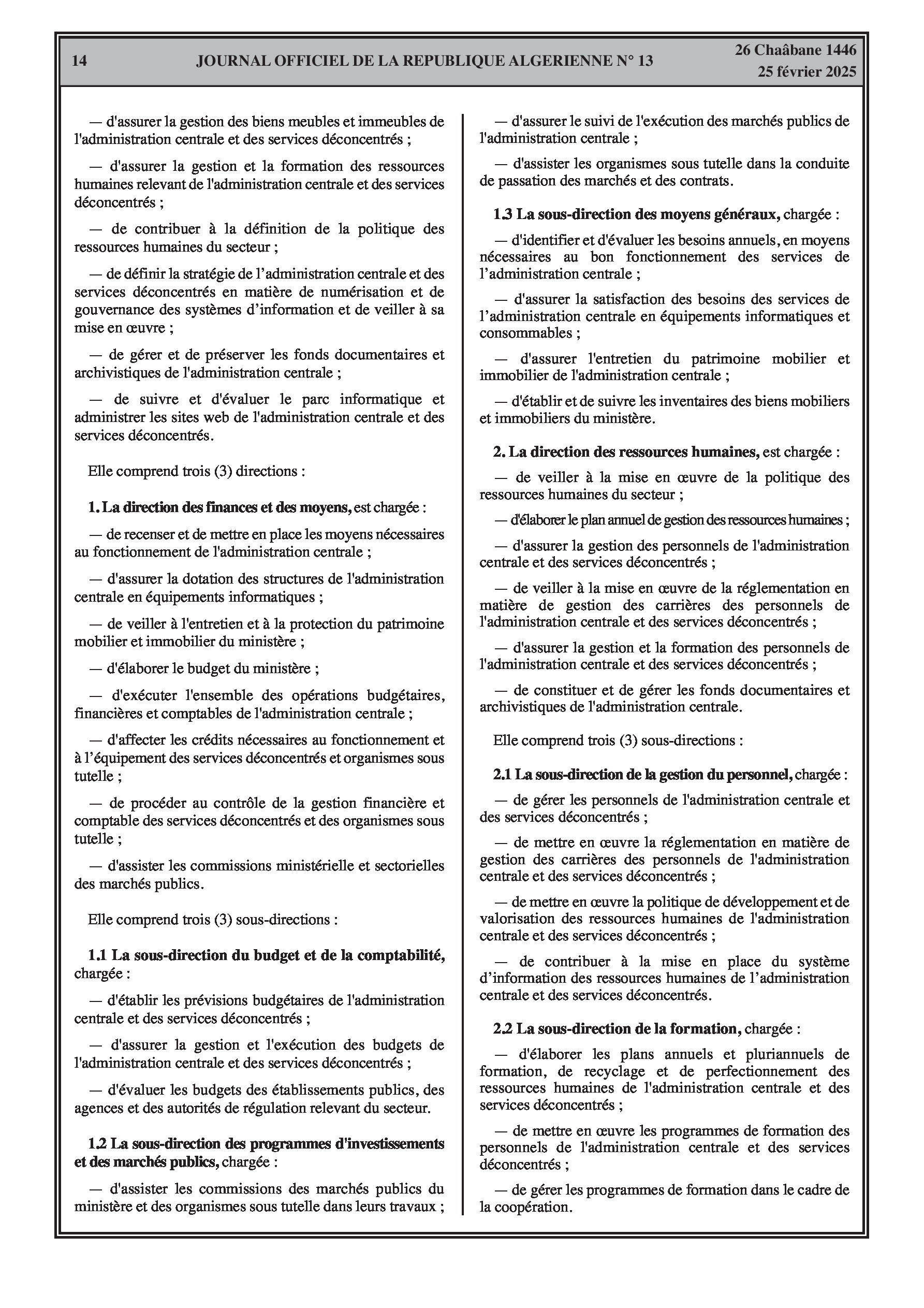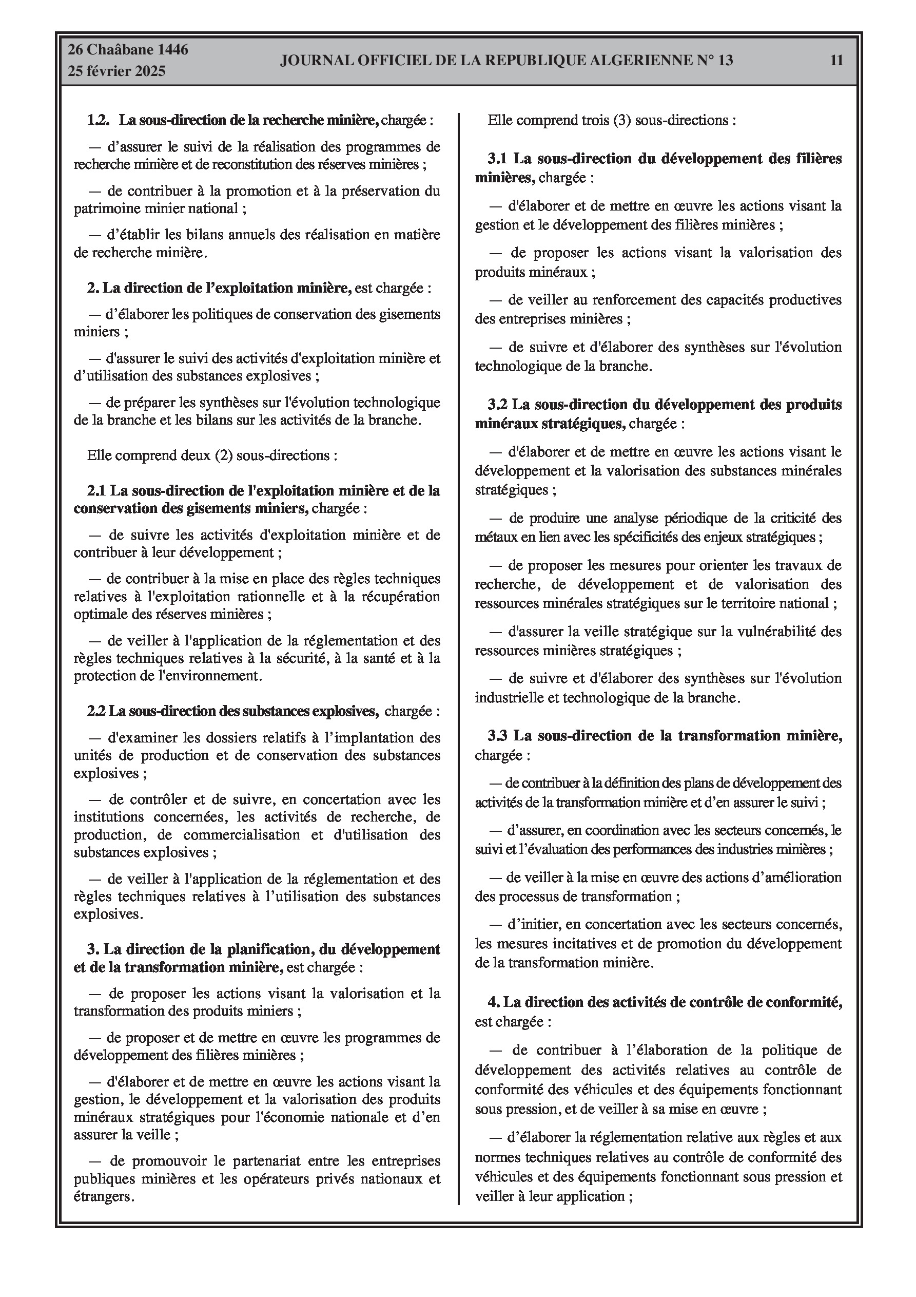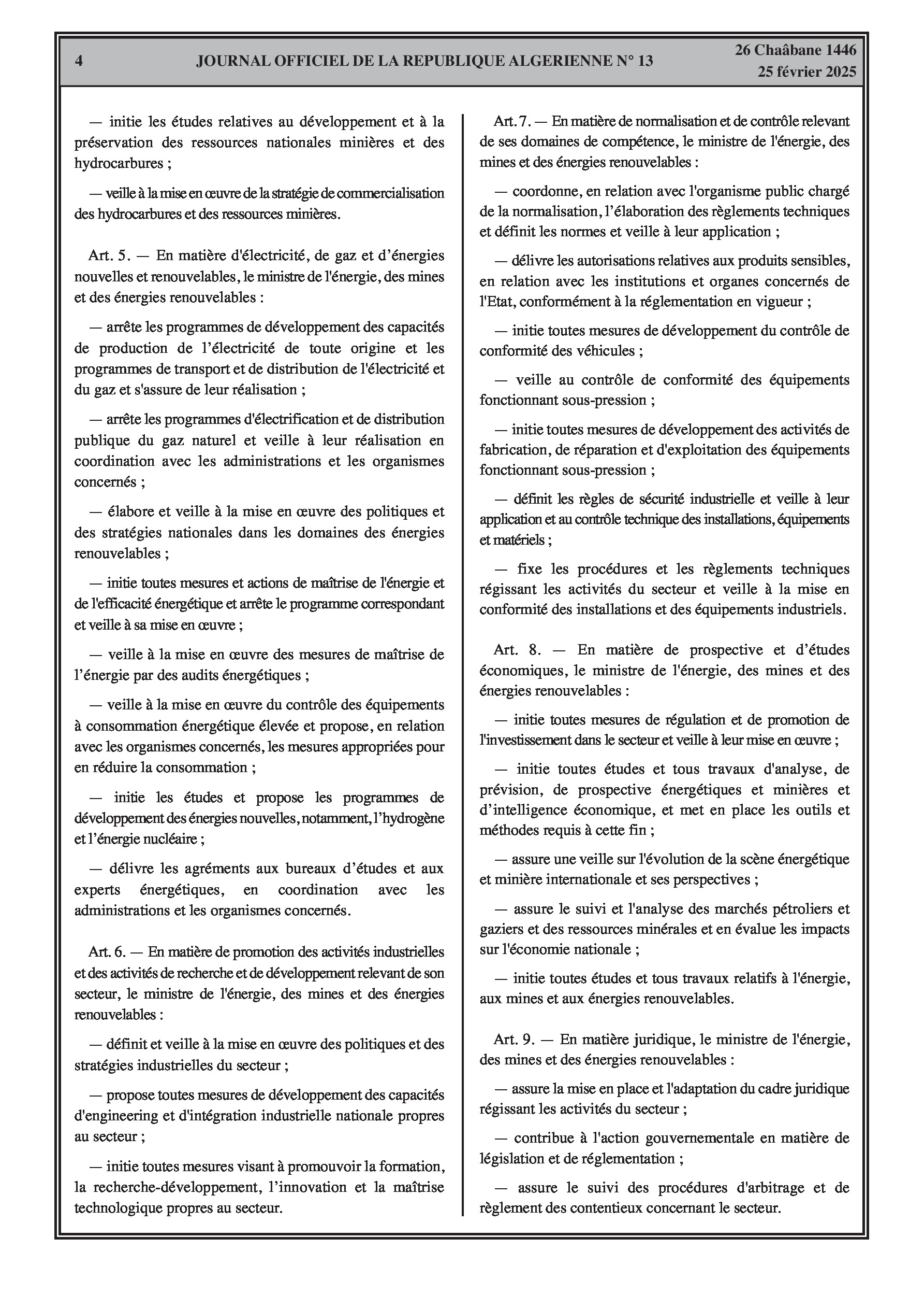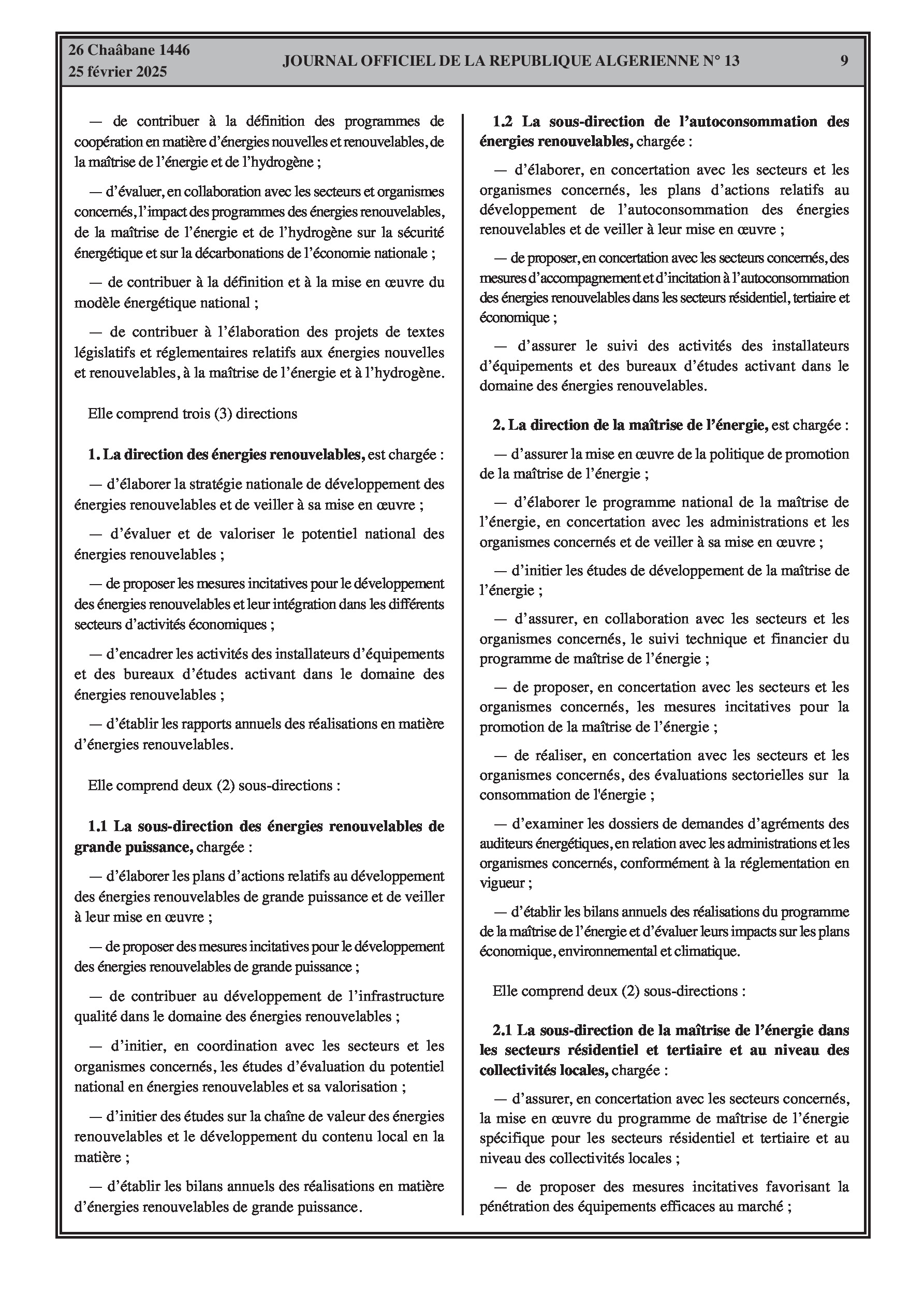 Le décret exécutif n° 25-84 fixe les attributions du ministre de l'énergie, des mines et des énergies renouvelables. Le décret exécutif n° 25-85 porte organisation de l'administration centrale du même ministère, incluant le secrétariat général, le cabinet du ministre, l'inspection générale, et les directions générales.