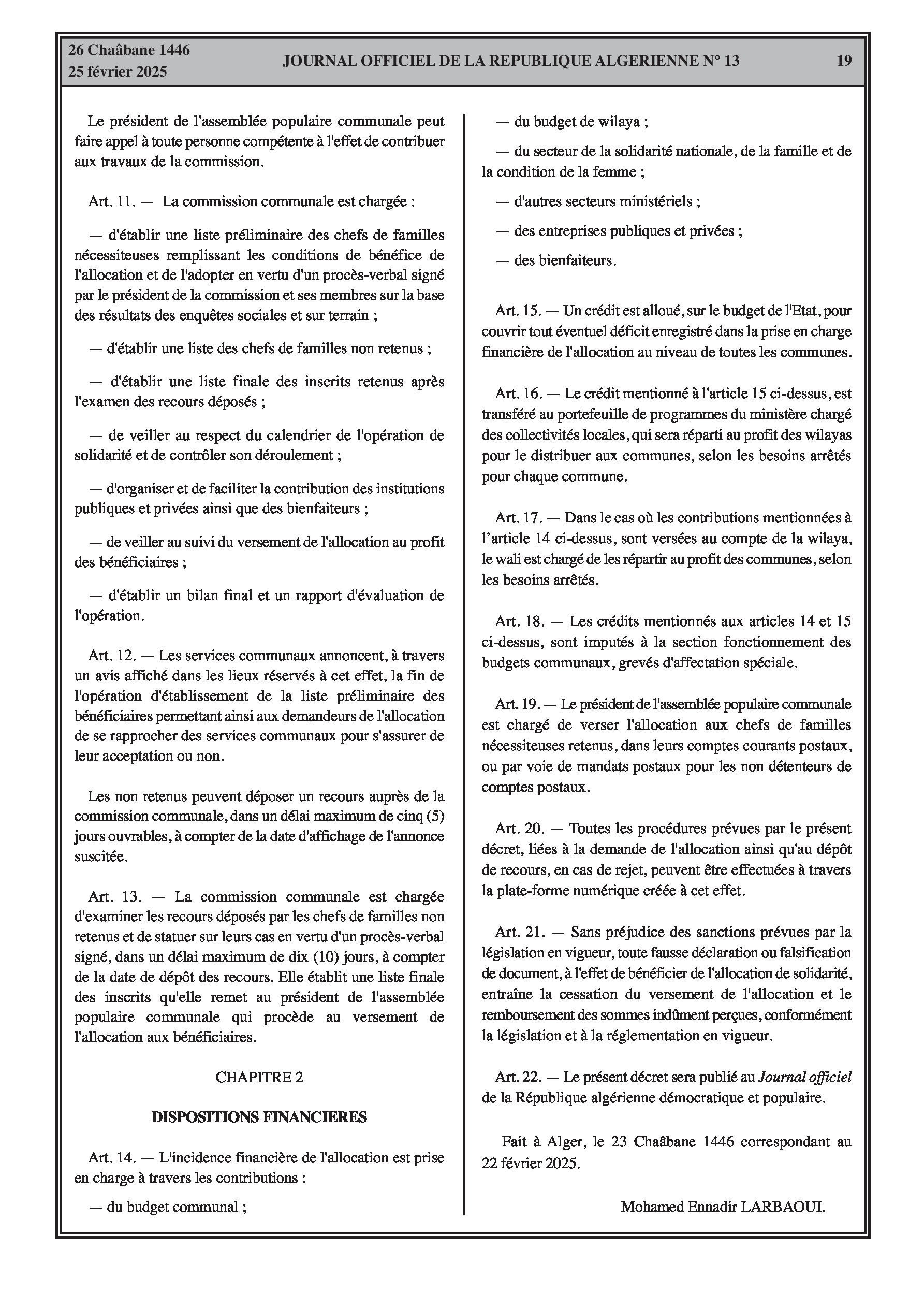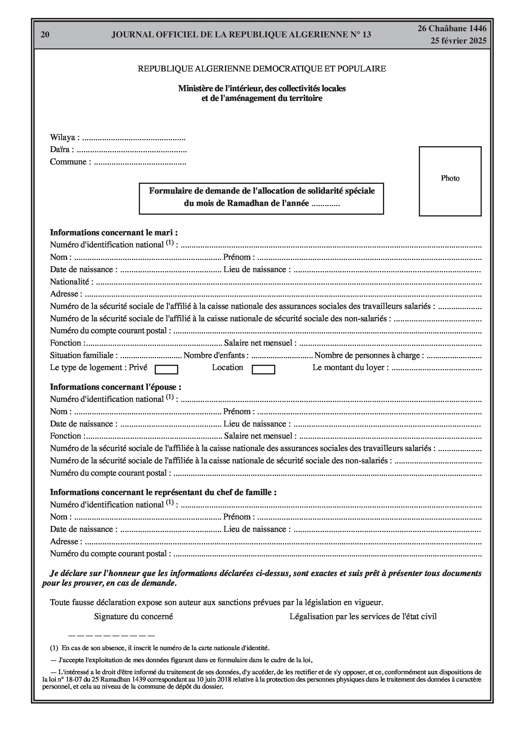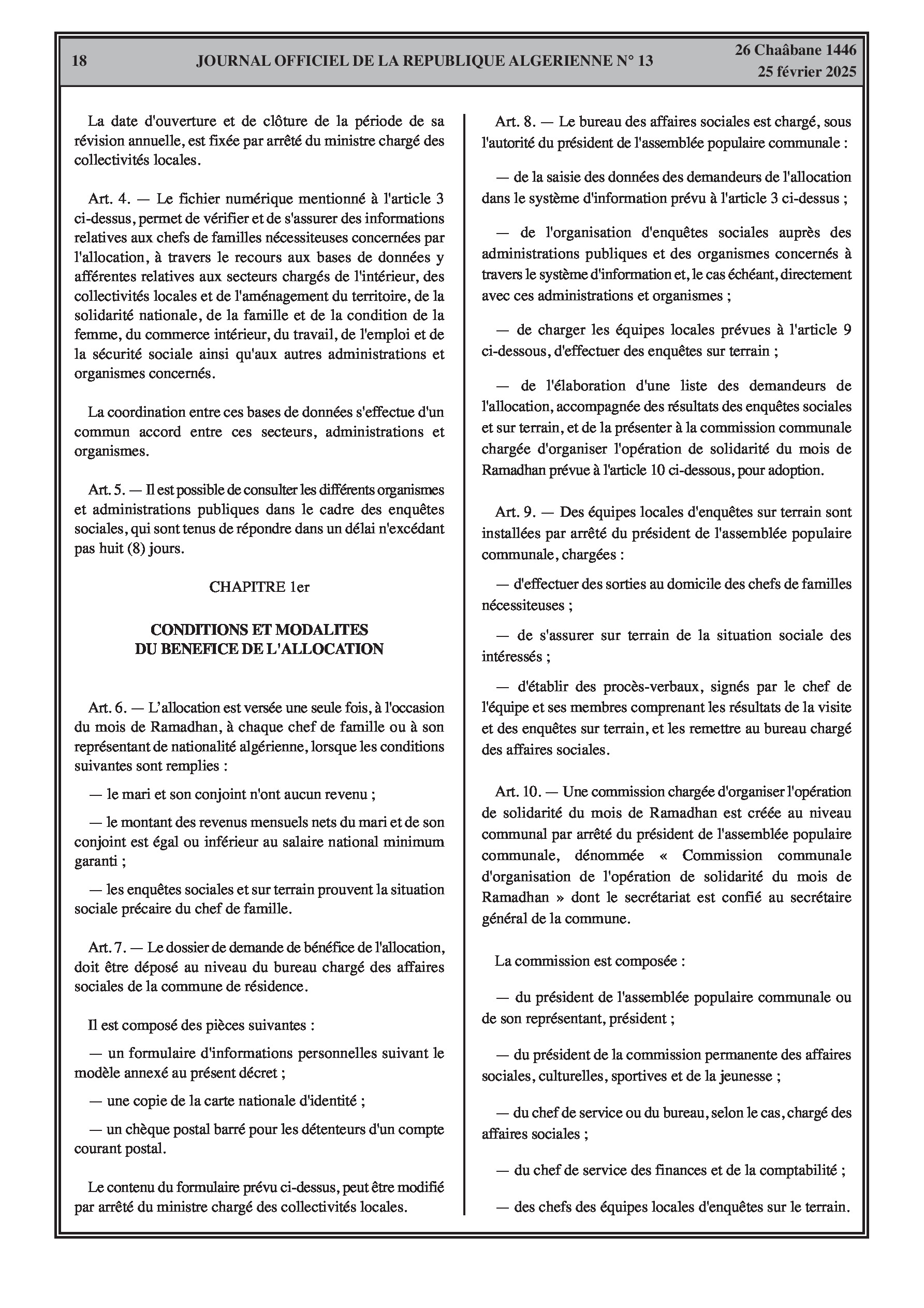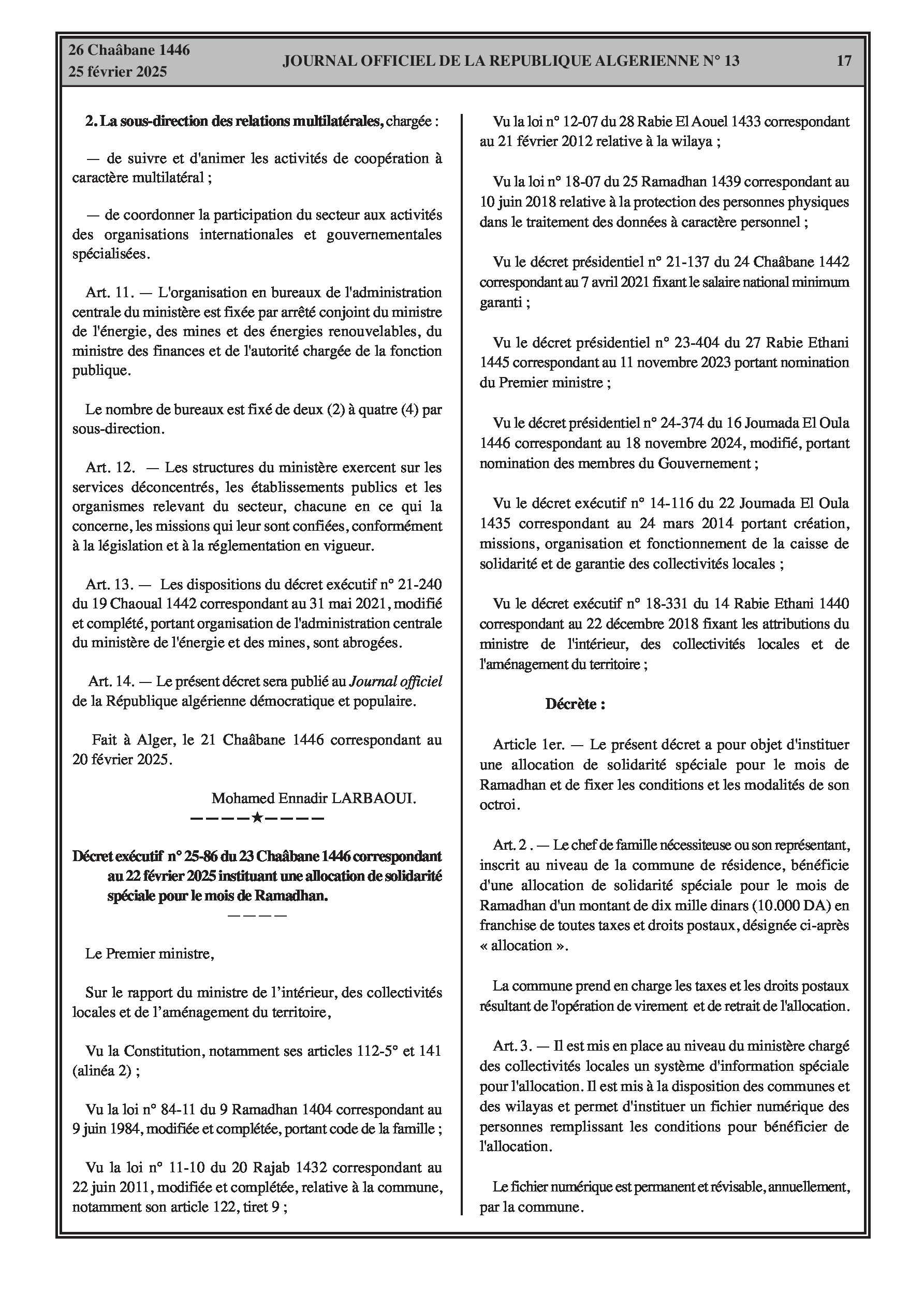 Le décret exécutif n° 25-86 institue une allocation de solidarité spéciale de 10.000 DA pour le mois de Ramadhan en faveur des familles nécessiteuses, précisant les conditions d'éligibilité telles que l'absence de revenus ou des revenus inférieurs au salaire national minimum garanti pour le couple, et la preuve d'une situation sociale précaire. Il détaille également les procédures de demande et de recours, le système d'information dédié, et les sources de financement de l'allocation.
