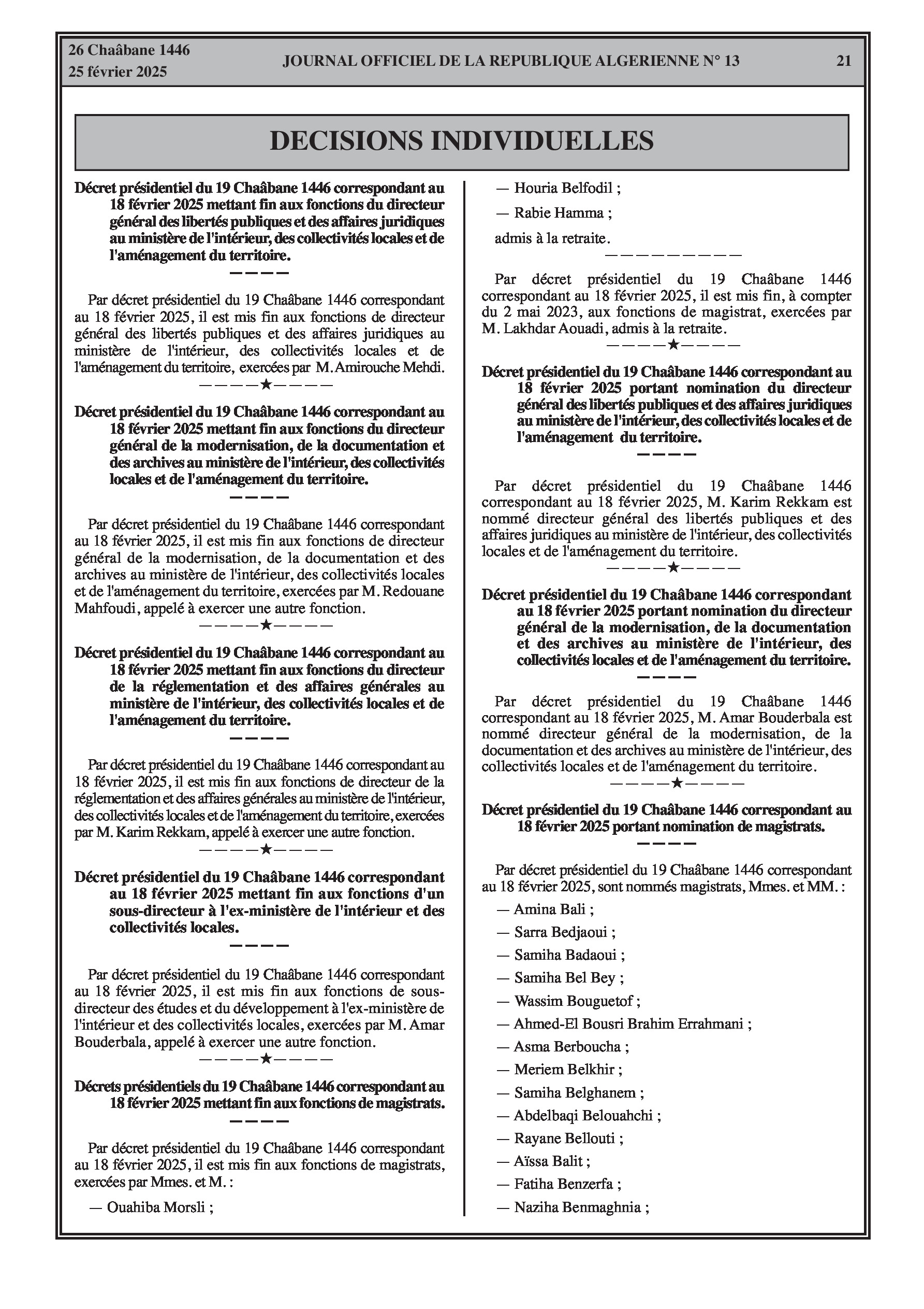 Décrets présidentiels du 18 février 2025 concernant des fins de fonctions et nominations de hauts fonctionnaires au ministère de l'Intérieur, des Collectivités locales et de l'Aménagement du territoire (directeurs généraux, directeur, sous-directeur), des fins de fonctions de magistrats (pour admission à la retraite) et nominations de nouveaux magistrats, la nomination d'un membre au conseil de l'Autorité de régulation de la poste et des communications électroniques, et la nomination d'une sous-directrice du budget et de la comptabilité au rectorat de Djamaâ El Djazaïr.