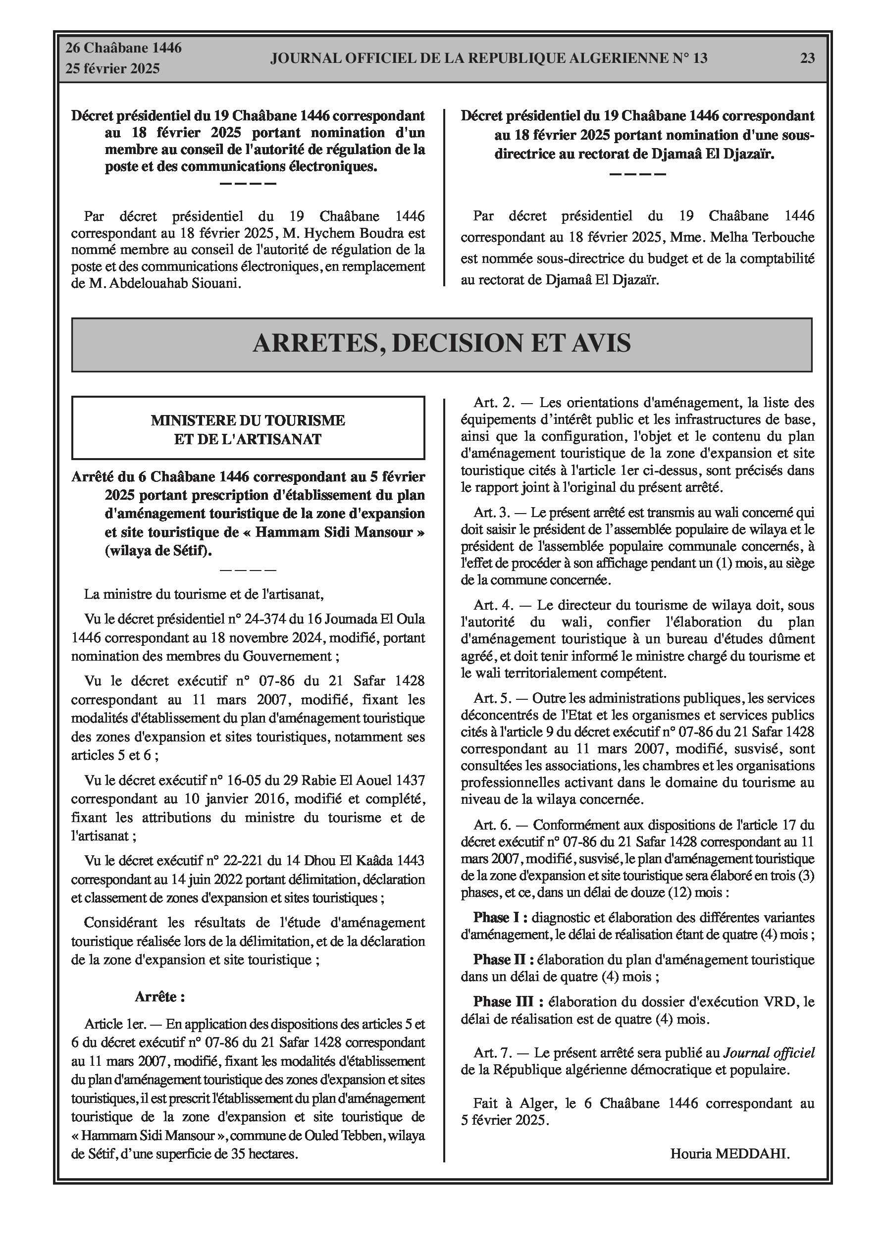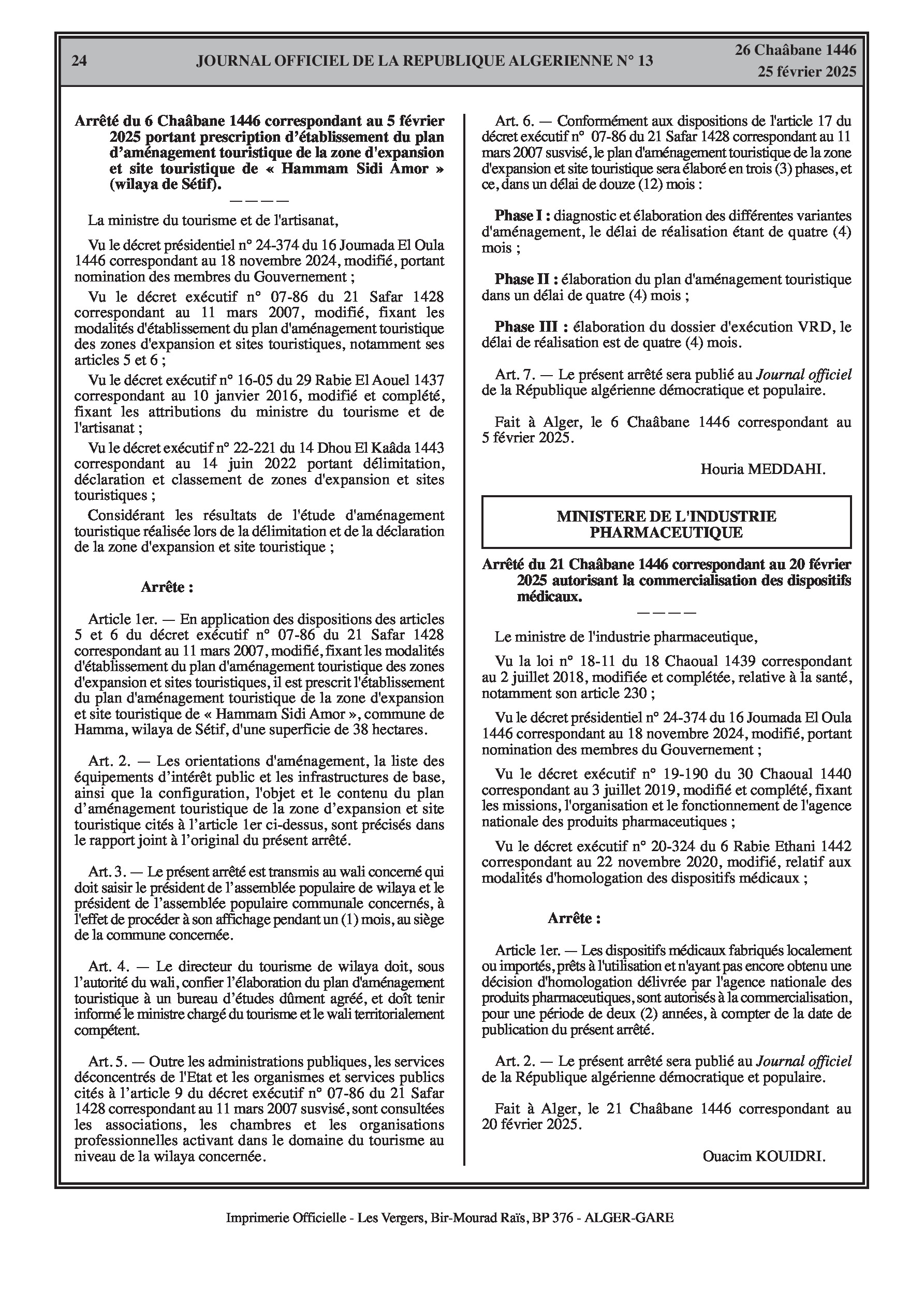 Deux arrêtés du ministère du Tourisme et de l'Artisanat du 5 février 2025 portant prescription d'établissement des plans d'aménagement touristique des zones d'expansion et sites touristiques « Hammam Sidi Mansour » (35 hectares) et « Hammam Sidi Amor » (38 hectares) (wilaya de Sétif), détaillant leur procédure d'élaboration en trois phases sur 12 mois. Un arrêté du ministère de l'Industrie Pharmaceutique du 20 février 2025 autorisant la commercialisation des dispositifs médicaux (fabriqués localement ou importés) n'ayant pas encore obtenu de décision d'homologation, pour une durée de deux ans.