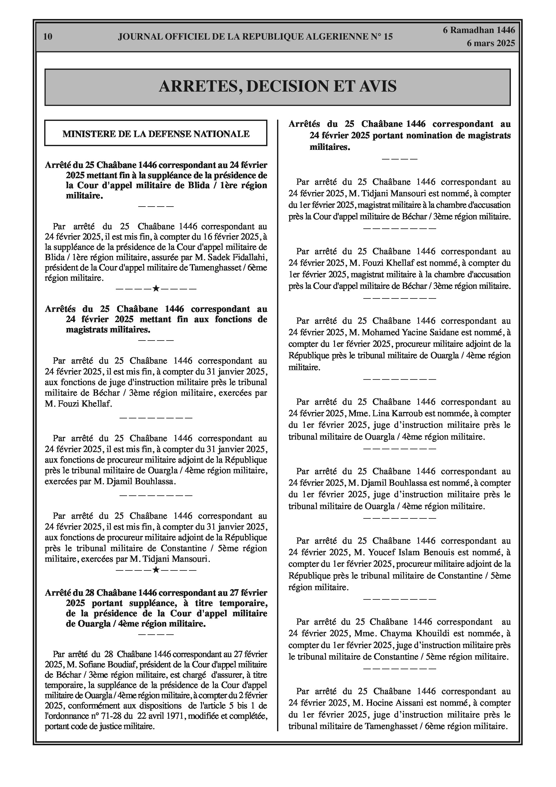 Suppléance temporaire à la présidence de la Cour d'appel militaire de Ouargla.