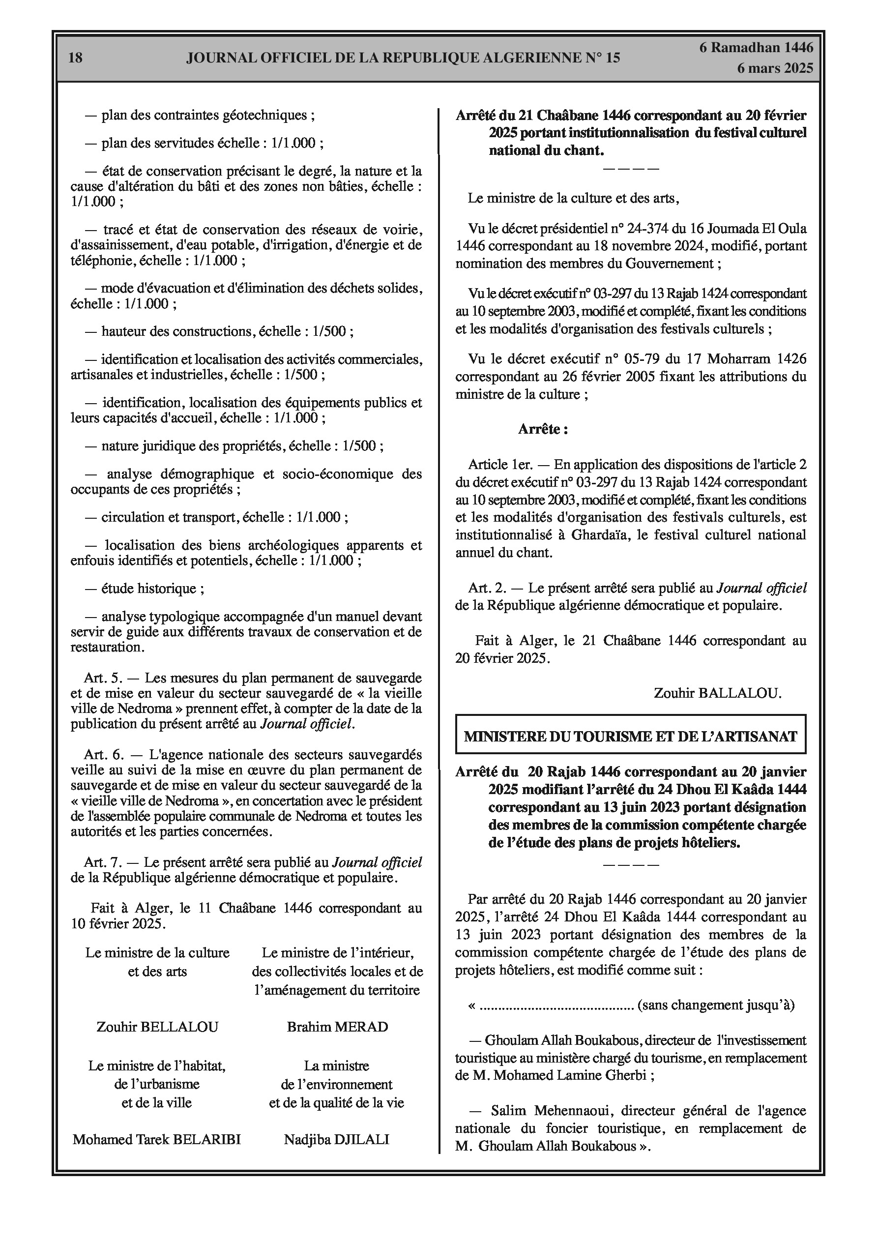 Arrêté ministériel institutionnalisant le festival culturel national annuel du chant, qui se tiendra à Ghardaïa.